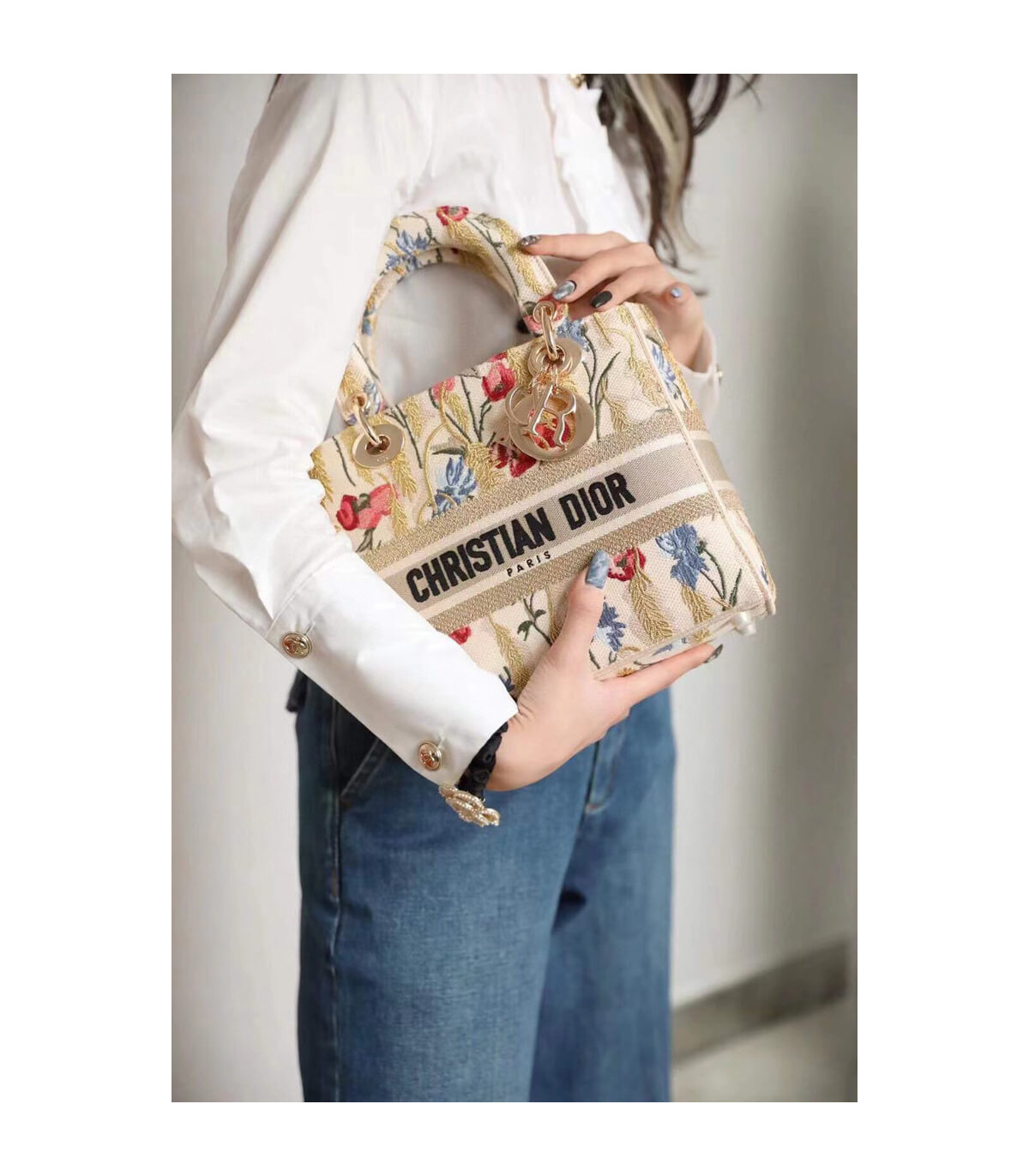 Dior Medium Lady D-Lite Bag Beige Multicolor Hibiscus Metallic Thread Embroidery