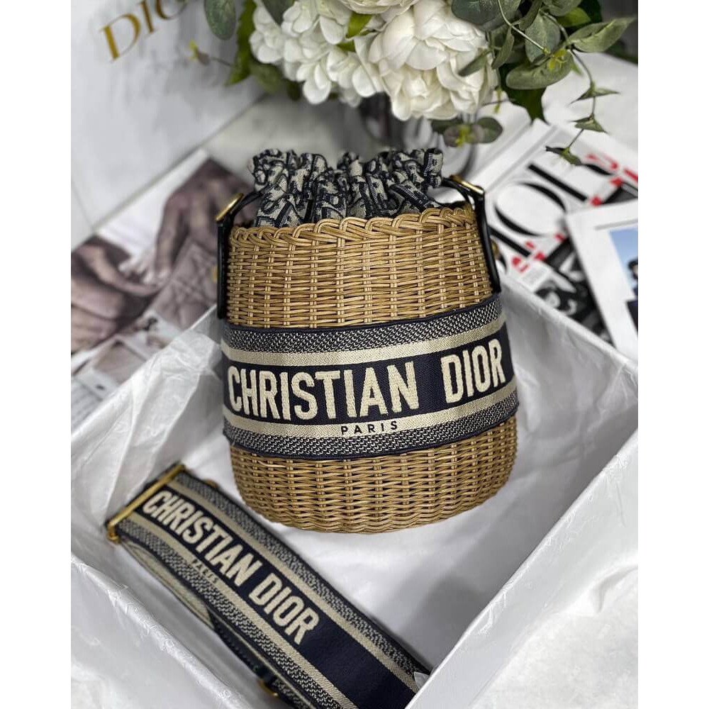 Christian Dior Wicker Basket Shoulder Bag Blue Oblique