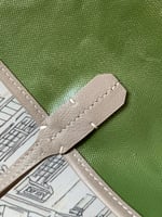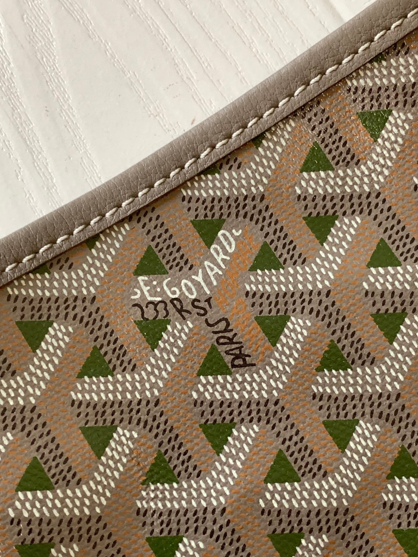 Material: This St. Louis PM tote is in Greige and Green Goyardine canvas with palladium hardware and features greige leather handles and trim, removable pouch and white stitching.