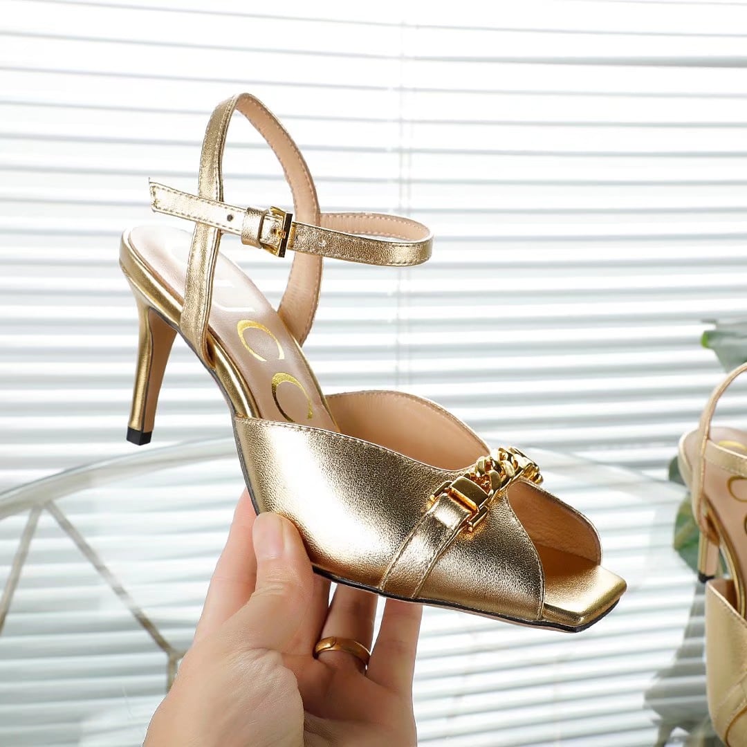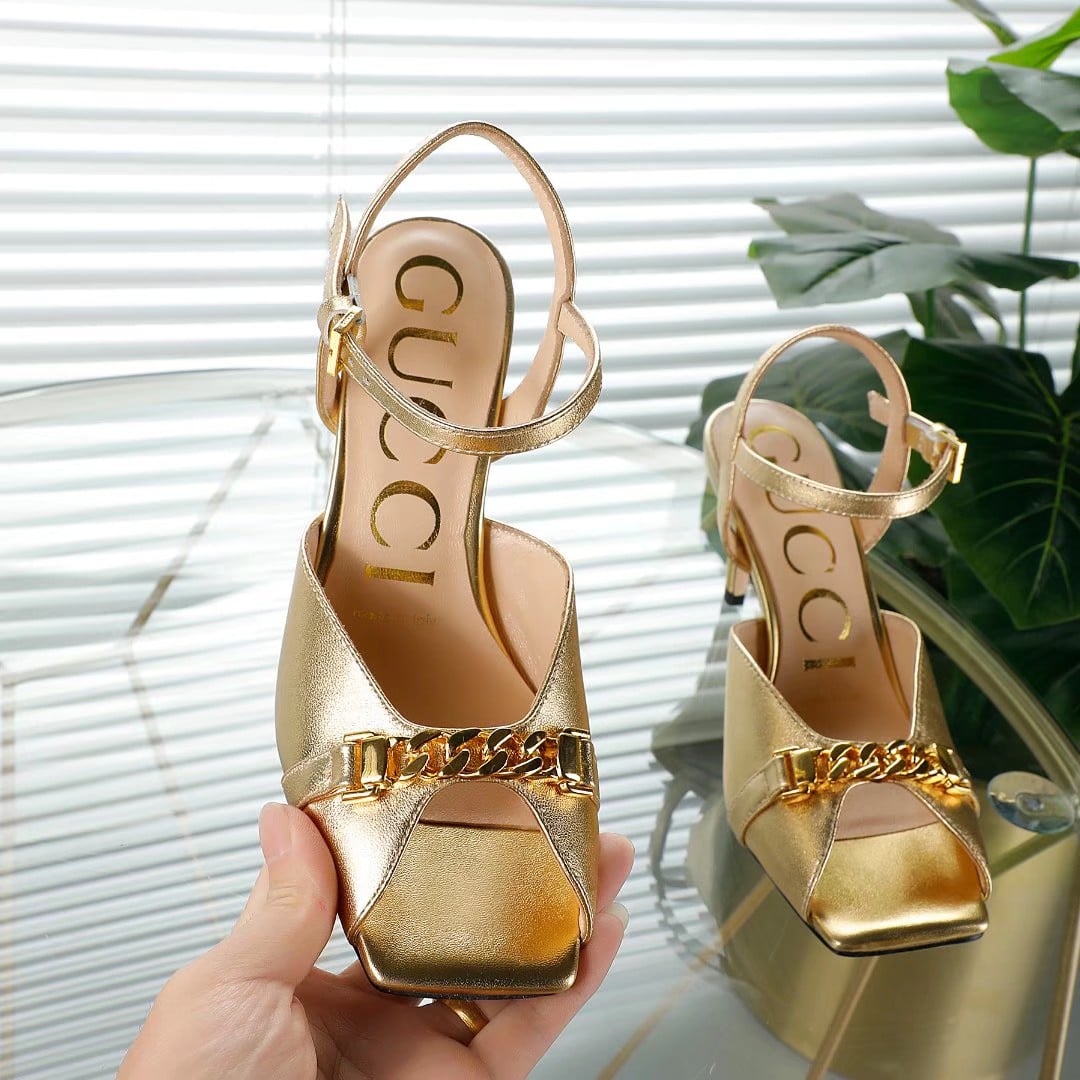 Gucci Metal Chain Stiletto Heels Flip Flop Fish Mouth Sandals Gold