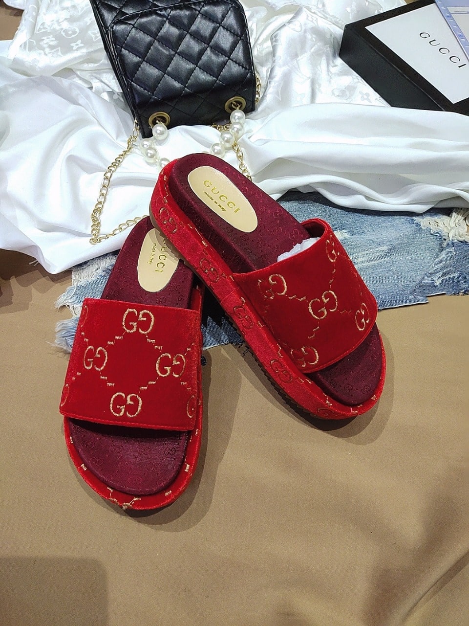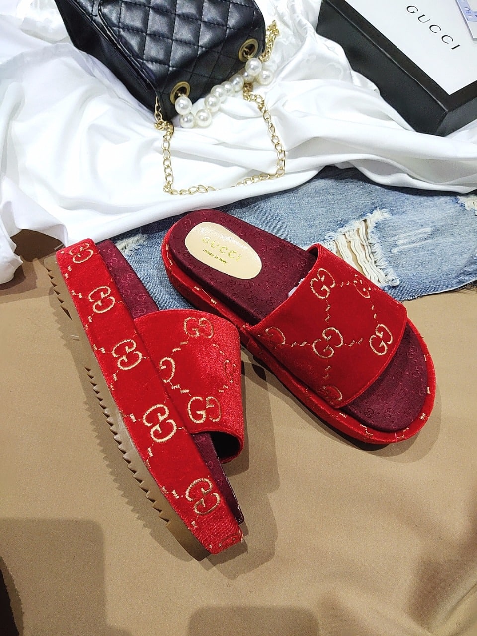 Gucci Women?S With Gg Pattern Slide Sandal Red