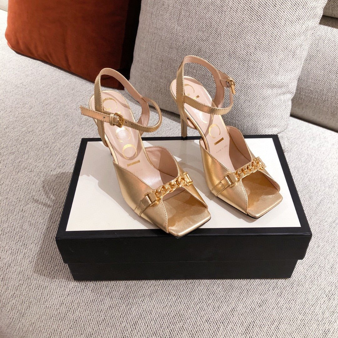 Gucci Ankle Buckle Strap Sylvie Chain Sandals In Gold