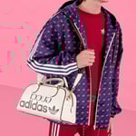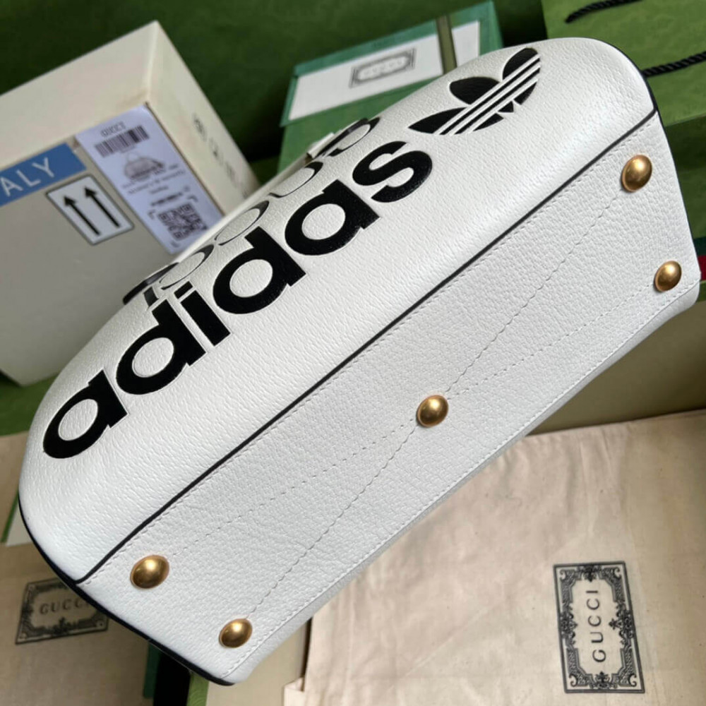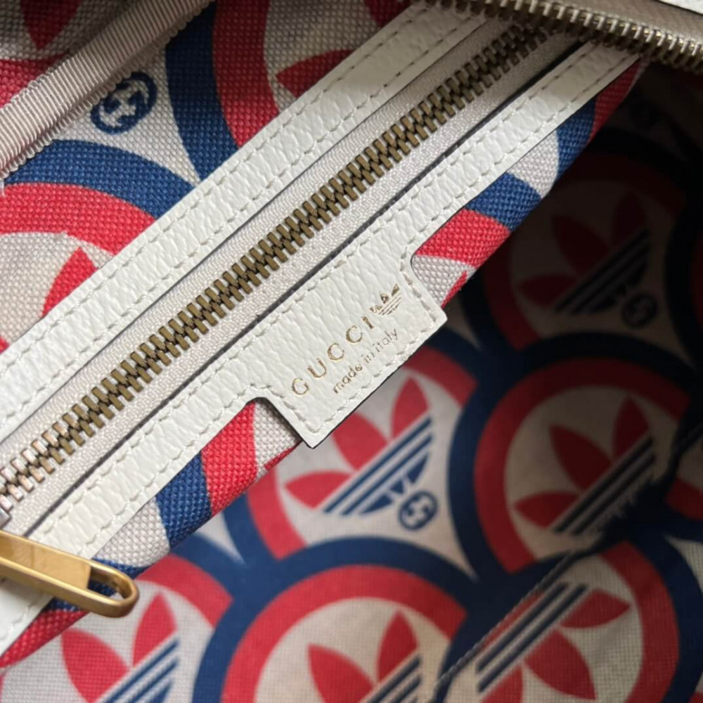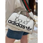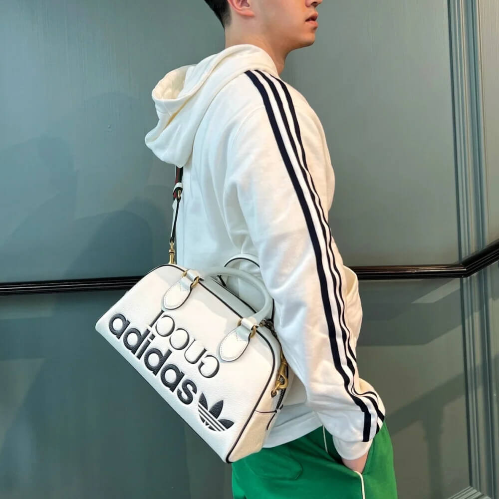 Part of the adidas x Gucci collection, this mini duffle bag features the ‘Gucci adidas’ and Trefoil print. adidas and Gucci venture into a collection, where the Web juxtaposes with the three white stripes, and the GG monogram combines with the trefoil. Pulling inspiration from the Creative Director’s memories of the ’80s and ’90s, emblematic House’s motifs mix with those of the historic sportswear brand adidas resulting in a series of hybrid looks.