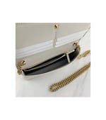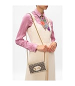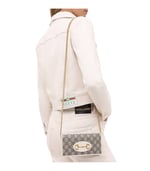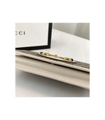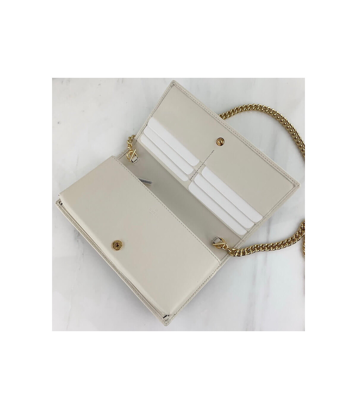 Part of the Gucci 1955 Horsebit accessories collection, this elegant chain wallet is crafted from the House’s signature beige/ebony GG Supreme canvas―an eco-conscious material with a timeless appeal. The iconic Horsebit detail, inspired by the House’s equestrian heritage, anchors the design, while white leather trim adds a fresh contrast.