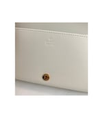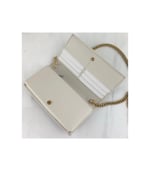 Featuring a folded, snap-button silhouette, the compact style opens to reveal a thoughtfully organized interior with card slots and pockets. A detachable gold-toned chain strap completes the versatile design.
