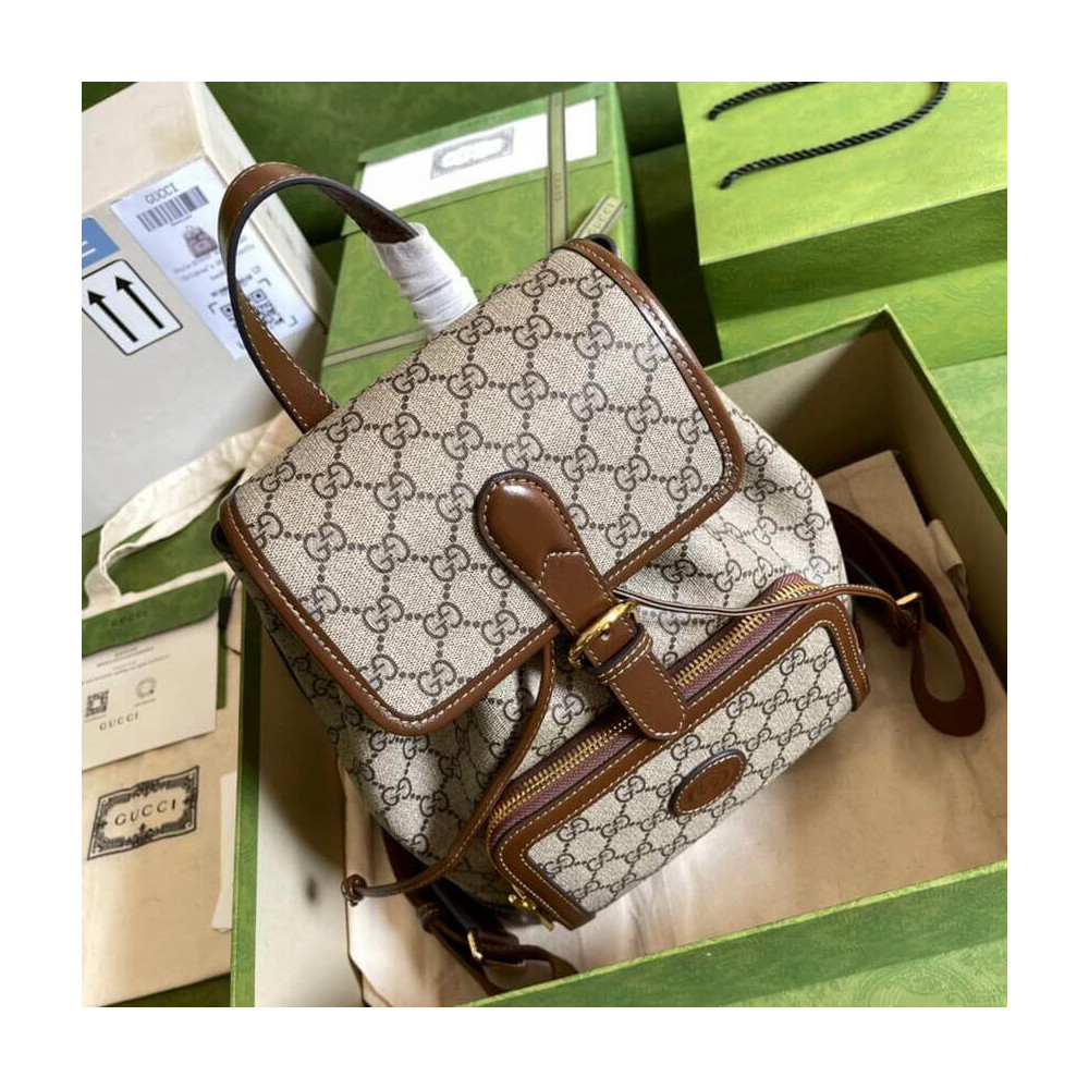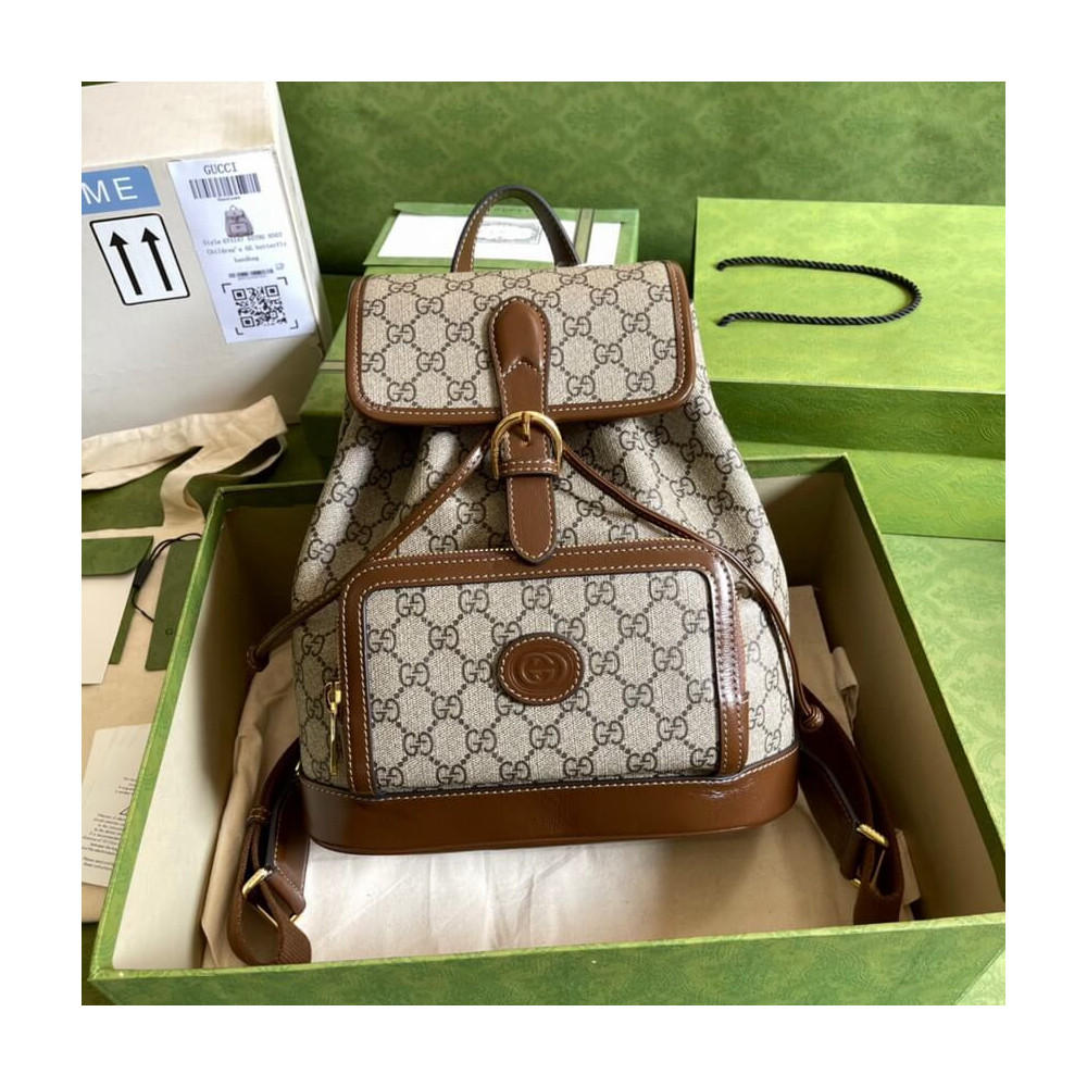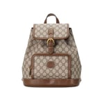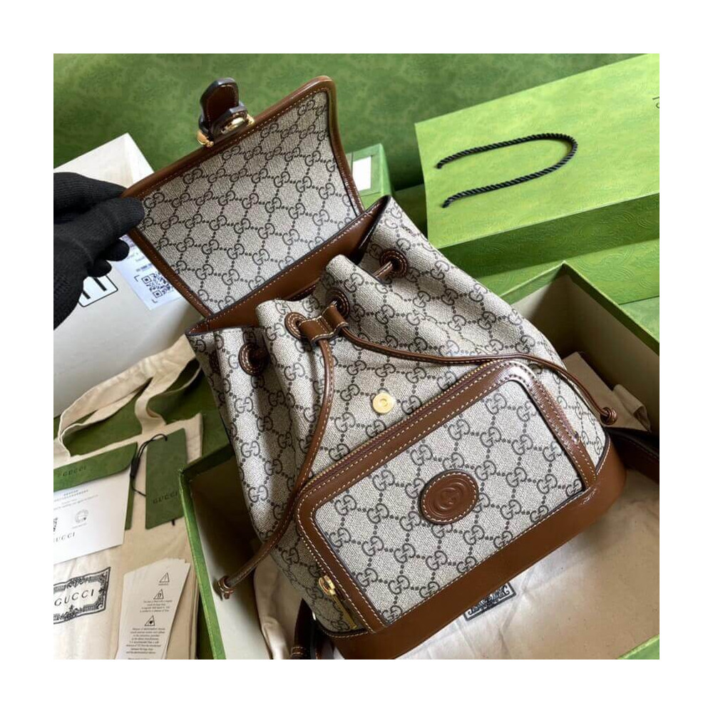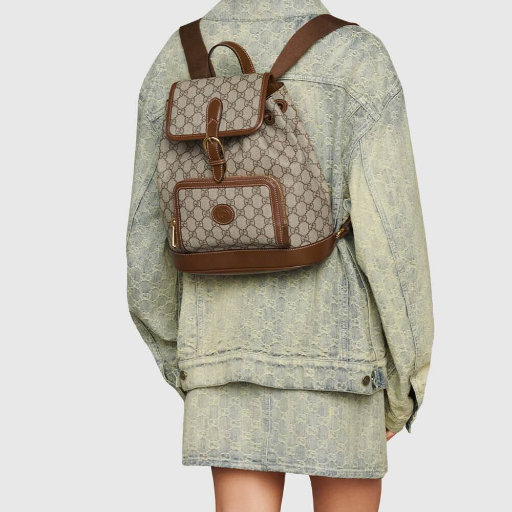 Materials, colors and House codes come together to infuse styles with a vintage feel. Here, this backpack is crafted from beige and ebony GG Supreme canvas with a brown leather trim. The style is completed by one of Gucci’s most historic codes―the Interlocking G.