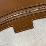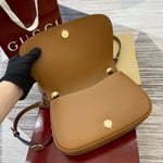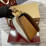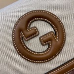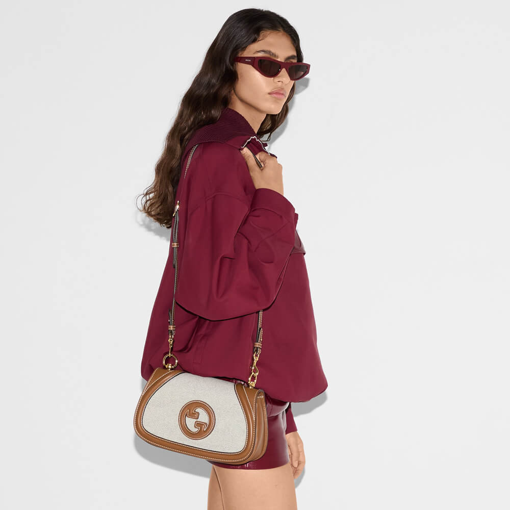 The new Gucci Blondie bag, whose distinctive logo first appeared in the House’s collections in the early 1970s, weaves together past and present in a fusion of nostalgia and modernity. Presented in fresh beige cotton linen canvas and smooth brown leather trim, this small bag is complete with a top handle and adjustable shoulder strap.
