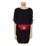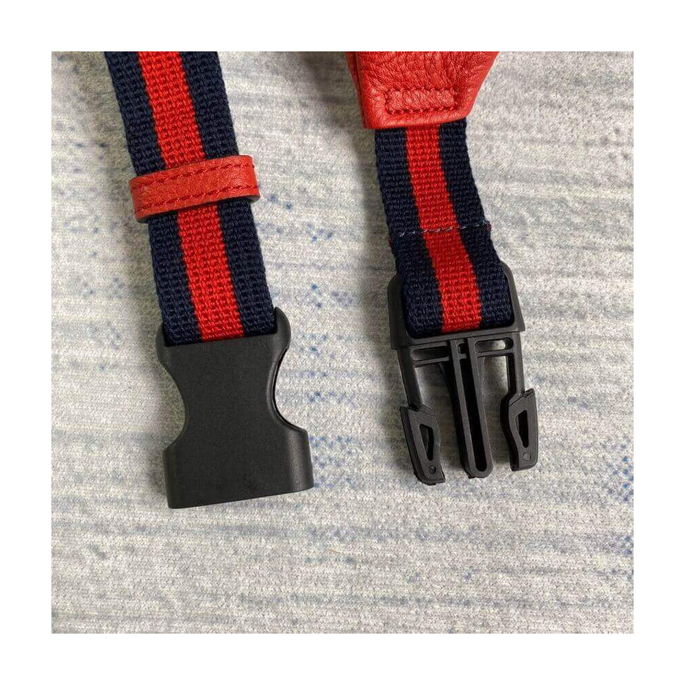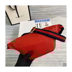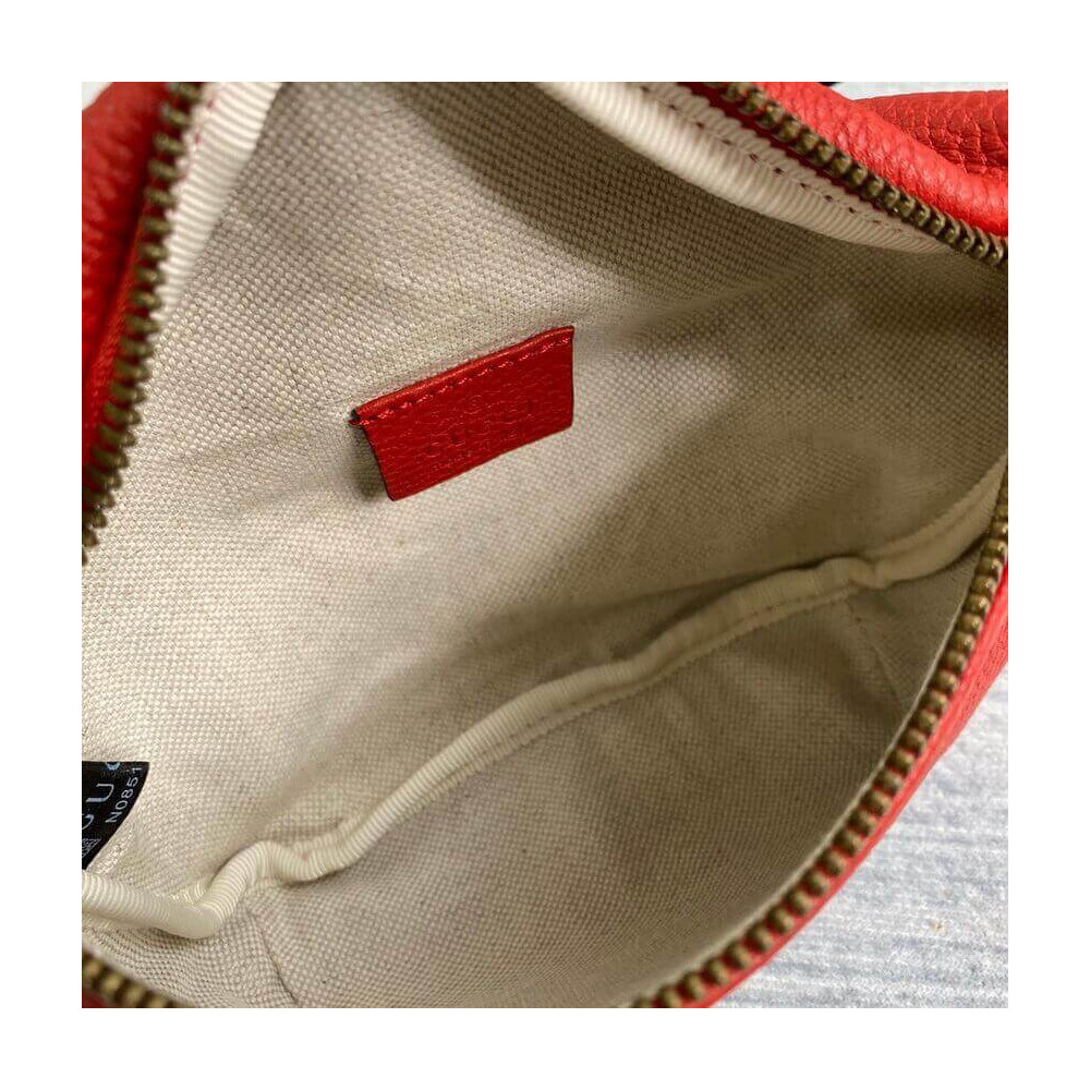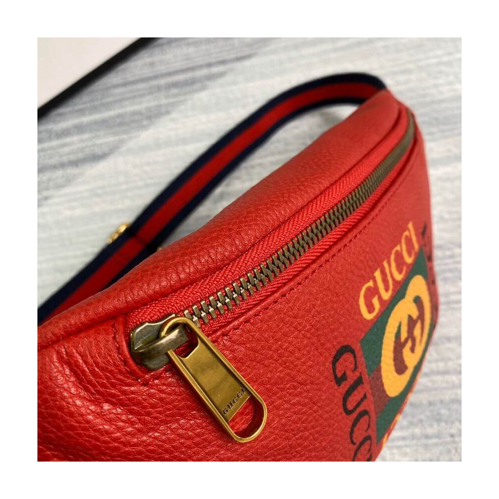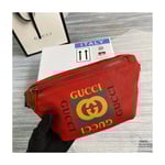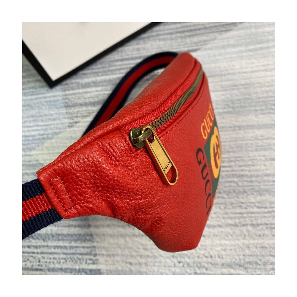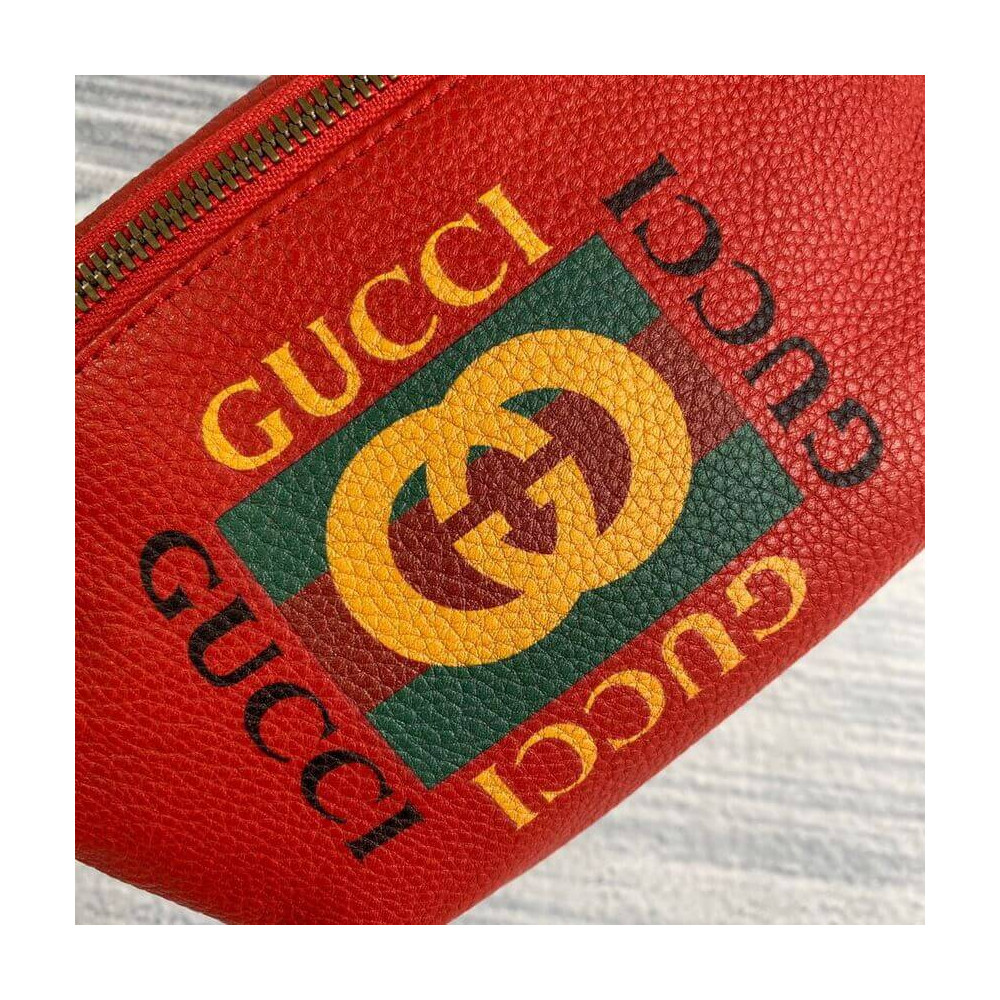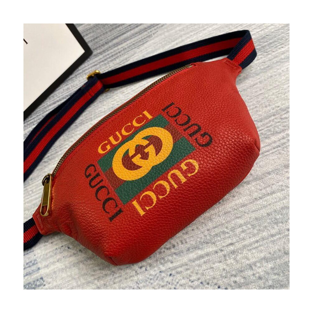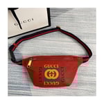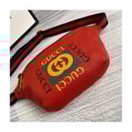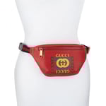 Red belt bag from Gucci. made of leather. Fastened with zip. Enriched by printed yellow and black brand’s logo and signature green-red-green ‘Web’ stripe. Adjustable waist belt ends with a buckle. Beige, lined interior has 1 compartment.