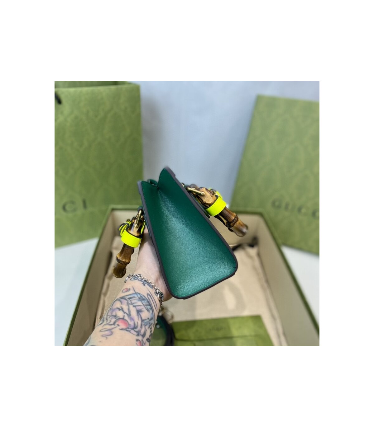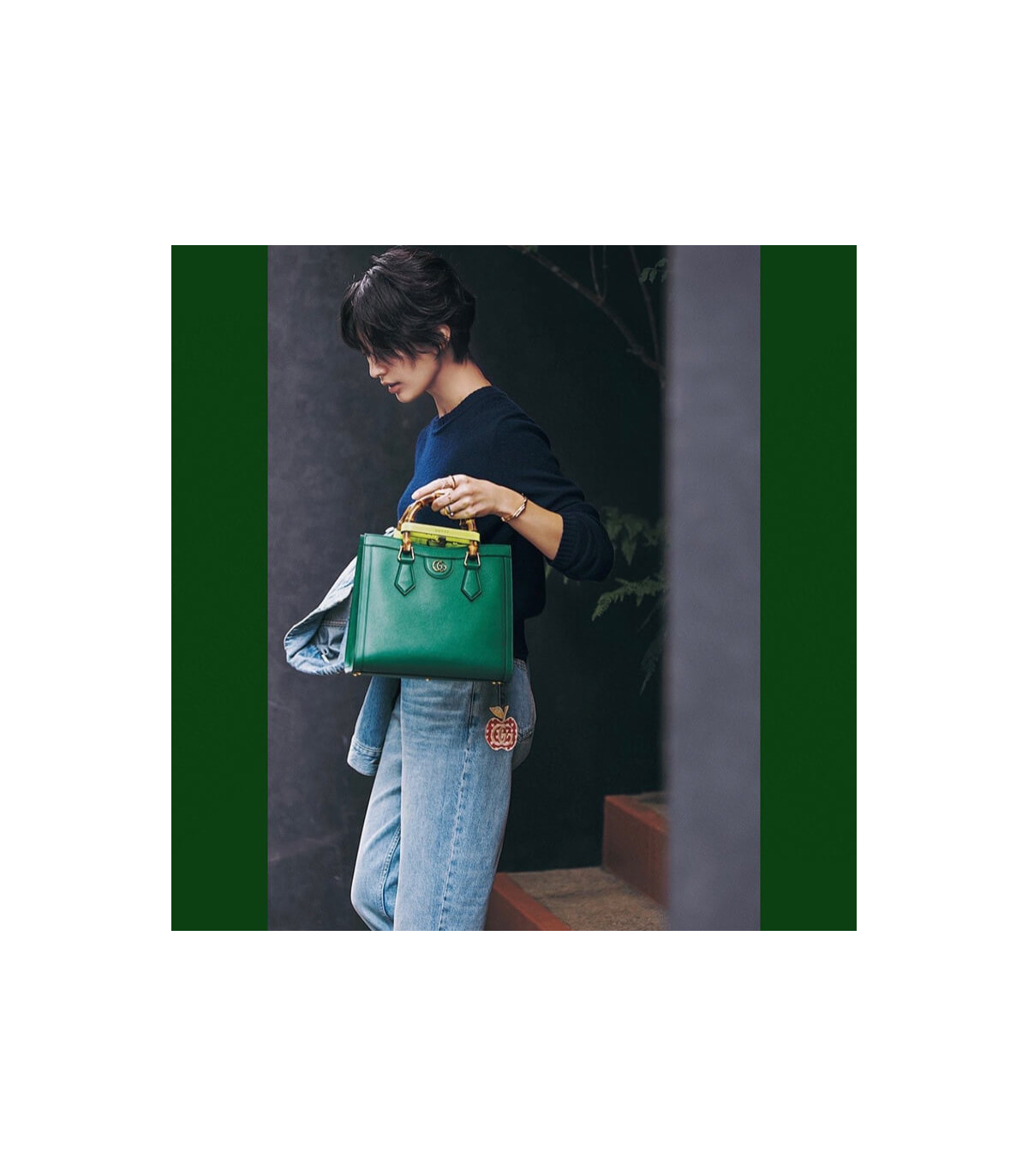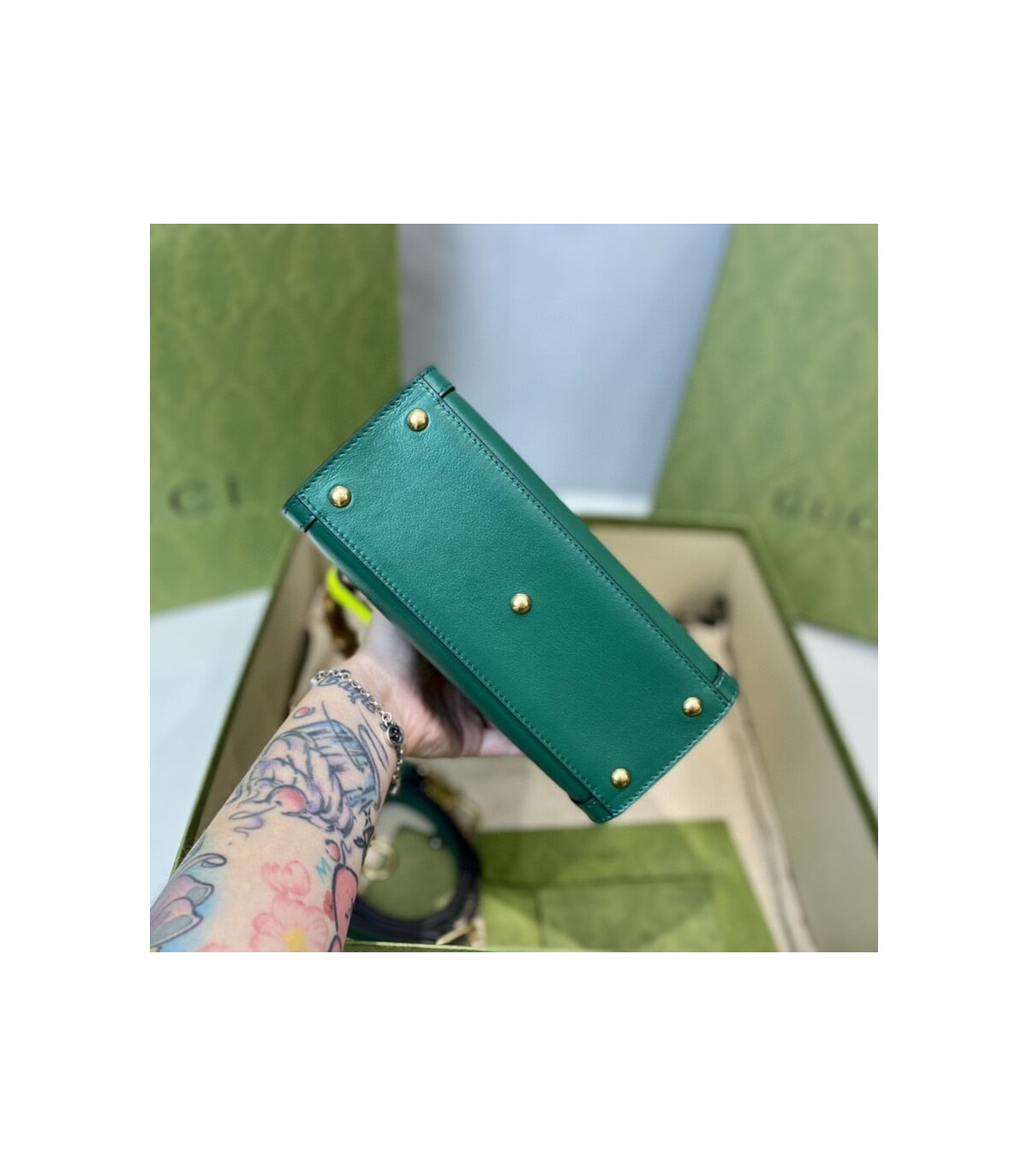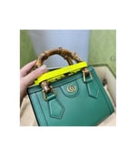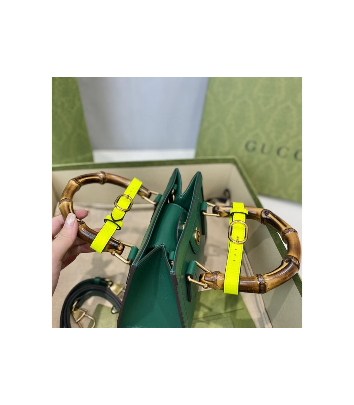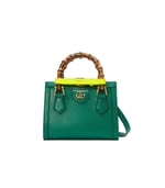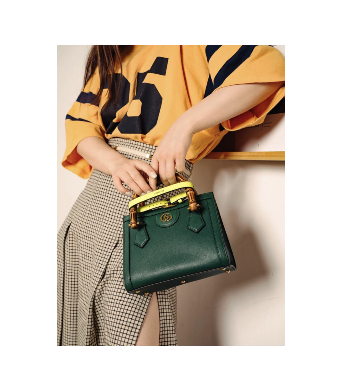 Combining recognizable elements of the House, the mini tote bag is defined by its bamboo handles and Double G hardware. Crafted from light blue leather, the accessory is further accentuated by two neon bands, a playful reference to the bands used to keep handles in shape.