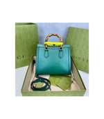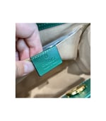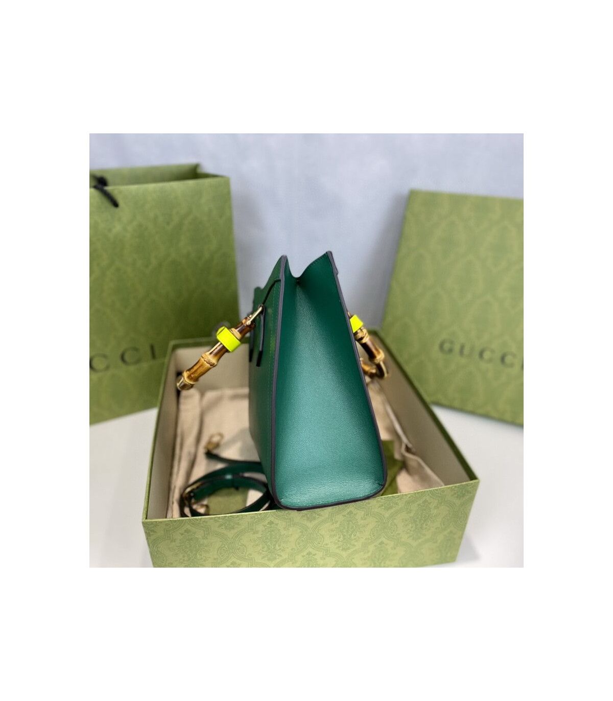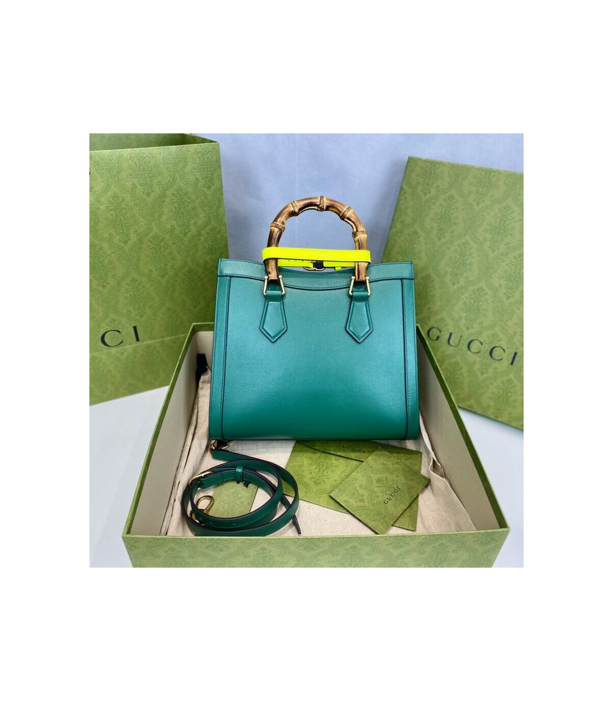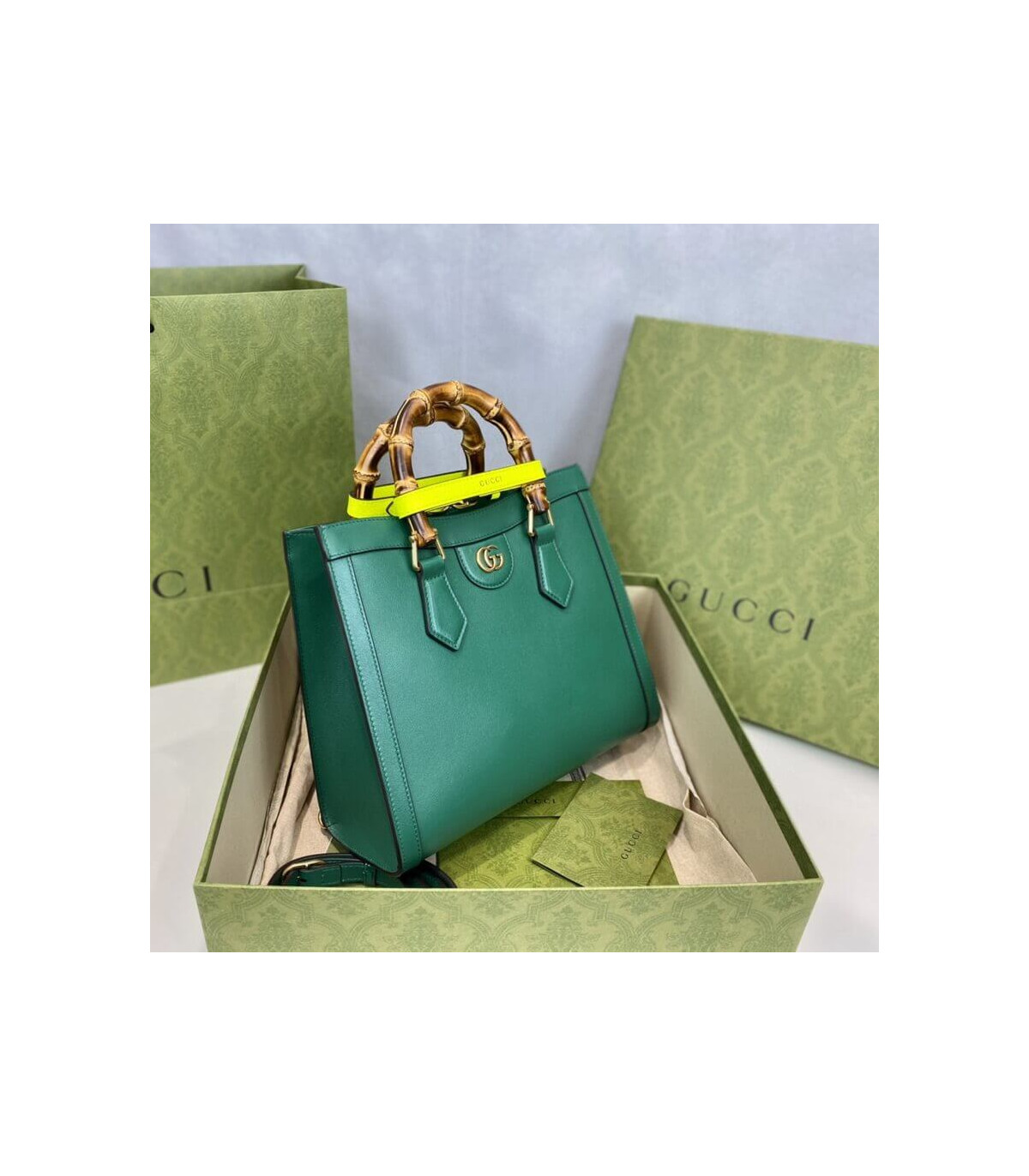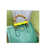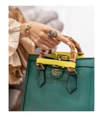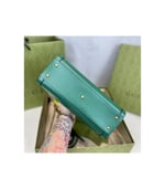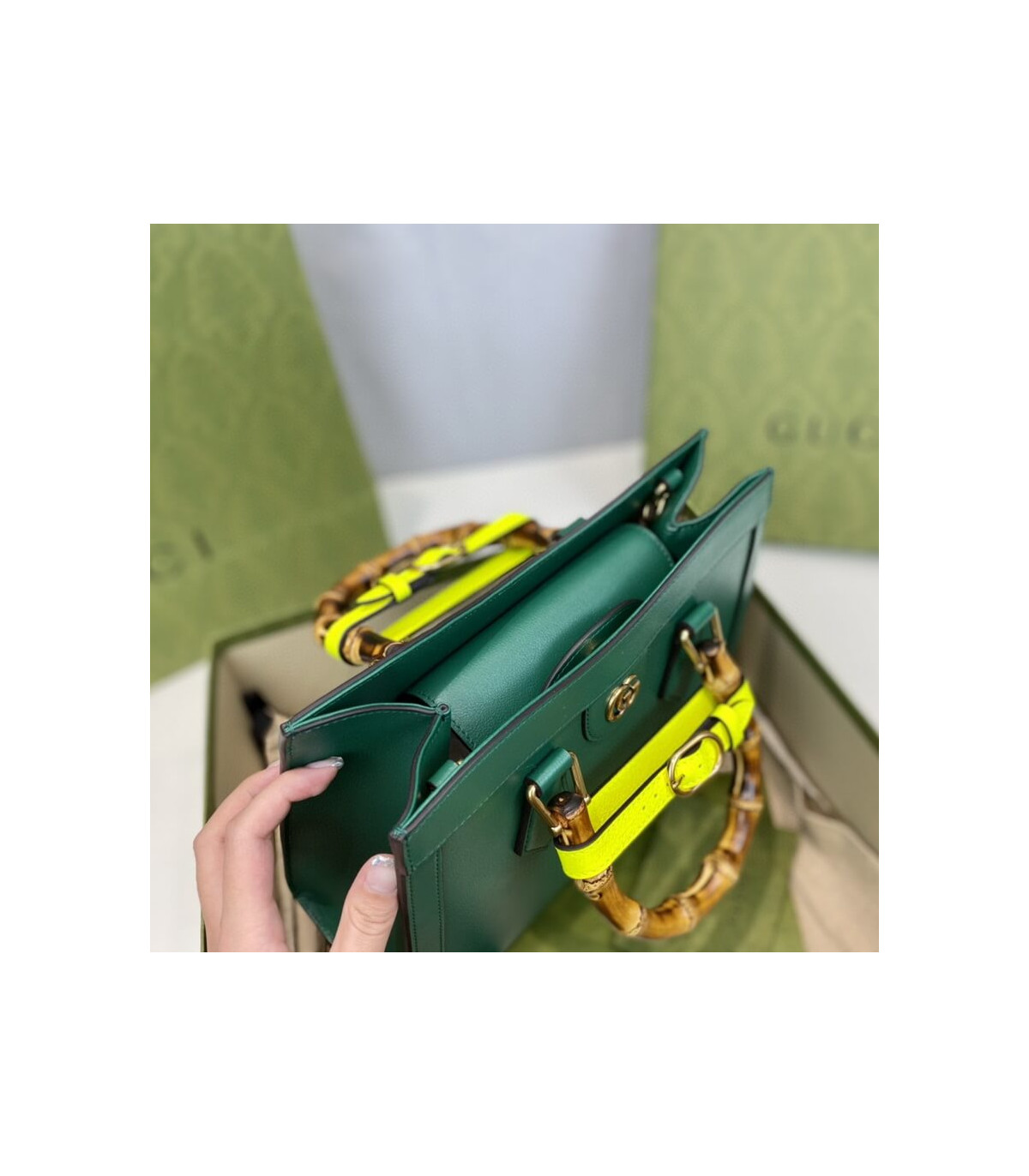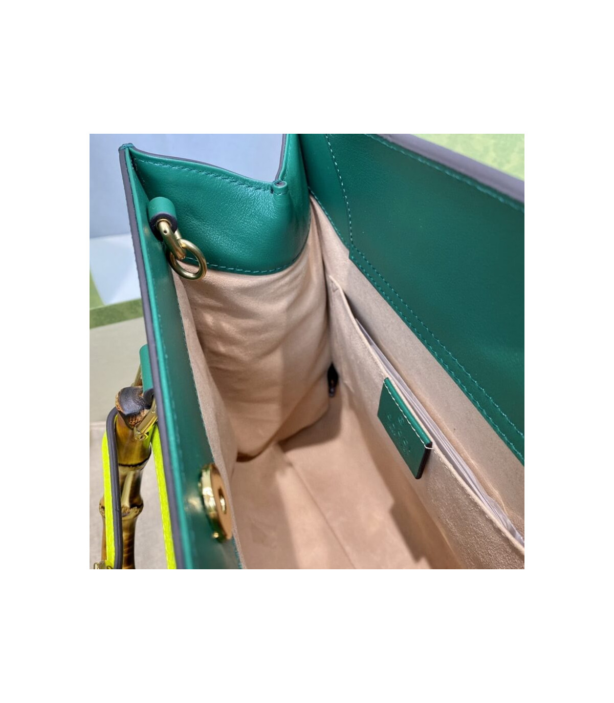 Combining recognizable elements of the House, the small tote bag is defined by its bamboo handles and Double G hardware. Crafted from black leather, the accessory is further accentuated by two neon bands, a playful reference to the bands used to keep handles in shape.