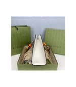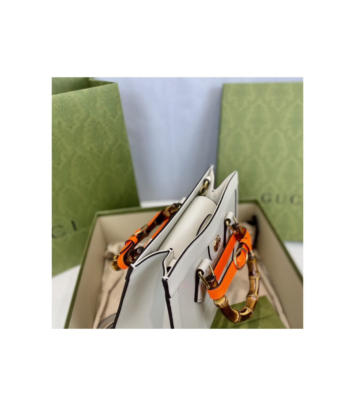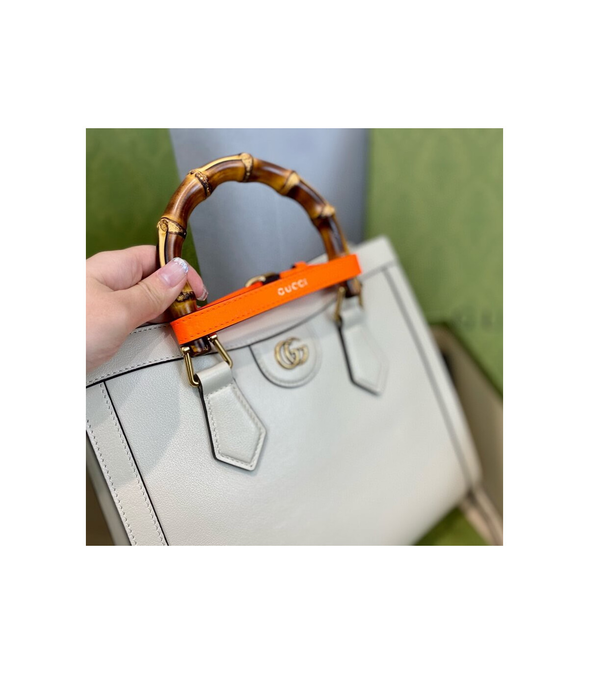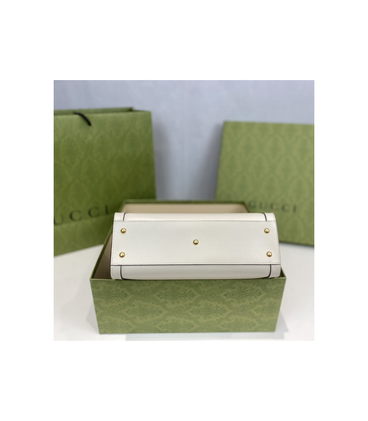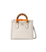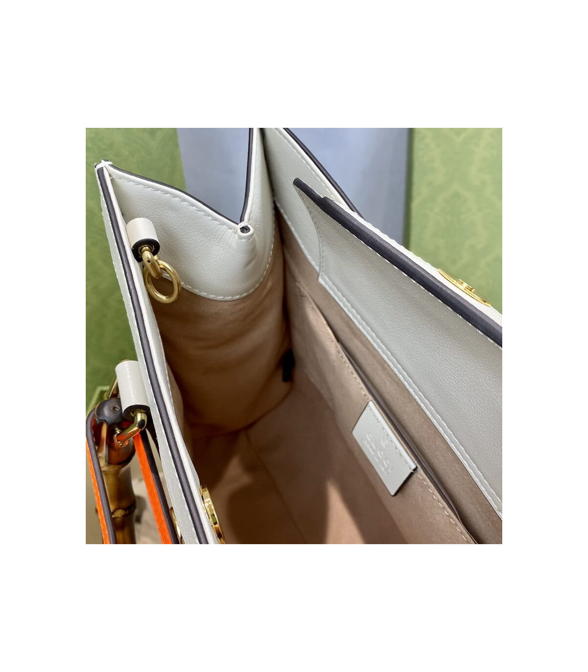 Combining recognizable elements of the House, the small tote bag is defined by its bamboo handles and Double G hardware. Crafted from black leather, the accessory is further accentuated by two neon bands, a playful reference to the bands used to keep handles in shape.