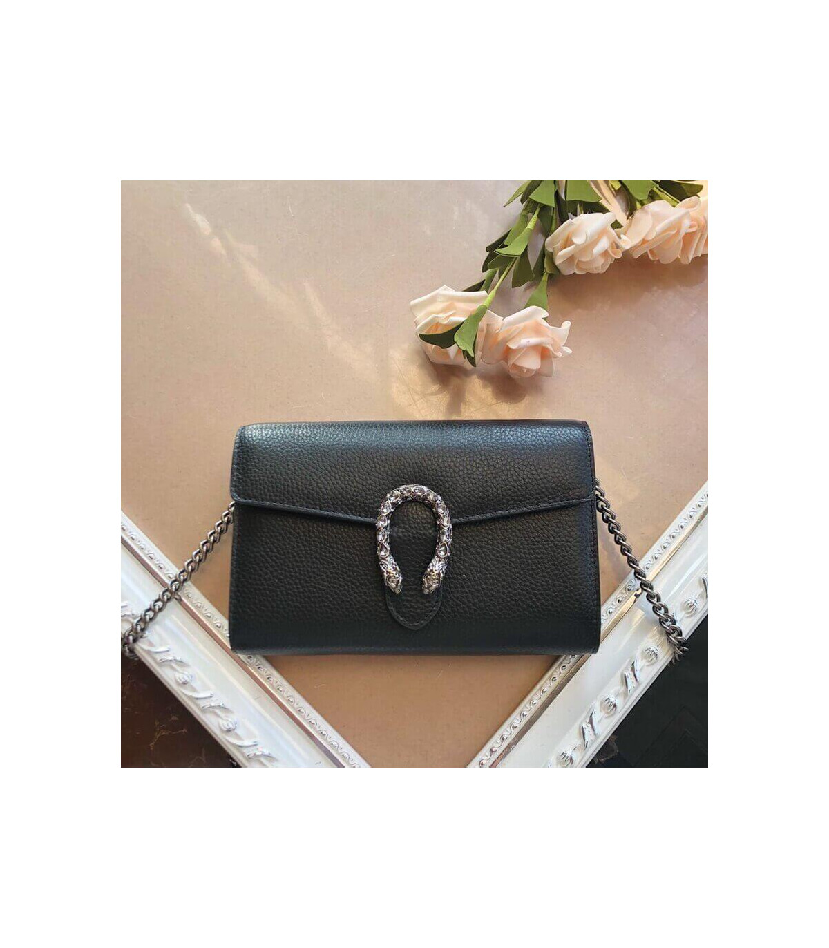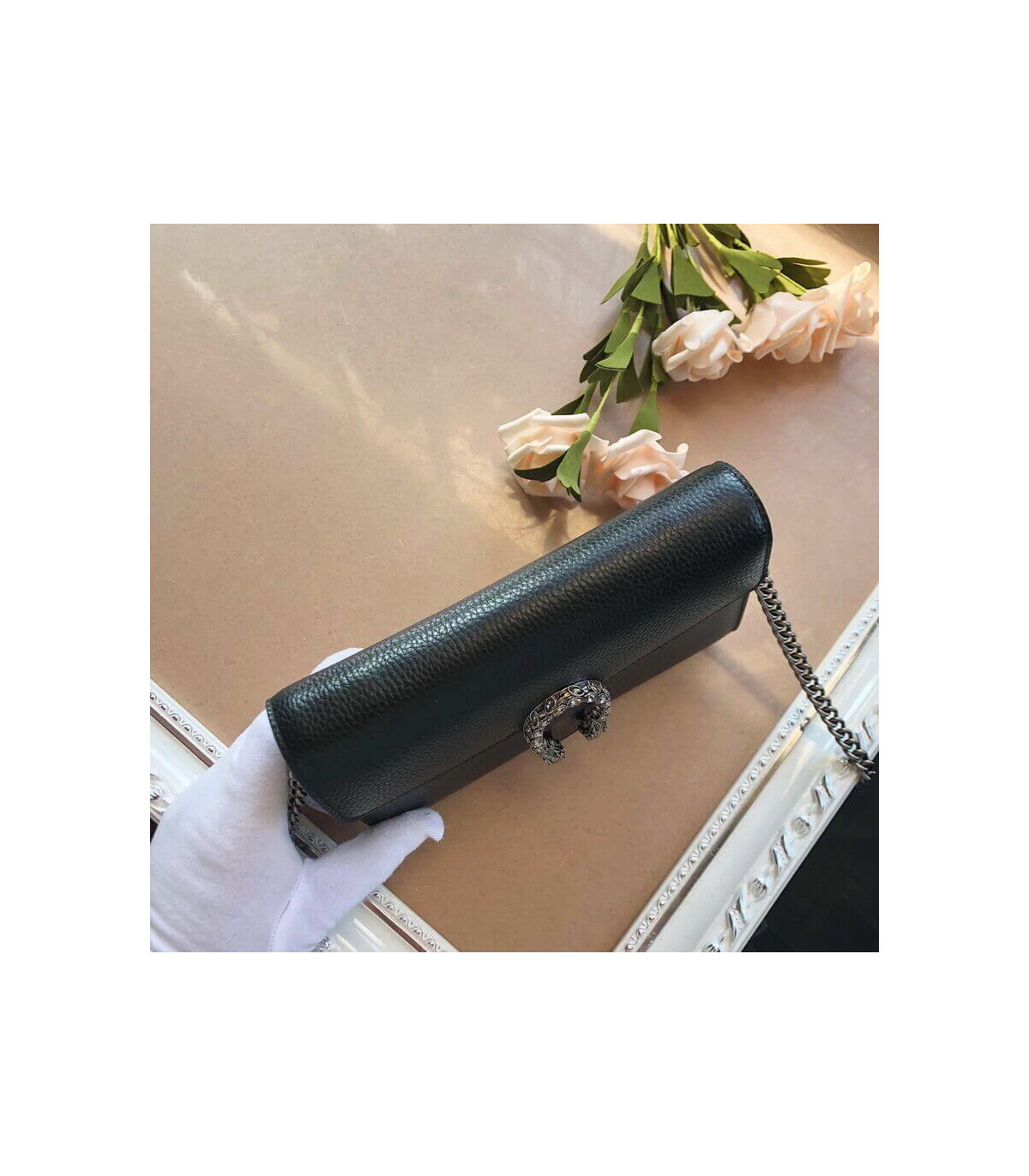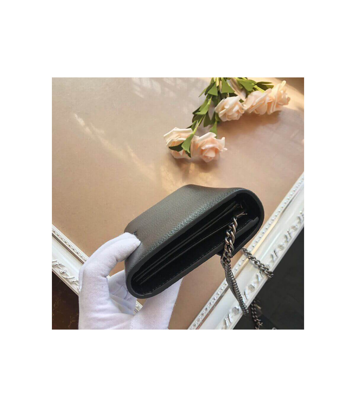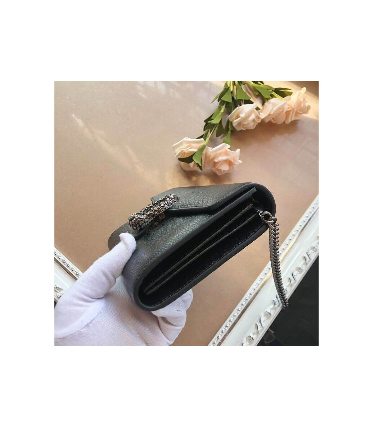 A structured leather chain mini bag or wallet with textured tiger head spur closure-a unique detail referencing the Greek god Dionysus, who in myth is said to have crossed the river Tigris on a tiger sent to him by Zeus. The tiger head closure is enriched with crystal stones. Made in resistant textured leather.