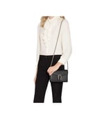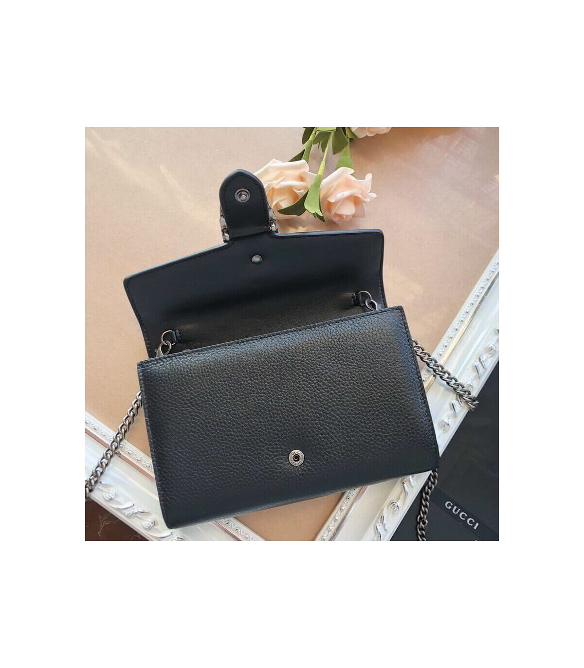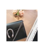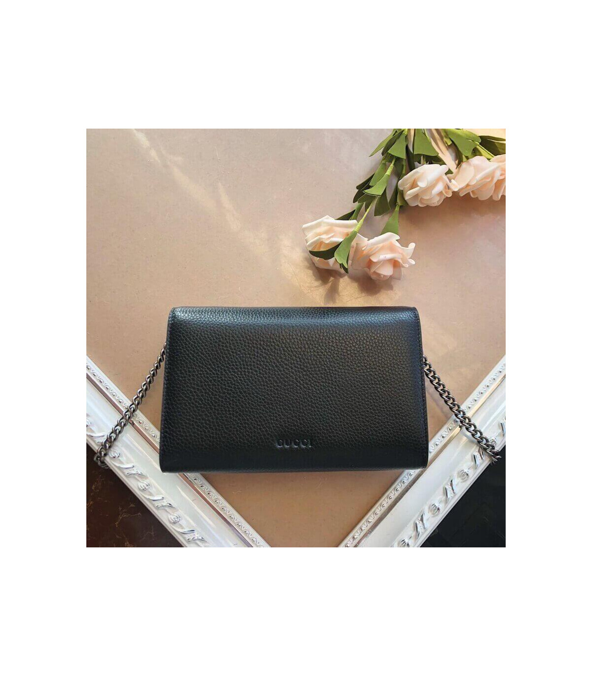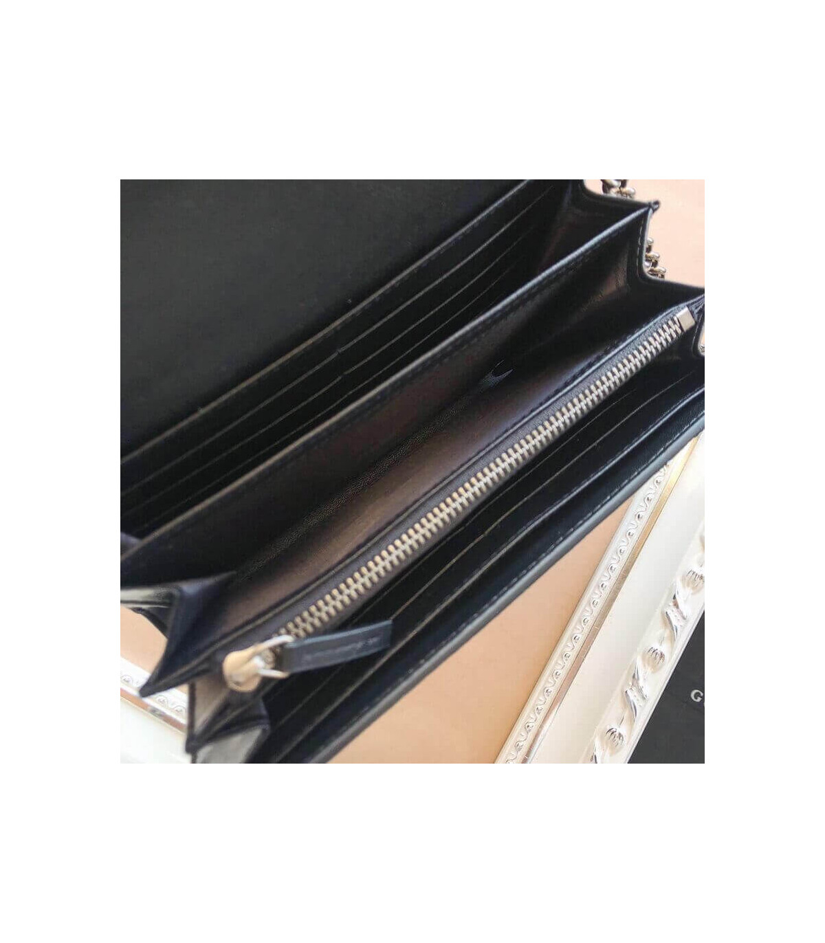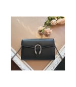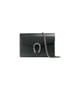 A structured leather chain mini bag or wallet with textured tiger head spur closure-a unique detail referencing the Greek god Dionysus, who in myth is said to have crossed the river Tigris on a tiger sent to him by Zeus. The tiger head closure is enriched with crystal stones. Made in resistant textured leather.