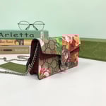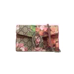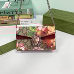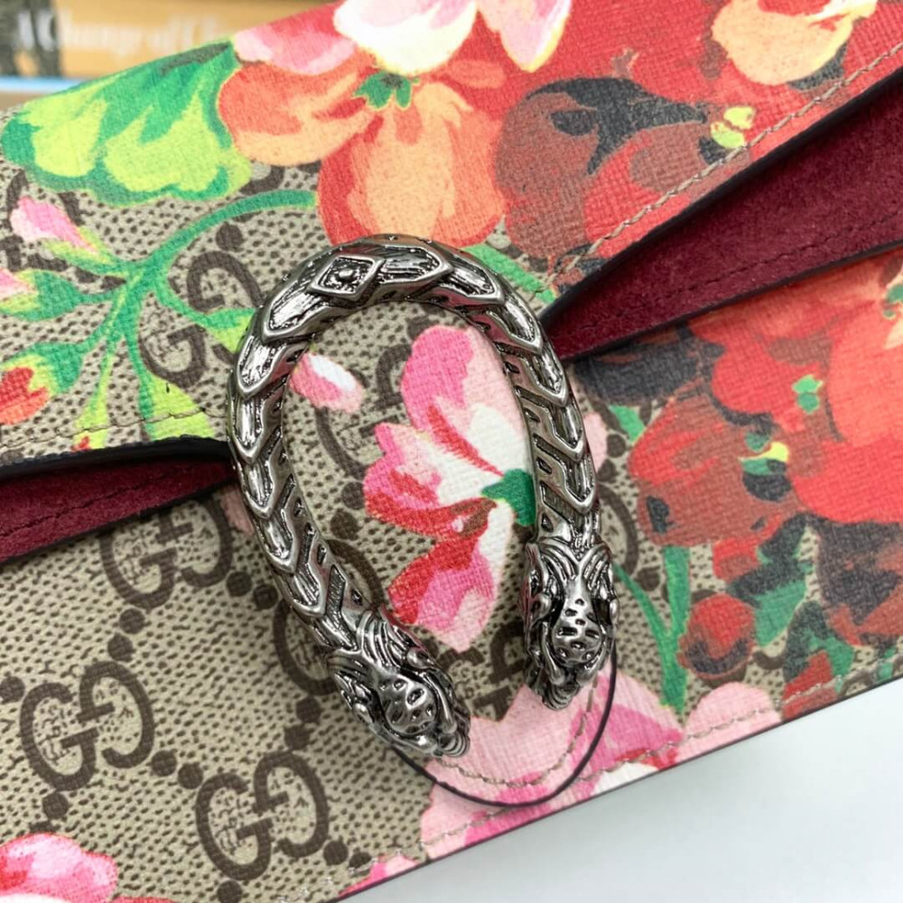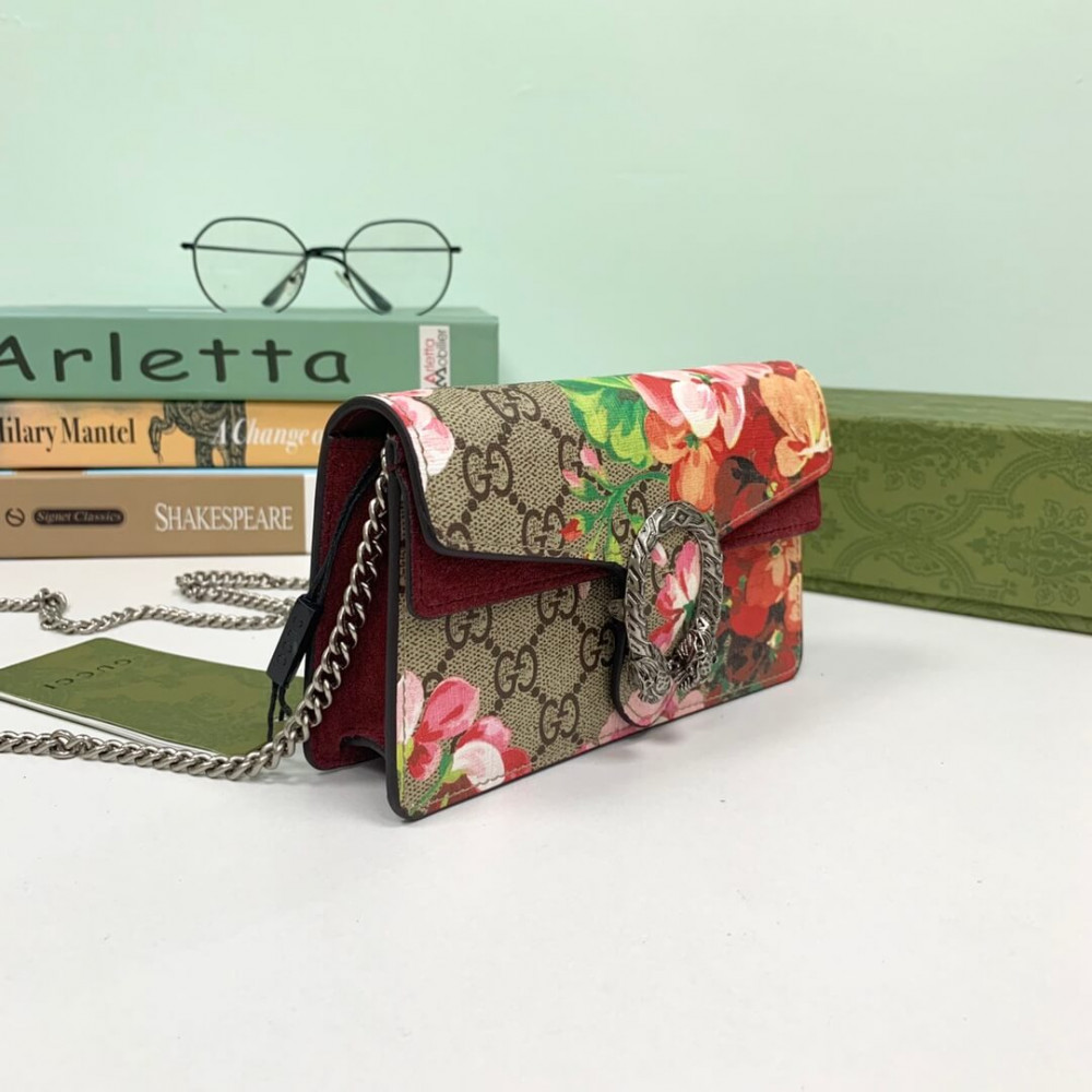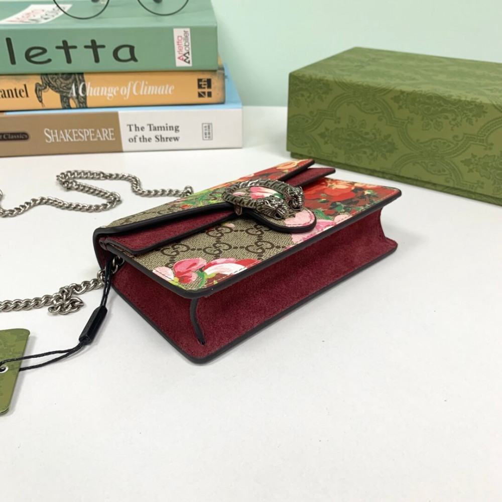A structured Blooms GG Supreme canvas chain super mini bag with a key ring that can be used to attach this bag to a separate larger bag. The closure has the textured tiger head spur closure-a unique detail referencing the Greek god Dionysus, who in myth is said to have crossed the river Tigris on a tiger sent to him by Zeus.