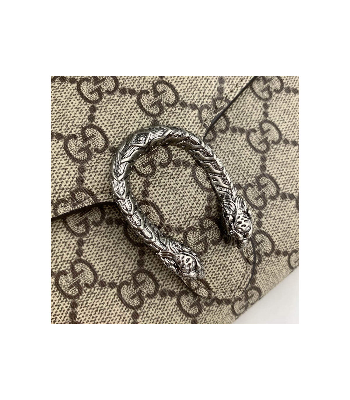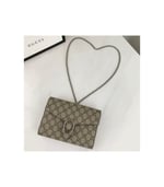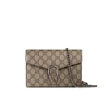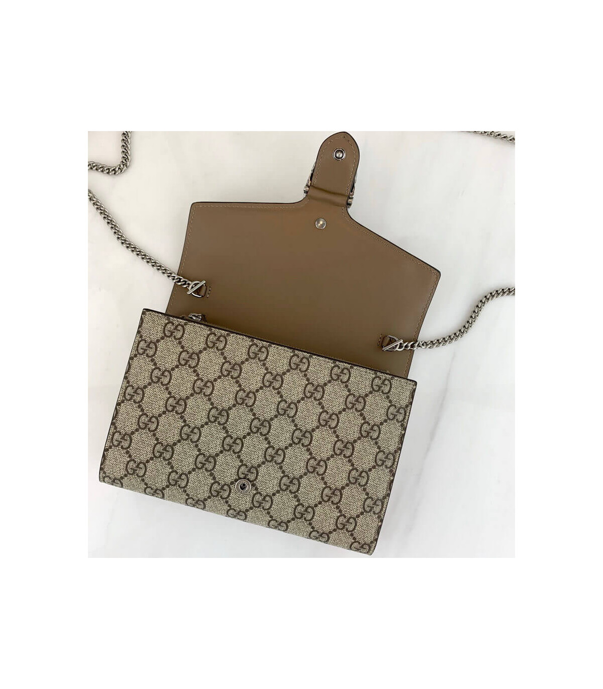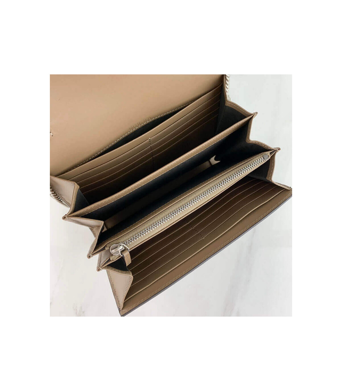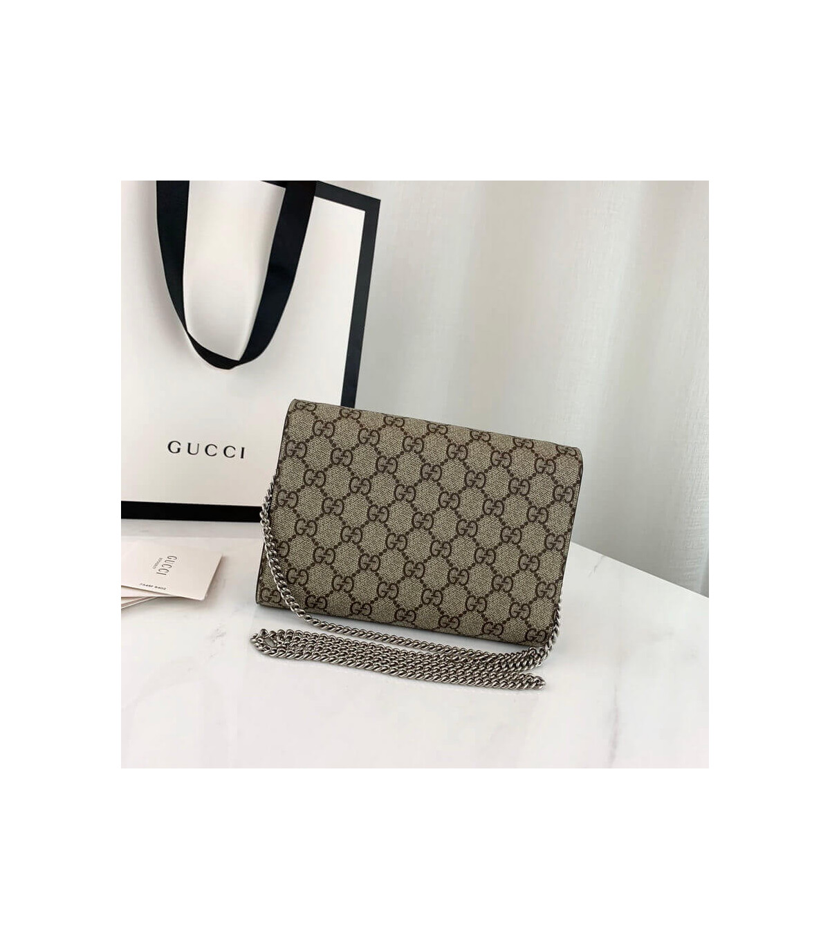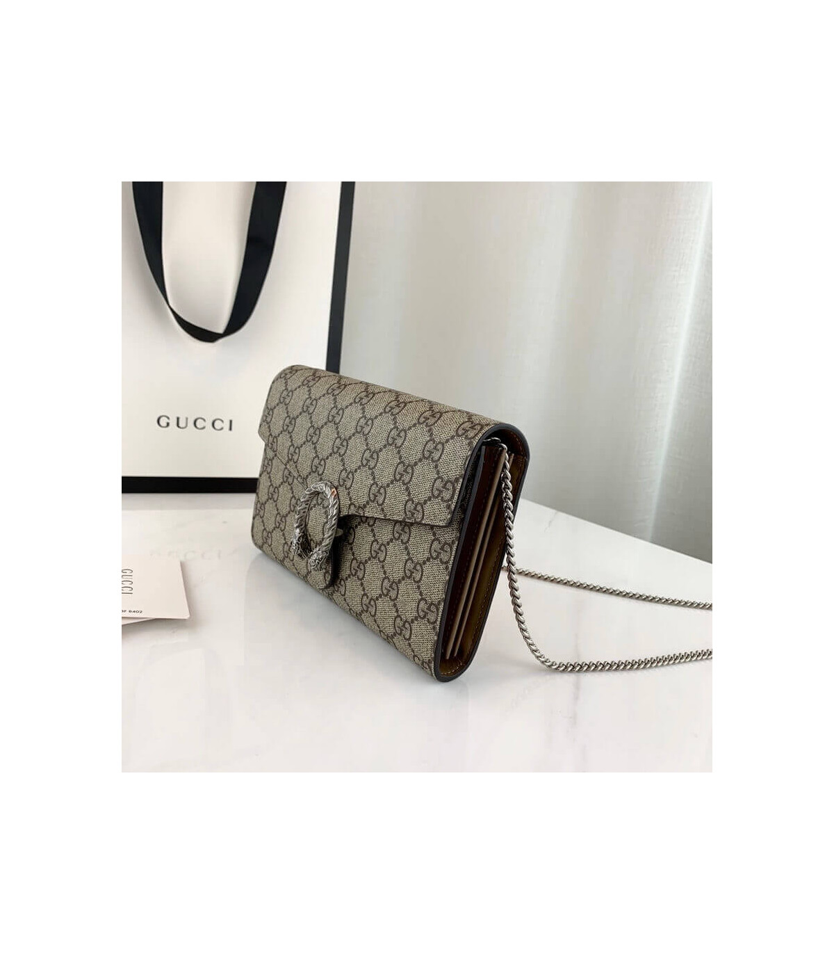 A structured and compact design, this wallet on chain is crafted from beige/ebony GG Supreme canvas with antiqued silver-toned hardware. The signature tiger head spur closure adds iconic flair, while the interior offers ample organization with 16 card slots and multiple compartments. Finished with a taupe leather lining and a detachable chain strap for versatile wear.