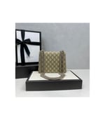 A refined mini bag crafted in beige/ebony GG Supreme canvas with taupe suede trim, featuring the iconic tiger head spur closure. The sliding chain strap offers styling flexibility―wear it as a shoulder or top handle bag. Detailed with hand-painted edges and a pocket under the flap for added function.