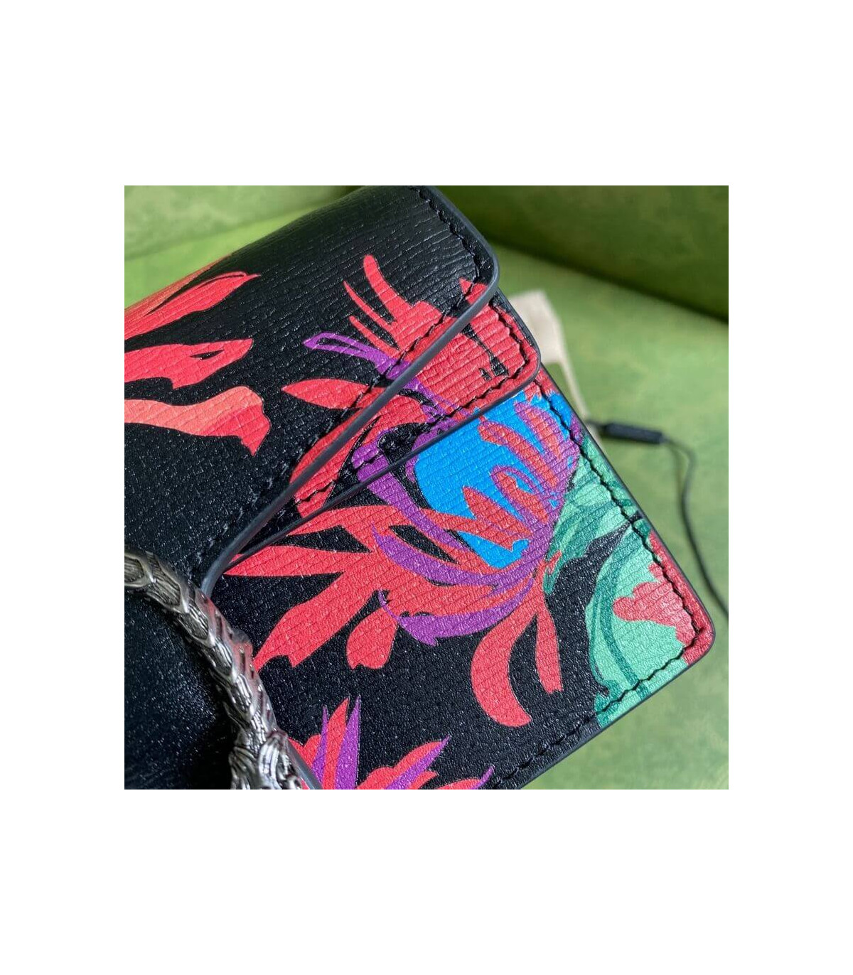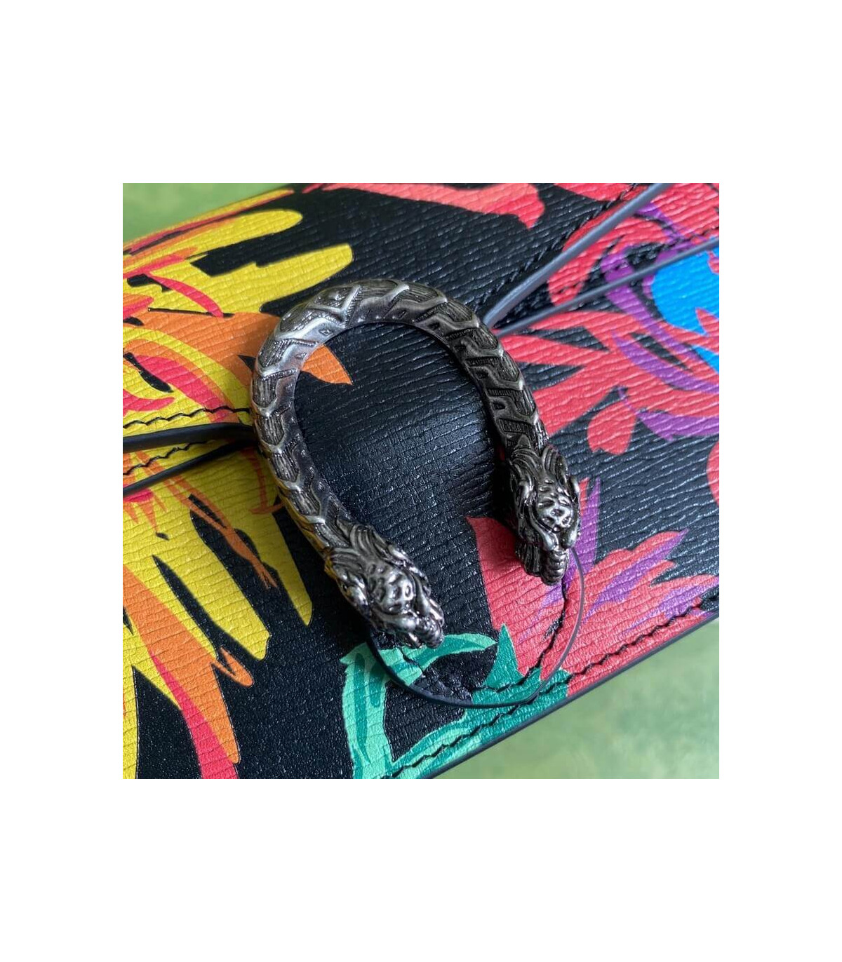 A bright botanical print by Ken Scott animates this mini shoulder bag. Nicknamed the ‘Fashion Gardener,’ Ken Scott was an American designer who lived in Milan in the ‘60s and ‘70s and whose colourful floral drawings were reflective of his eclectic personality. The Dionysus is completed by its signature tiger head closure.