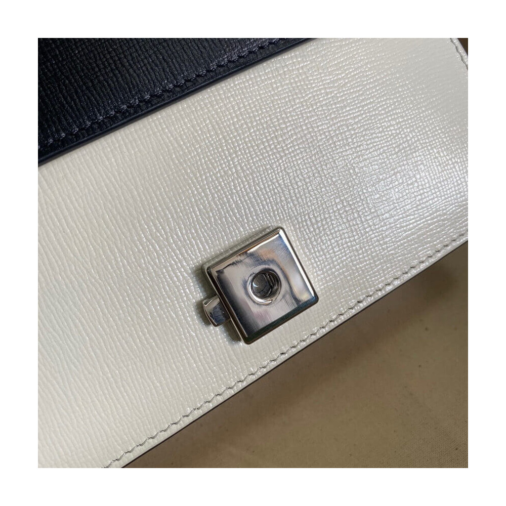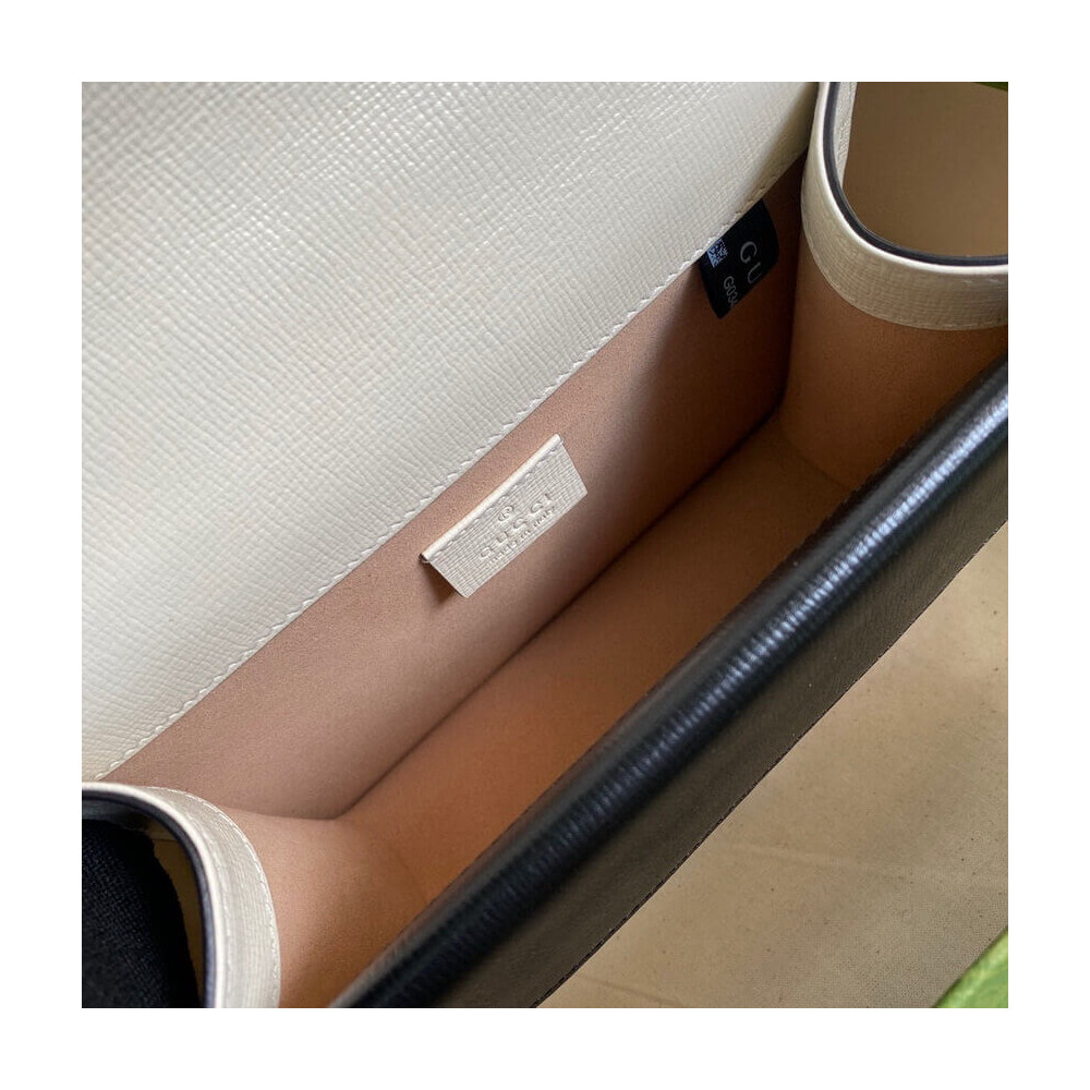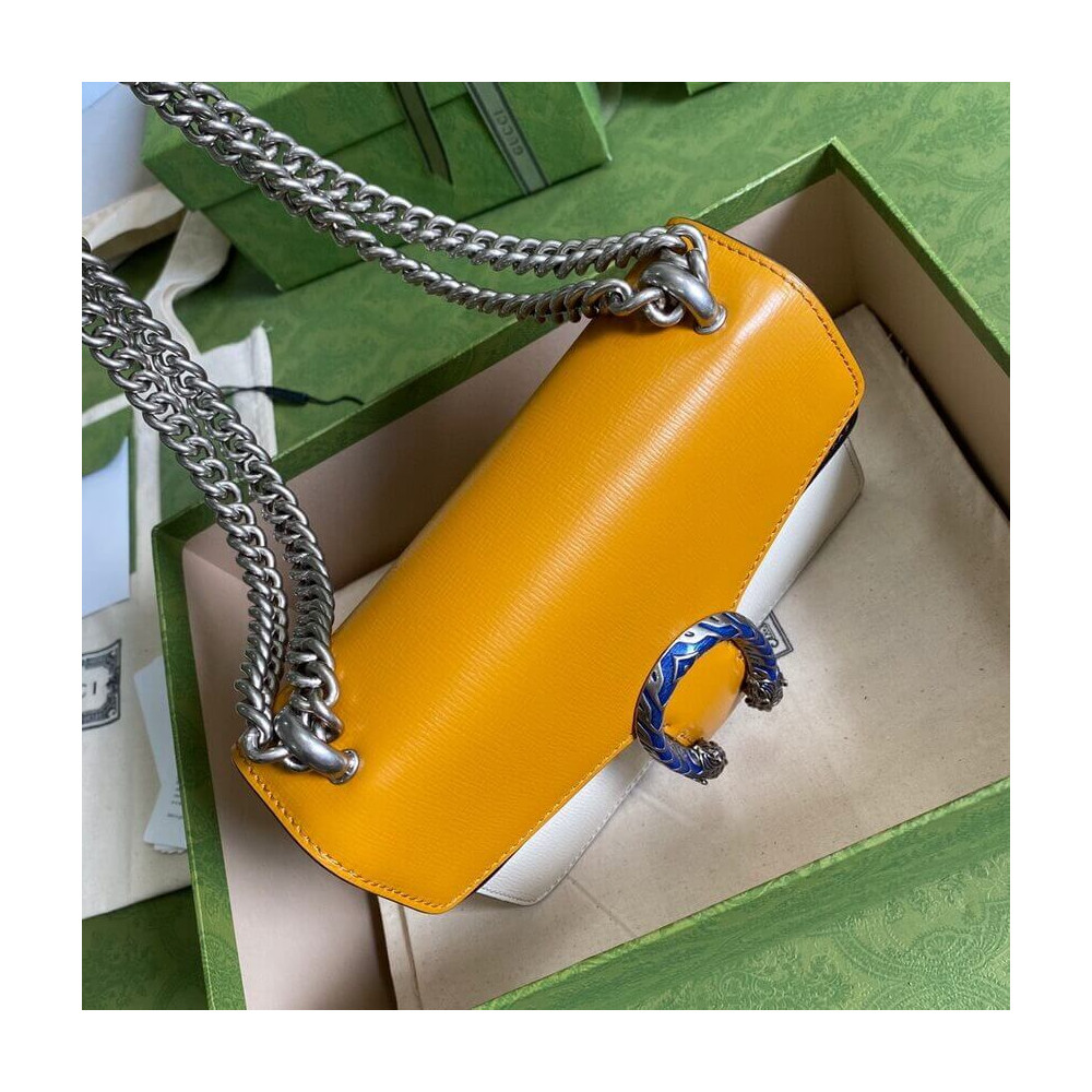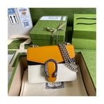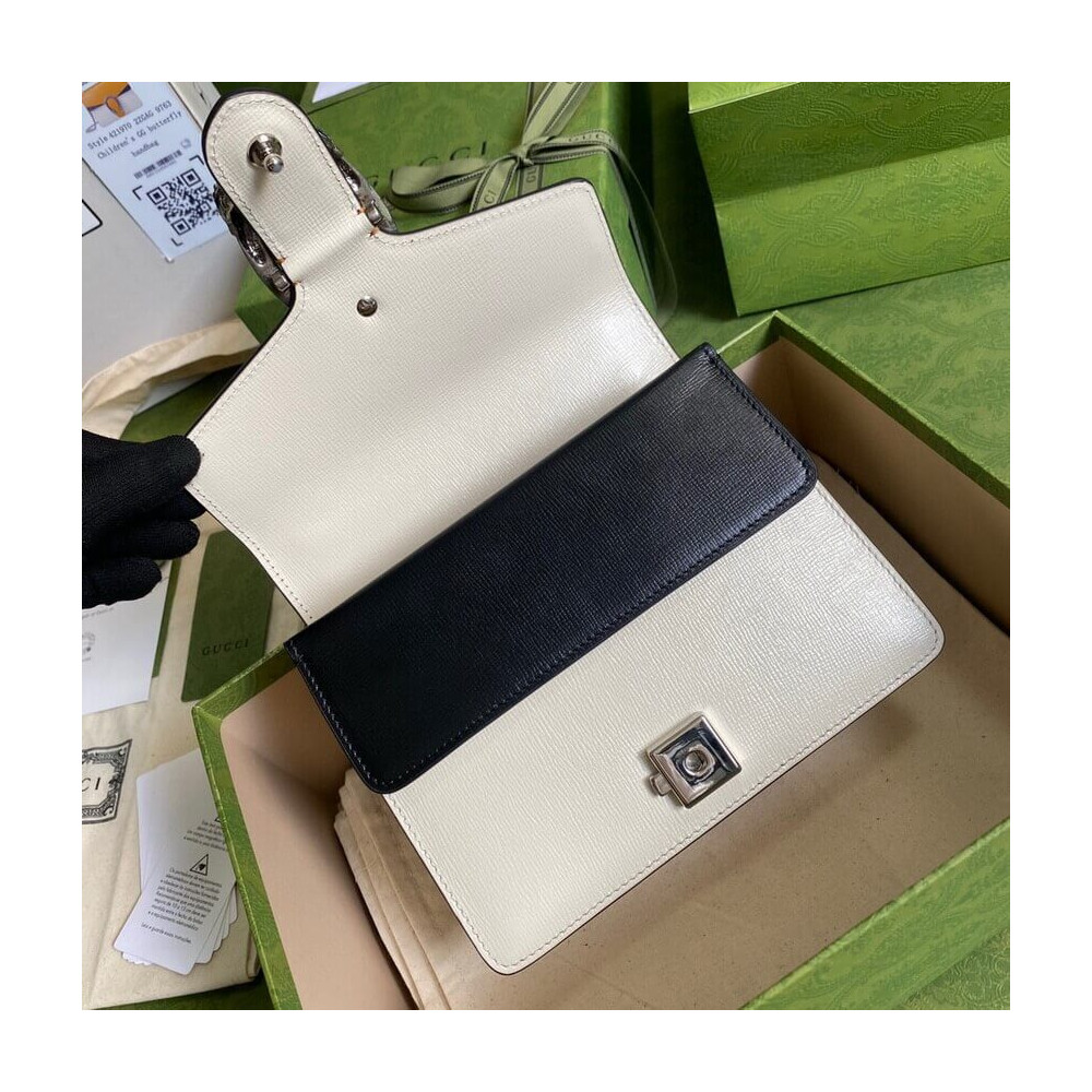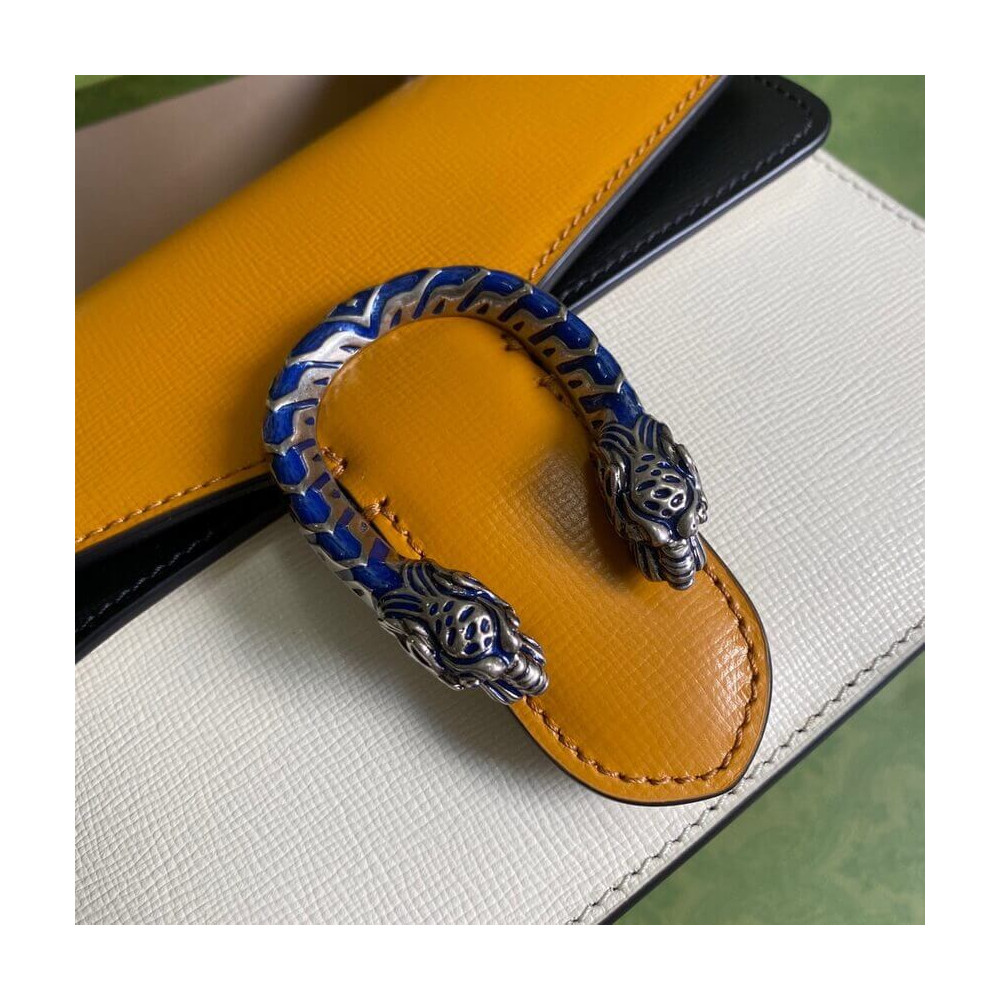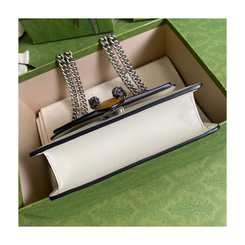 The Dionysus mini bag is presented in white textured leather with the now defining tiger head closure―a unique detail referencing the Greek god Dionysus. The closure is further enhanced with Swarovski crystals. The sliding chain strap can be worn multiple ways, changing between a shoulder and a top handle bag.