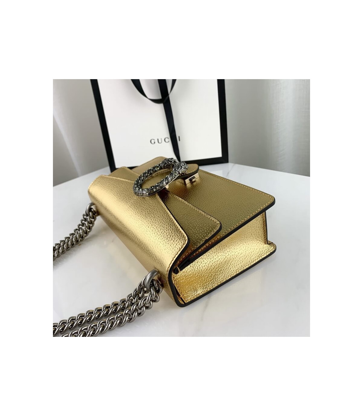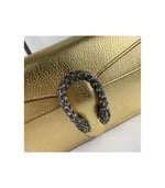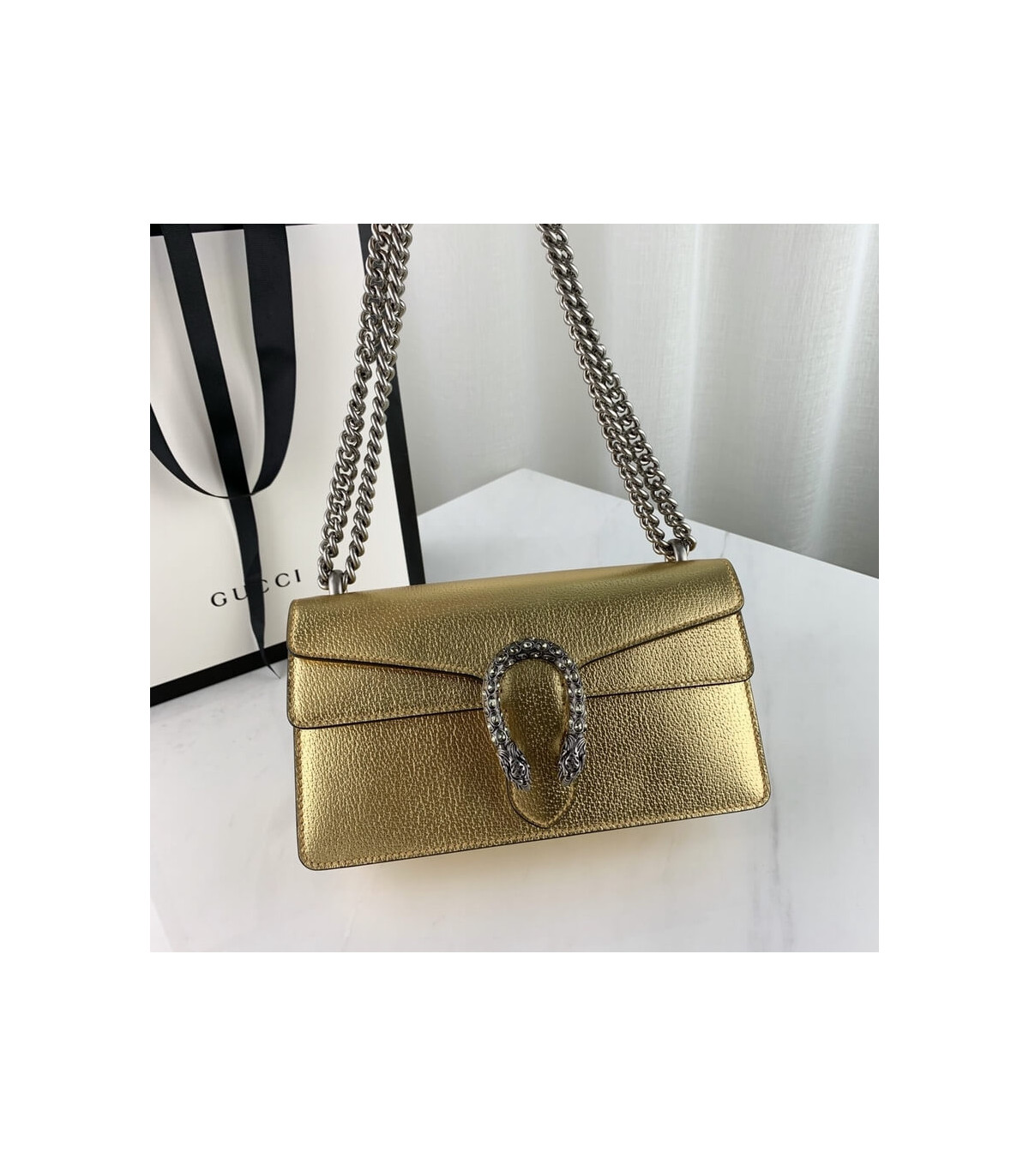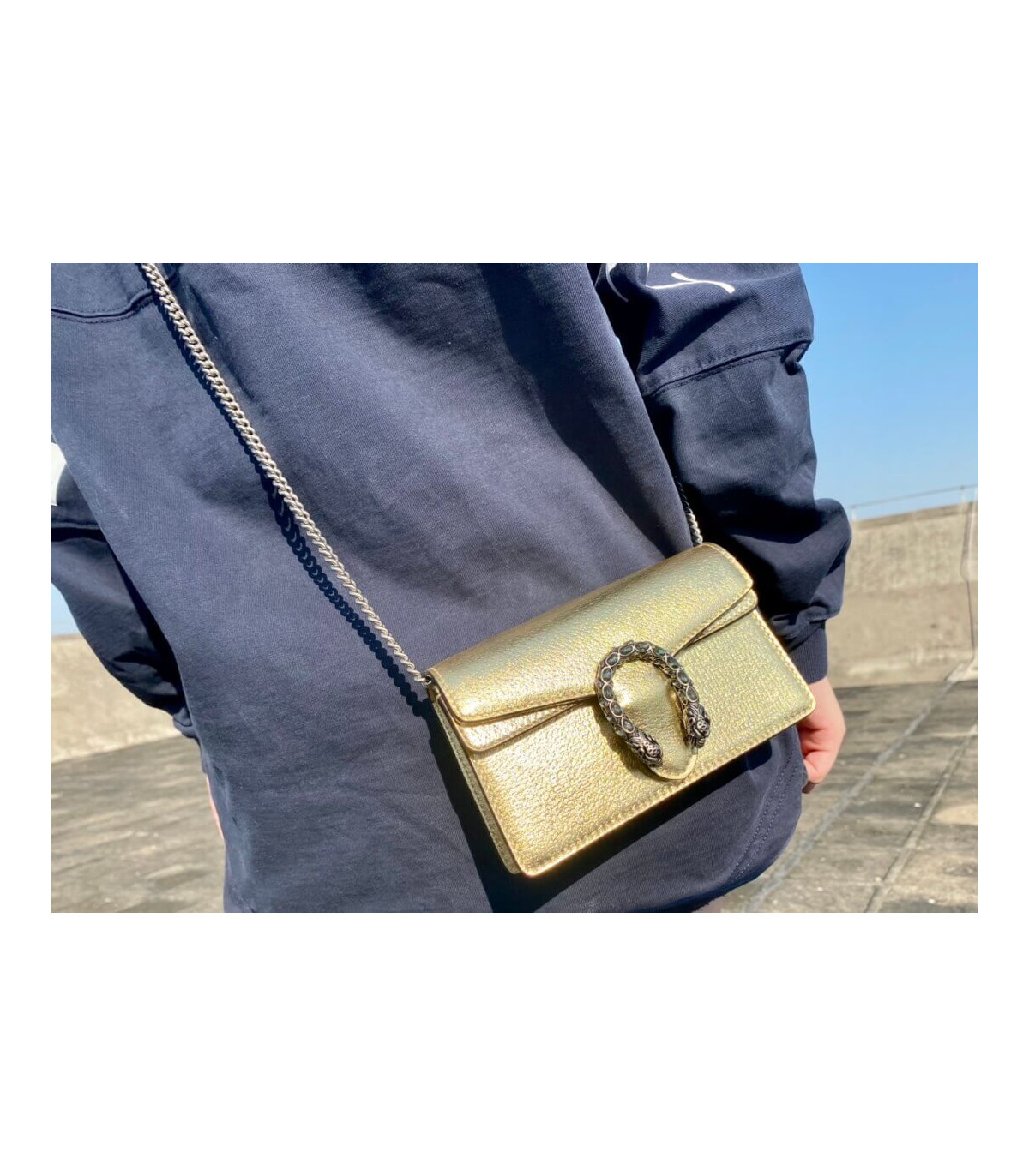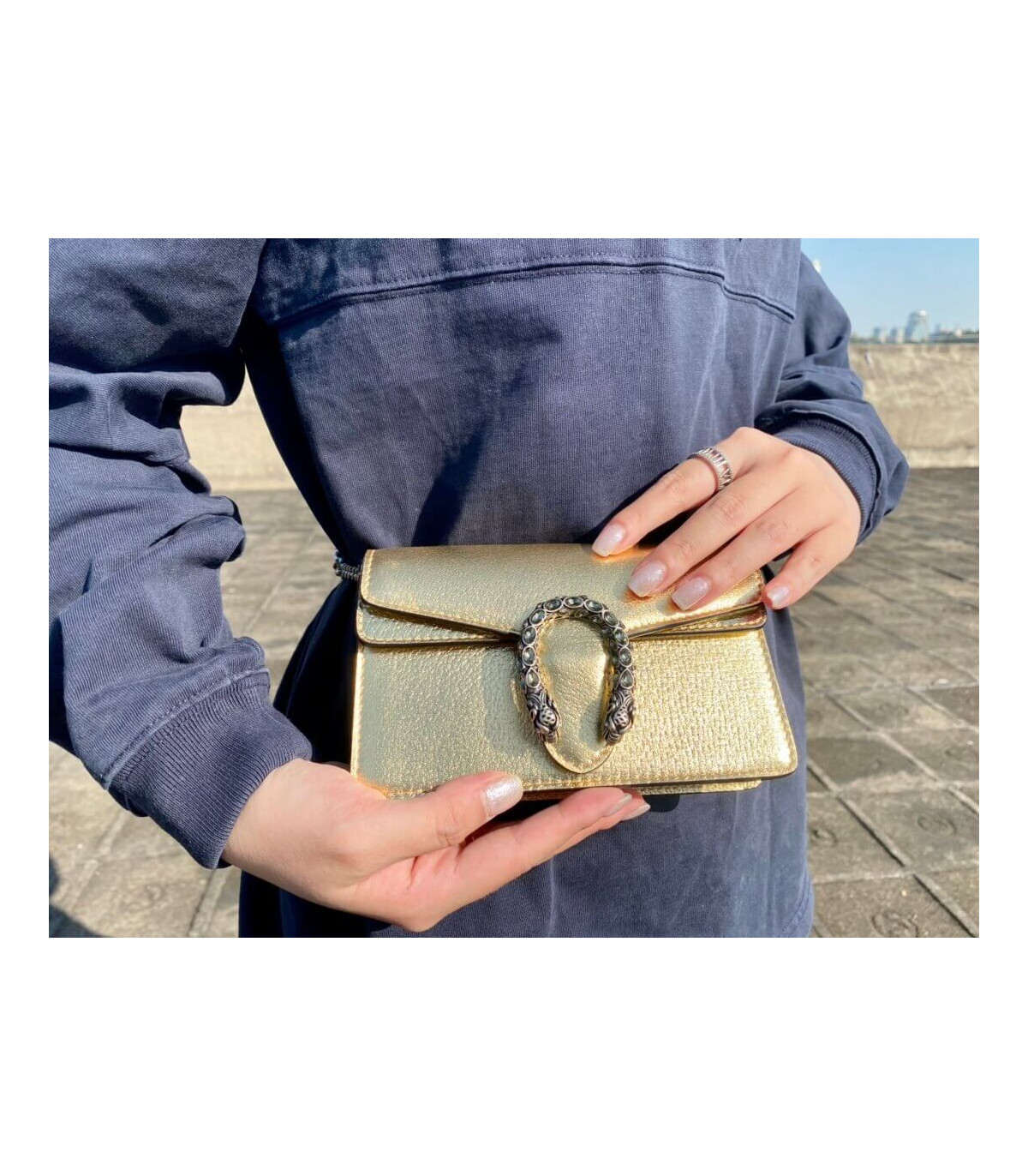 The Dionysus shoulder bag is presented in shiny silver leather. The now defining tiger head closure―a unique detail referencing the Greek god Dionysus, who in myth is said to have crossed the river Tigris on a tiger sent to him by Zeus―is further enhanced with sparkling crystals. The sliding chain strap can be worn multiple ways, changing between a shoulder, crossbody and a top handle bag.