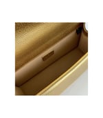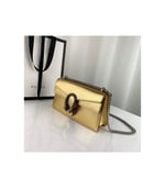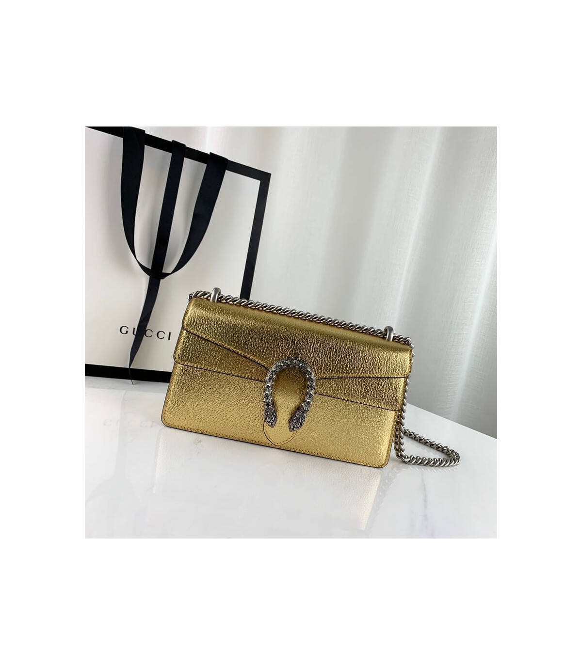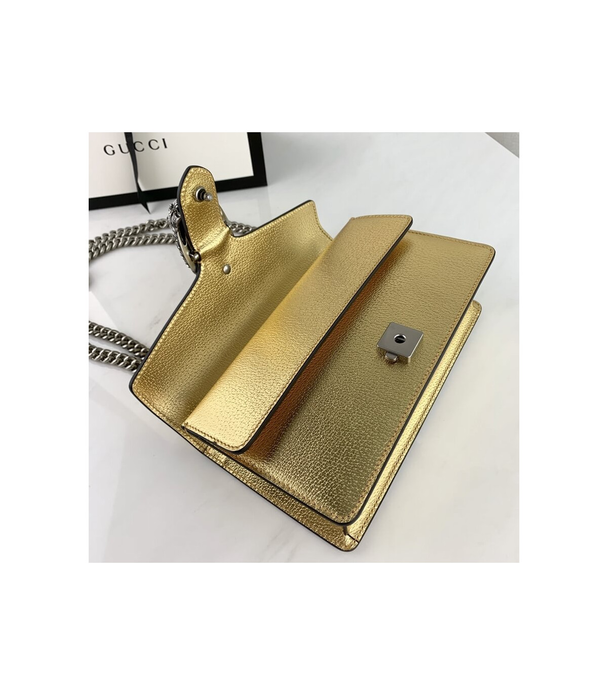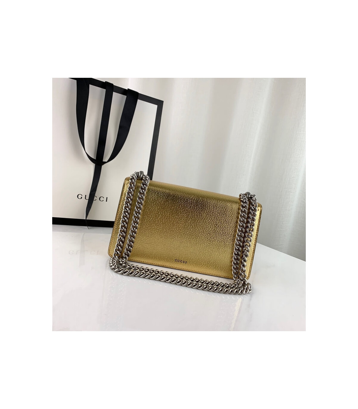 The Dionysus shoulder bag is presented in shiny silver leather. The now defining tiger head closure―a unique detail referencing the Greek god Dionysus, who in myth is said to have crossed the river Tigris on a tiger sent to him by Zeus―is further enhanced with sparkling crystals. The sliding chain strap can be worn multiple ways, changing between a shoulder, crossbody and a top handle bag.