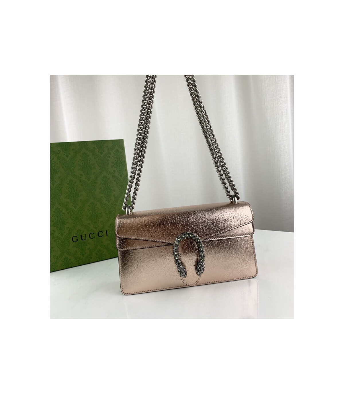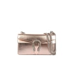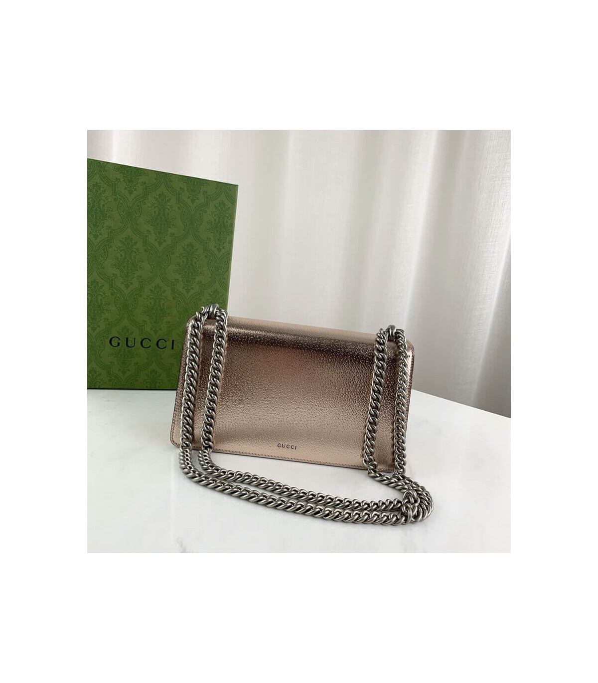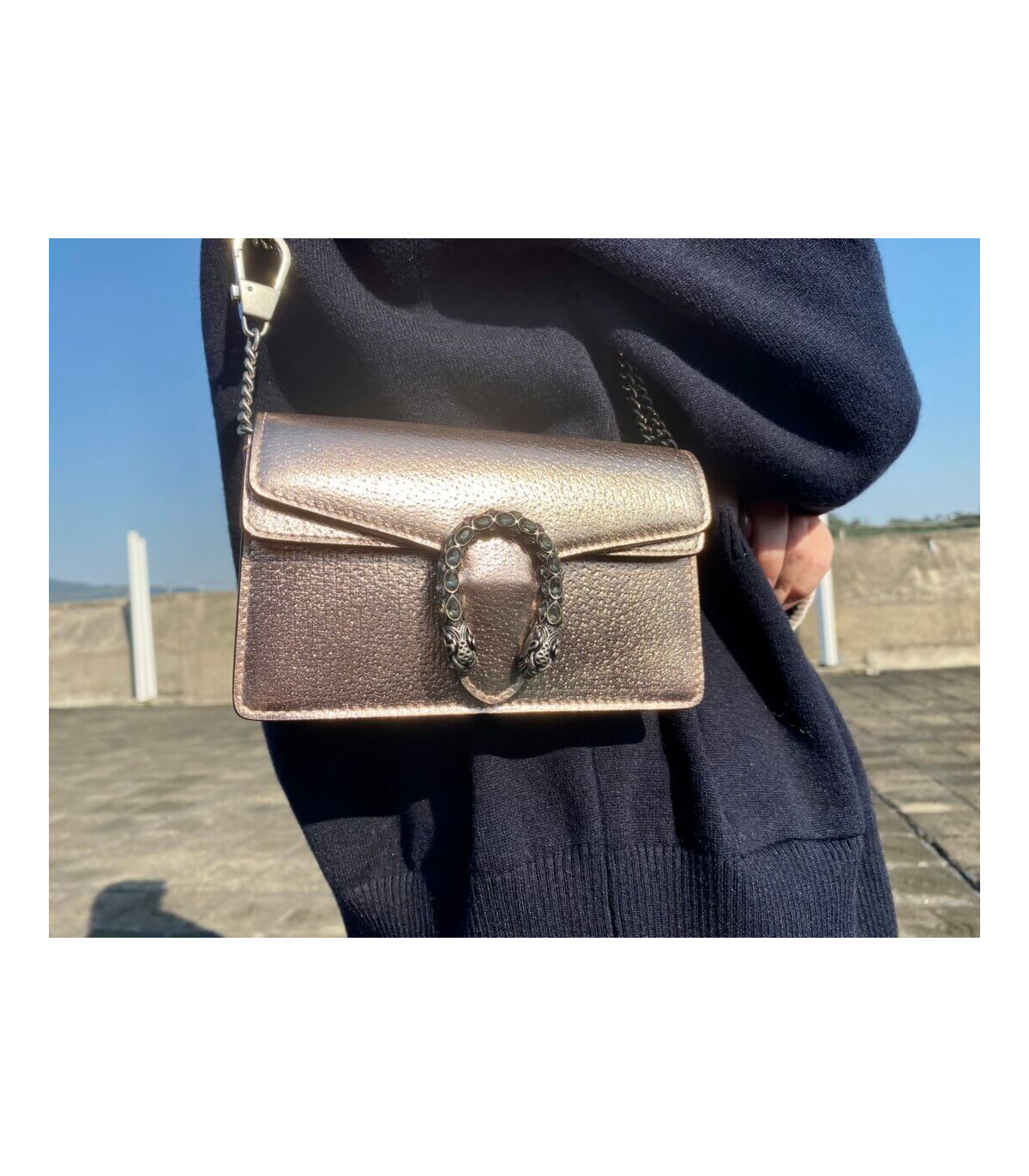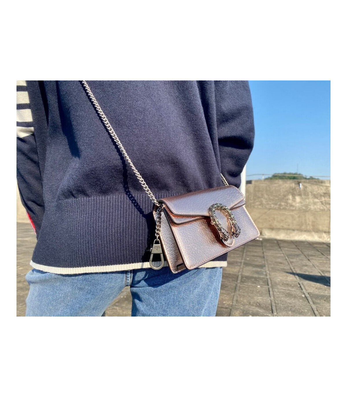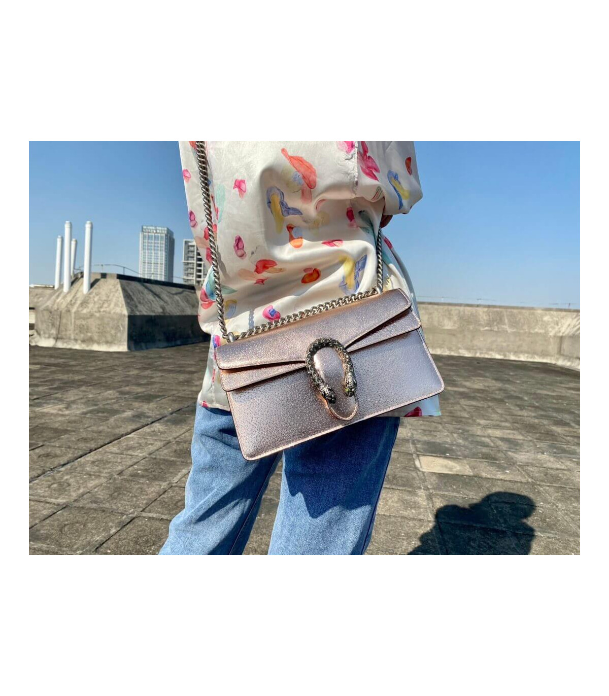 The Dionysus shoulder bag is presented in shiny silver leather. The now defining tiger head closure―a unique detail referencing the Greek god Dionysus, who in myth is said to have crossed the river Tigris on a tiger sent to him by Zeus―is further enhanced with sparkling crystals. The sliding chain strap can be worn multiple ways, changing between a shoulder, crossbody and a top handle bag.