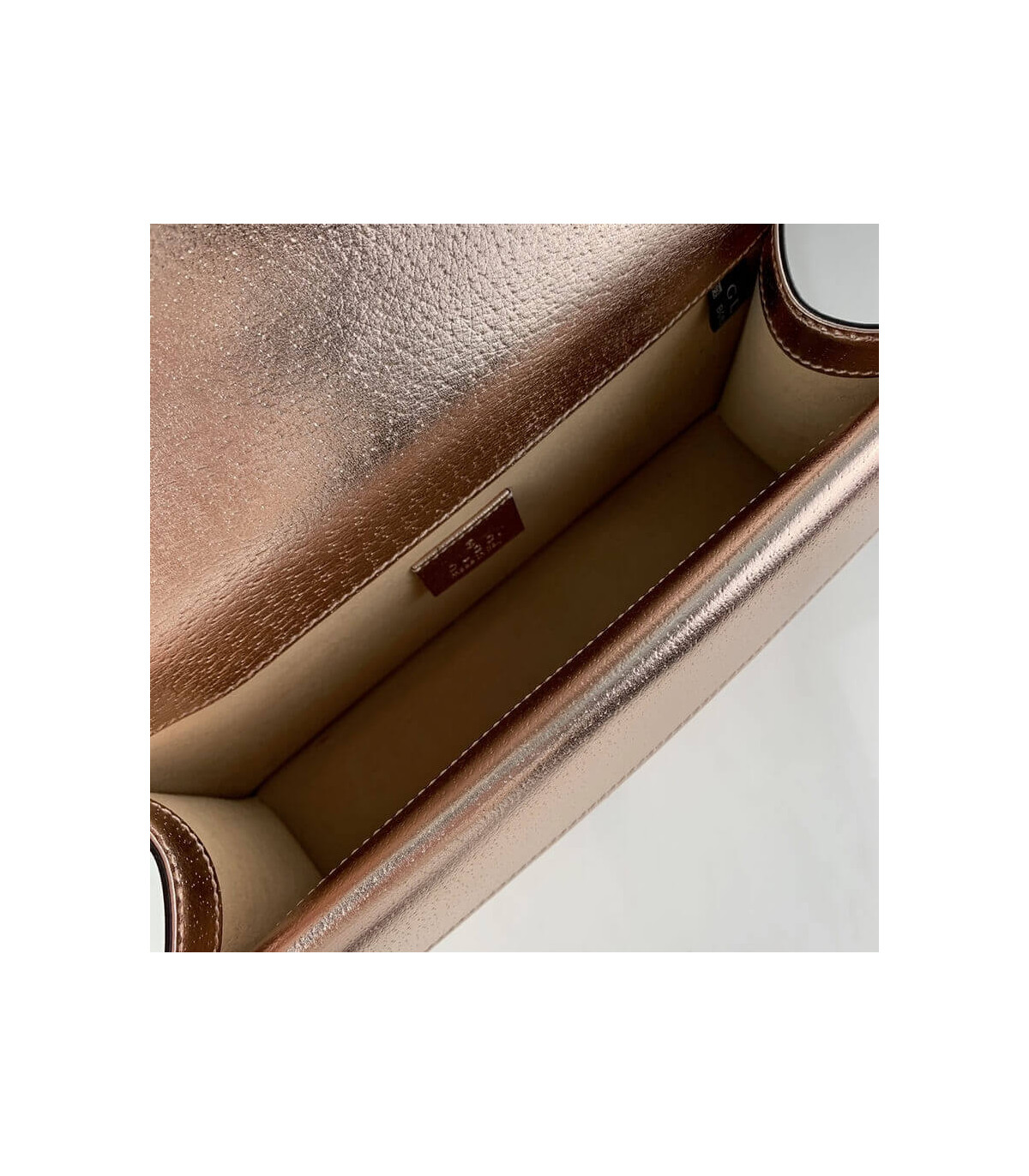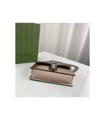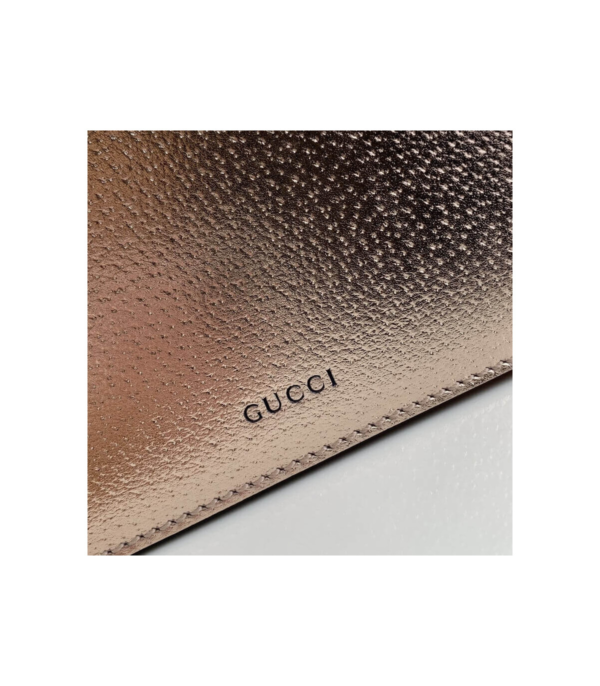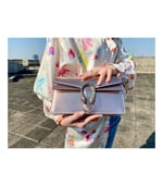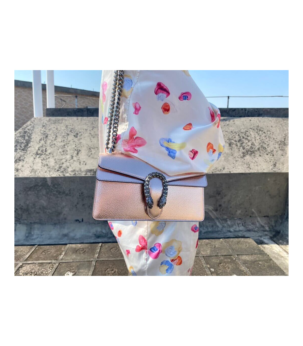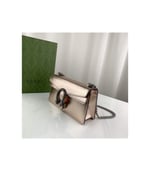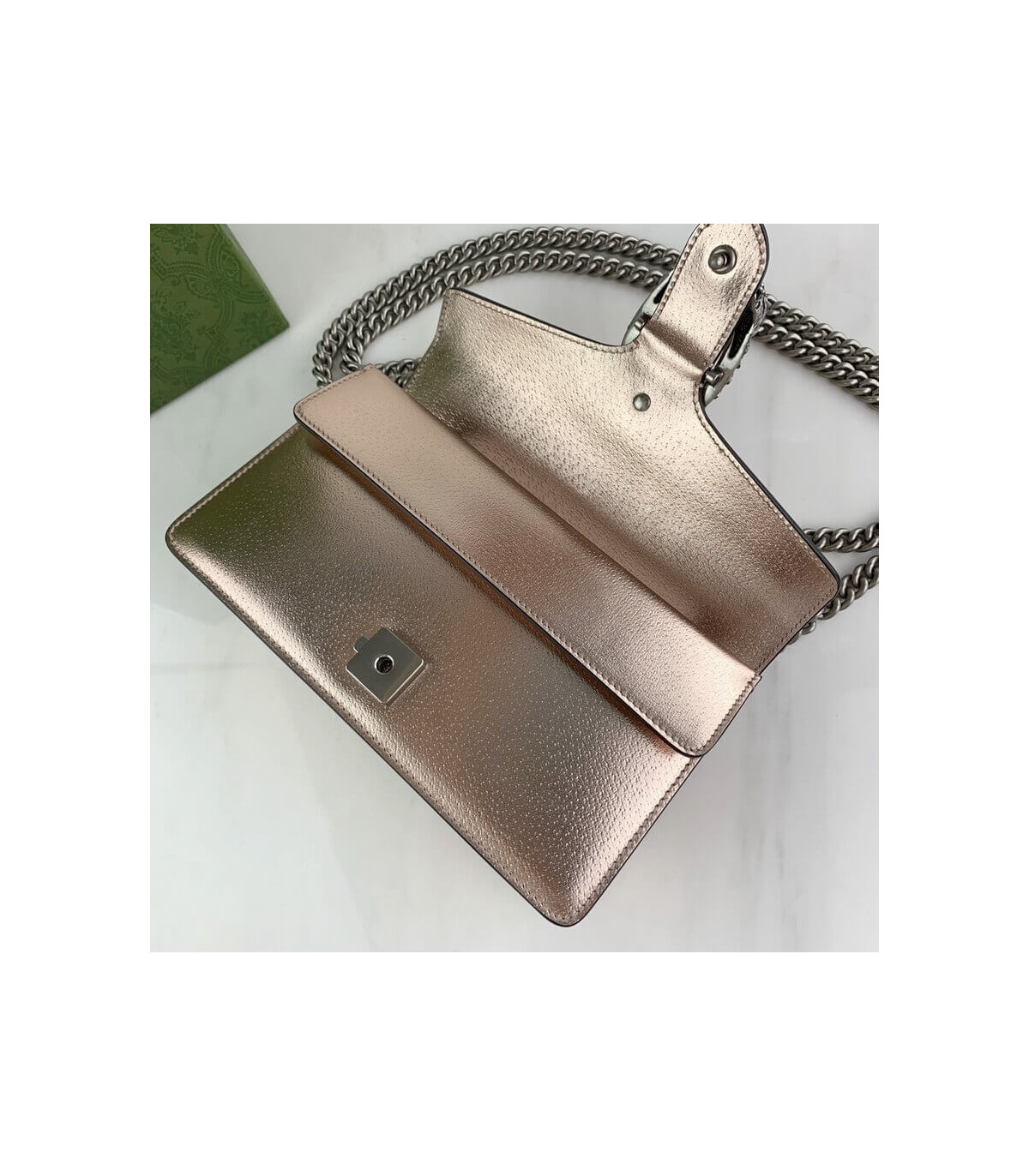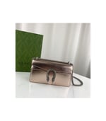 The Dionysus shoulder bag is presented in shiny silver leather. The now defining tiger head closure―a unique detail referencing the Greek god Dionysus, who in myth is said to have crossed the river Tigris on a tiger sent to him by Zeus―is further enhanced with sparkling crystals. The sliding chain strap can be worn multiple ways, changing between a shoulder, crossbody and a top handle bag.