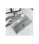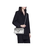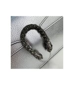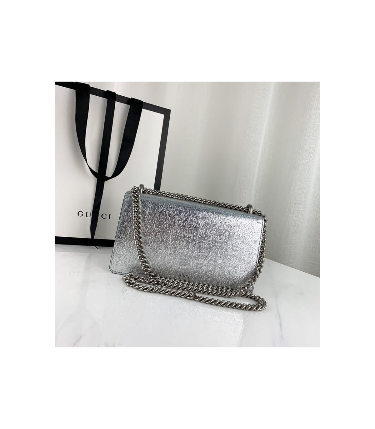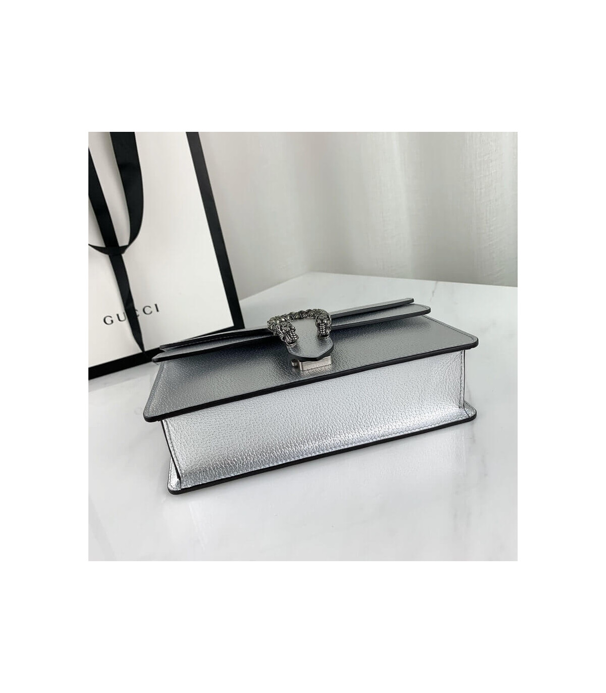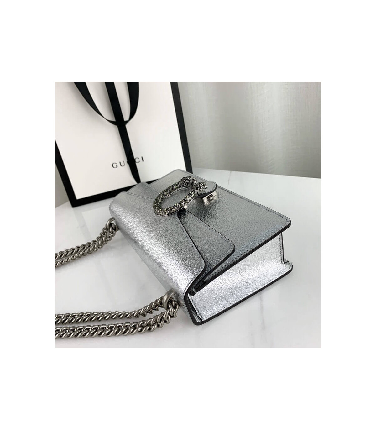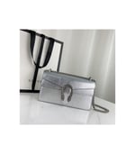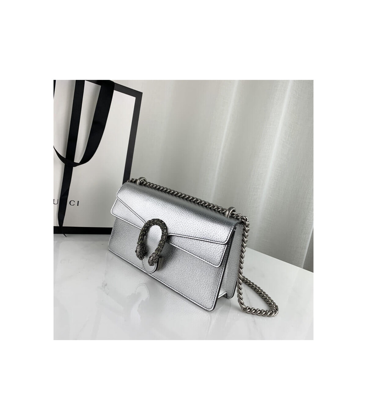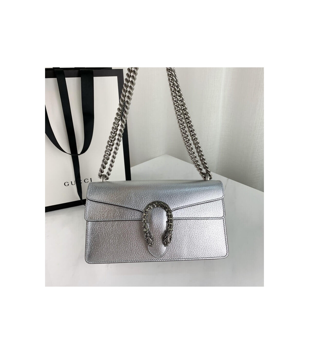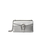 The Dionysus shoulder bag is presented in shiny silver leather. The now defining tiger head closure―a unique detail referencing the Greek god Dionysus, who in myth is said to have crossed the river Tigris on a tiger sent to him by Zeus―is further enhanced with sparkling crystals. The sliding chain strap can be worn multiple ways, changing between a shoulder, crossbody and a top handle bag.