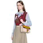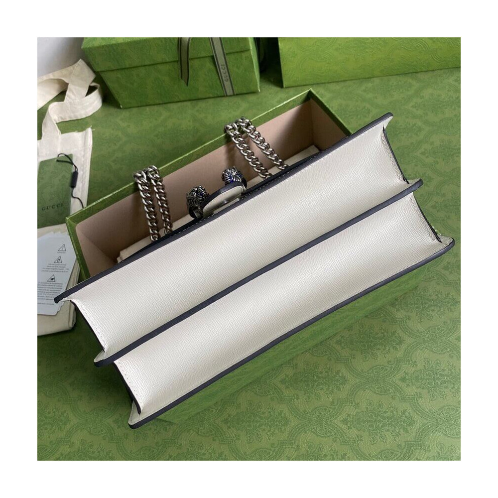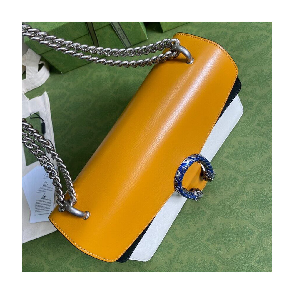 Inspired by a Greek myth, the Dionysus is known for its tiger-shaped closure. Here, the feline detail is paired with orange and white leather, accentuated by electric blue enamel. A sliding chain strap completes the small shoulder bag, allowing it to be carried in different ways.