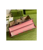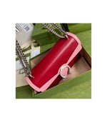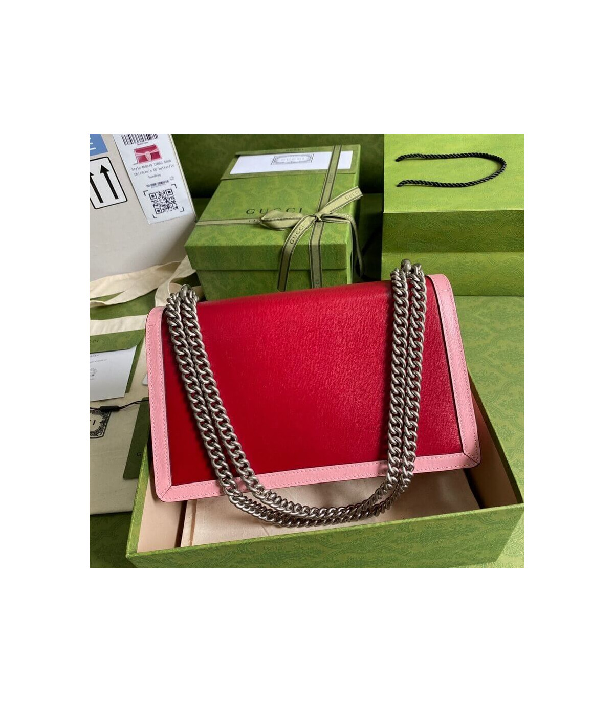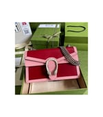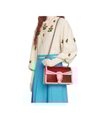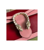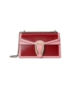Signature styles from the Beloved lines are presented in vibrant colors that recall precious gems. Here the Dionysus is introduced in ruby toned red leather with a gold-toned take on its emblematic tiger head closure. The textured hardware is further enhanced by shiny enamel