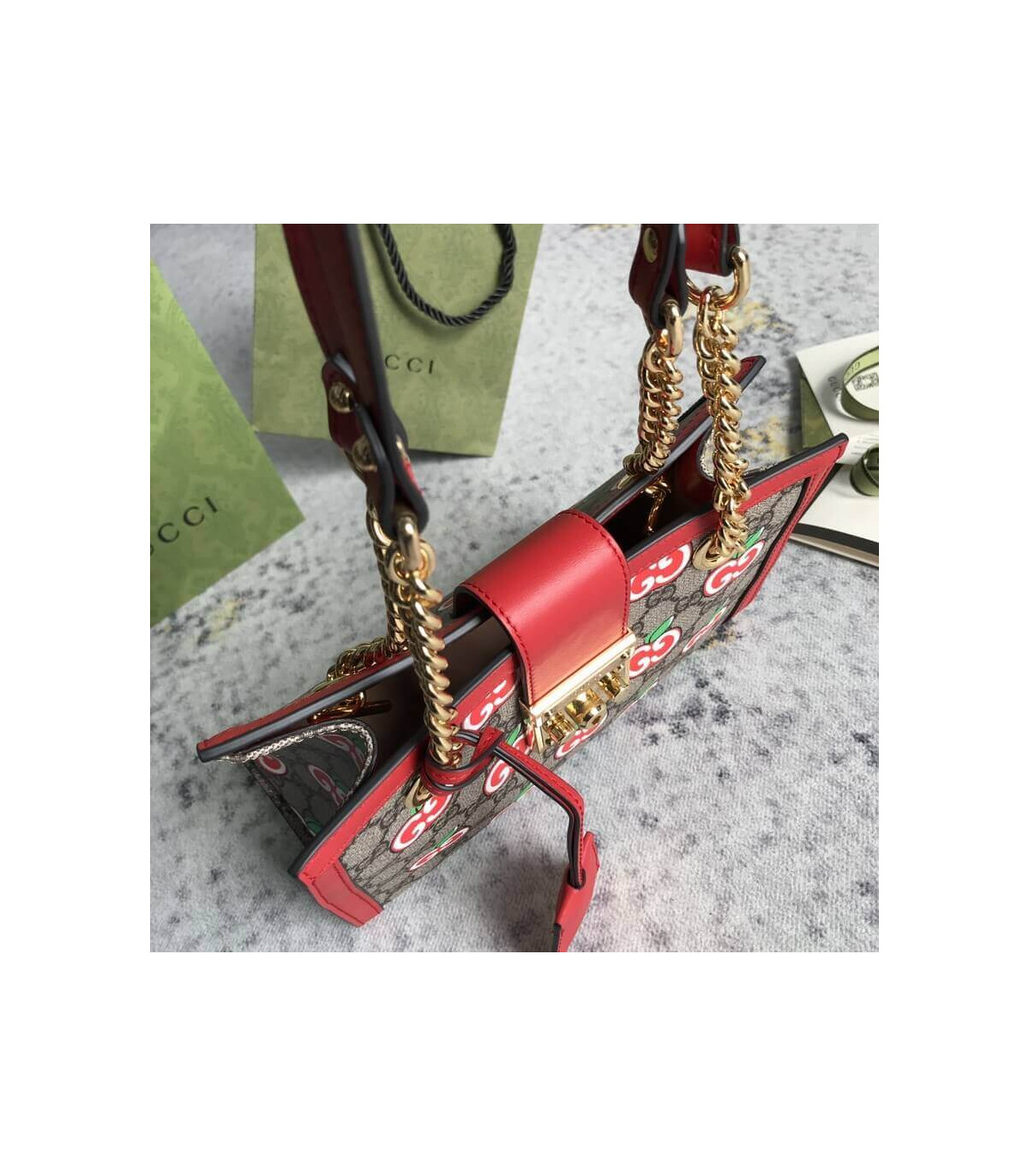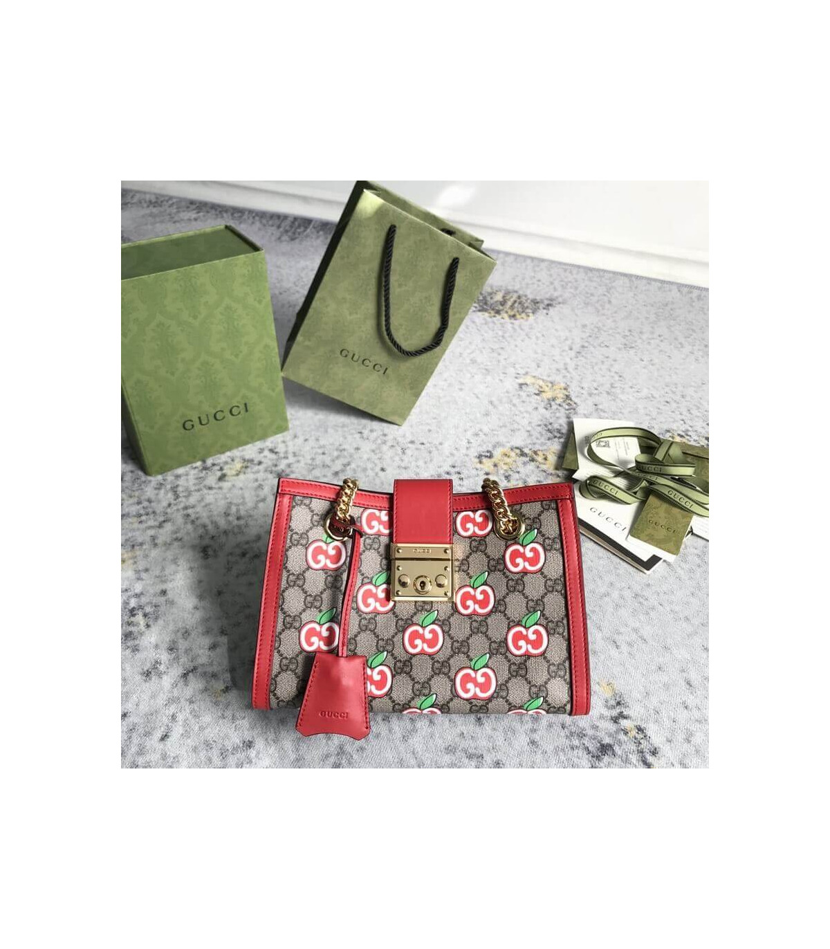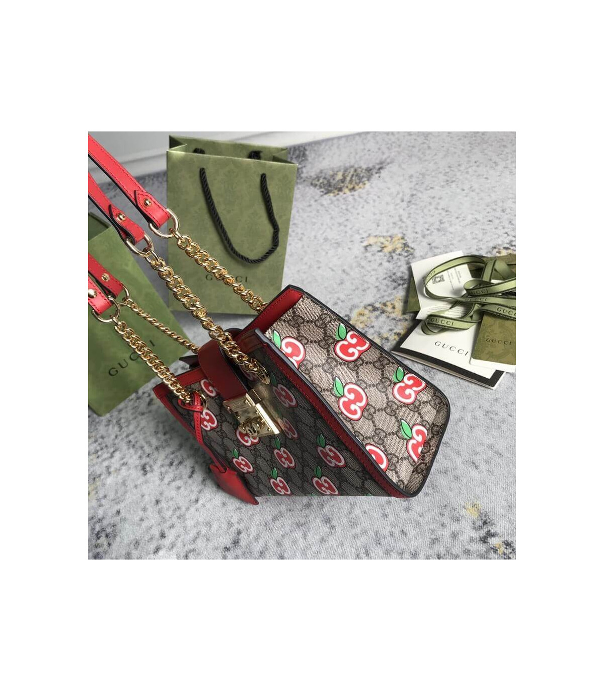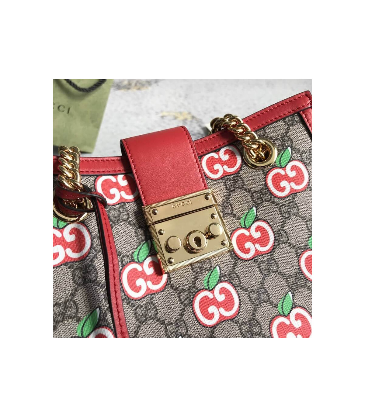 In celebration of Chinese Valentine’s Day, a special collection of styles features cartoon-style apples playfully set against the House’s monogram, which are cleverly matched with the brand’s double G-letter interweaving patterns, showing a fun design. This shoulder bag is designed with a key lock to create a chic finishing touch.