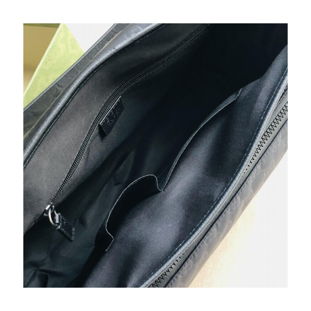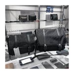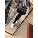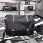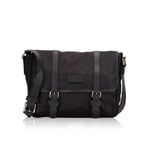 This stylish messenger bag is crafted of luxurious textured nylon in navy blue. The bag features an adjustable leather shoulder strap with silver hardware, and a facing flap with leather belts.?