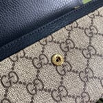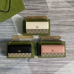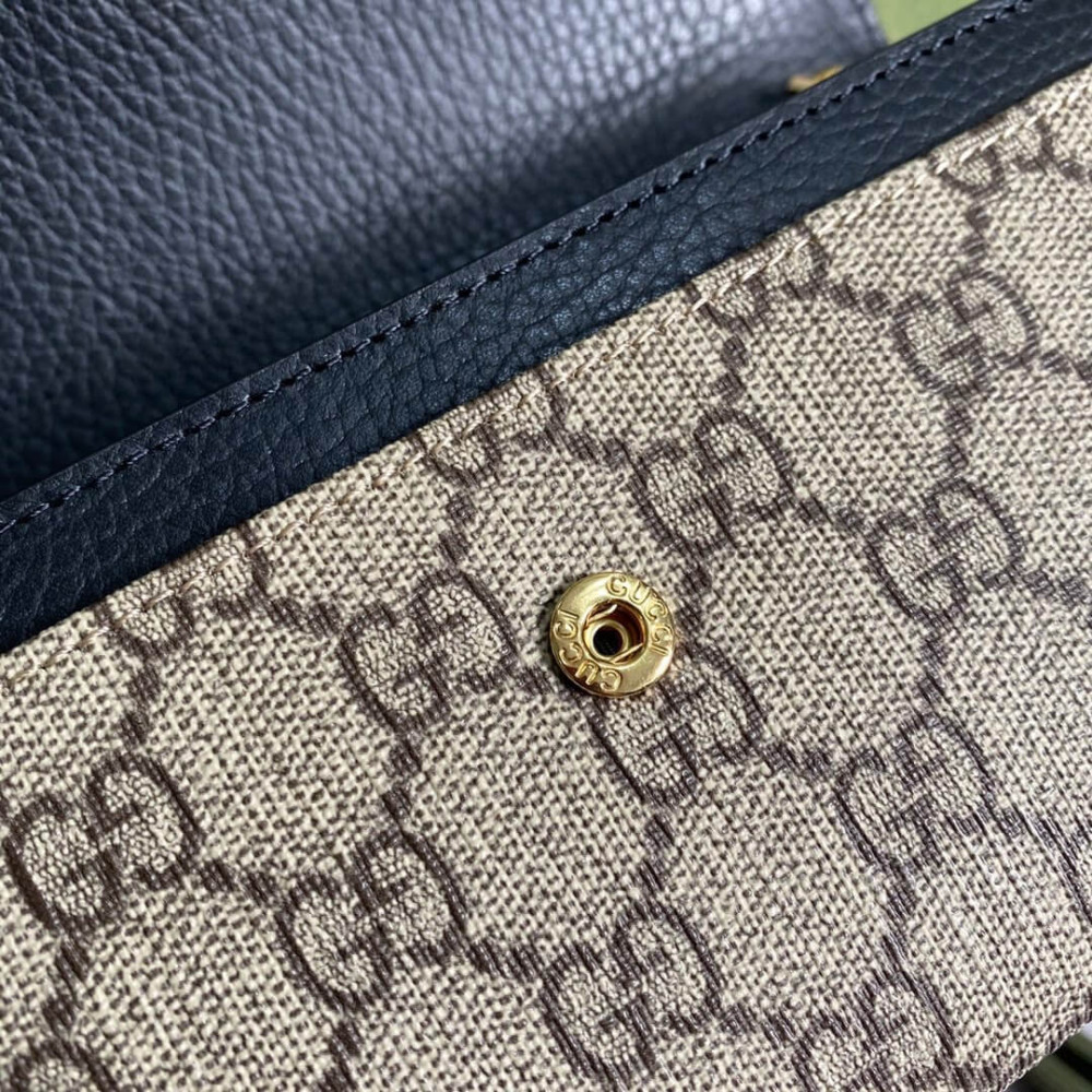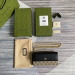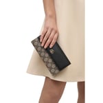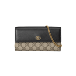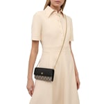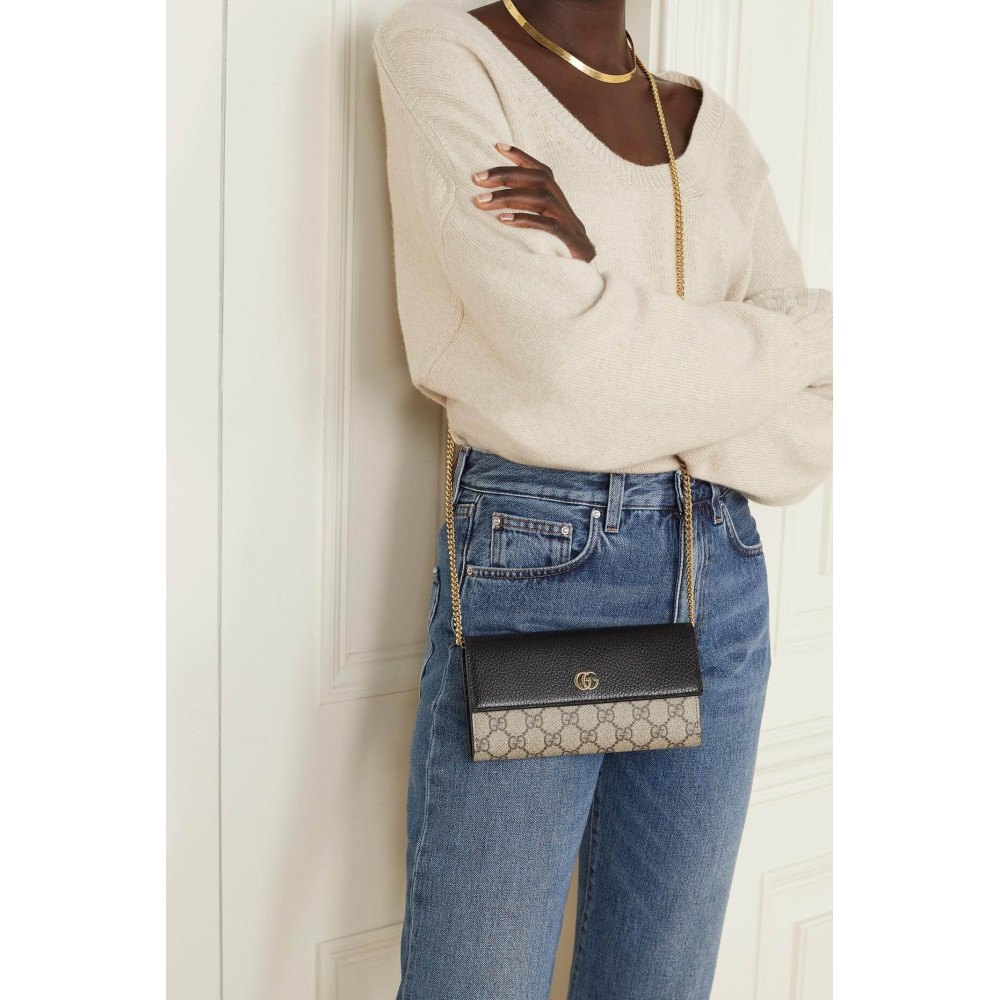 A slim wallet crafted from a mix of the House’s monogram canvas and smooth black leather and completed by a delicate chain strap. A part of the GG Marmont line, the style is defined by a mini version of the emblematic Double G hardware.
