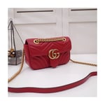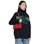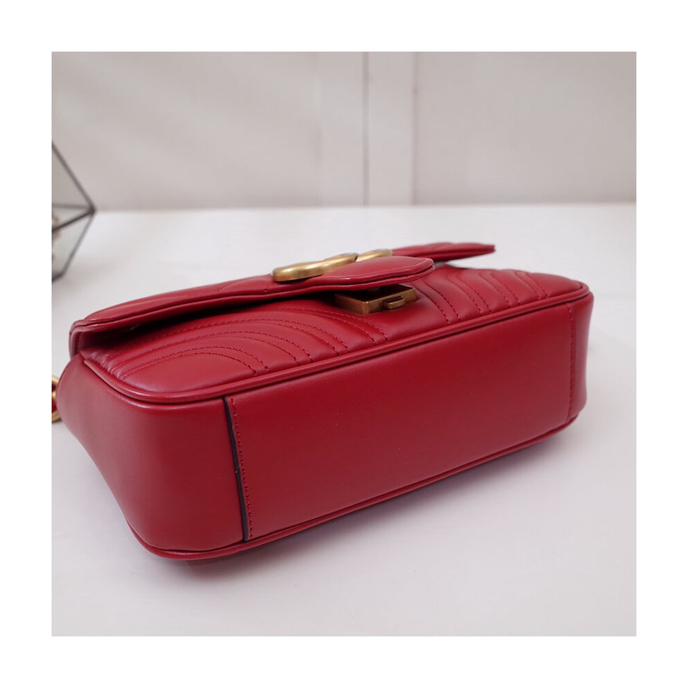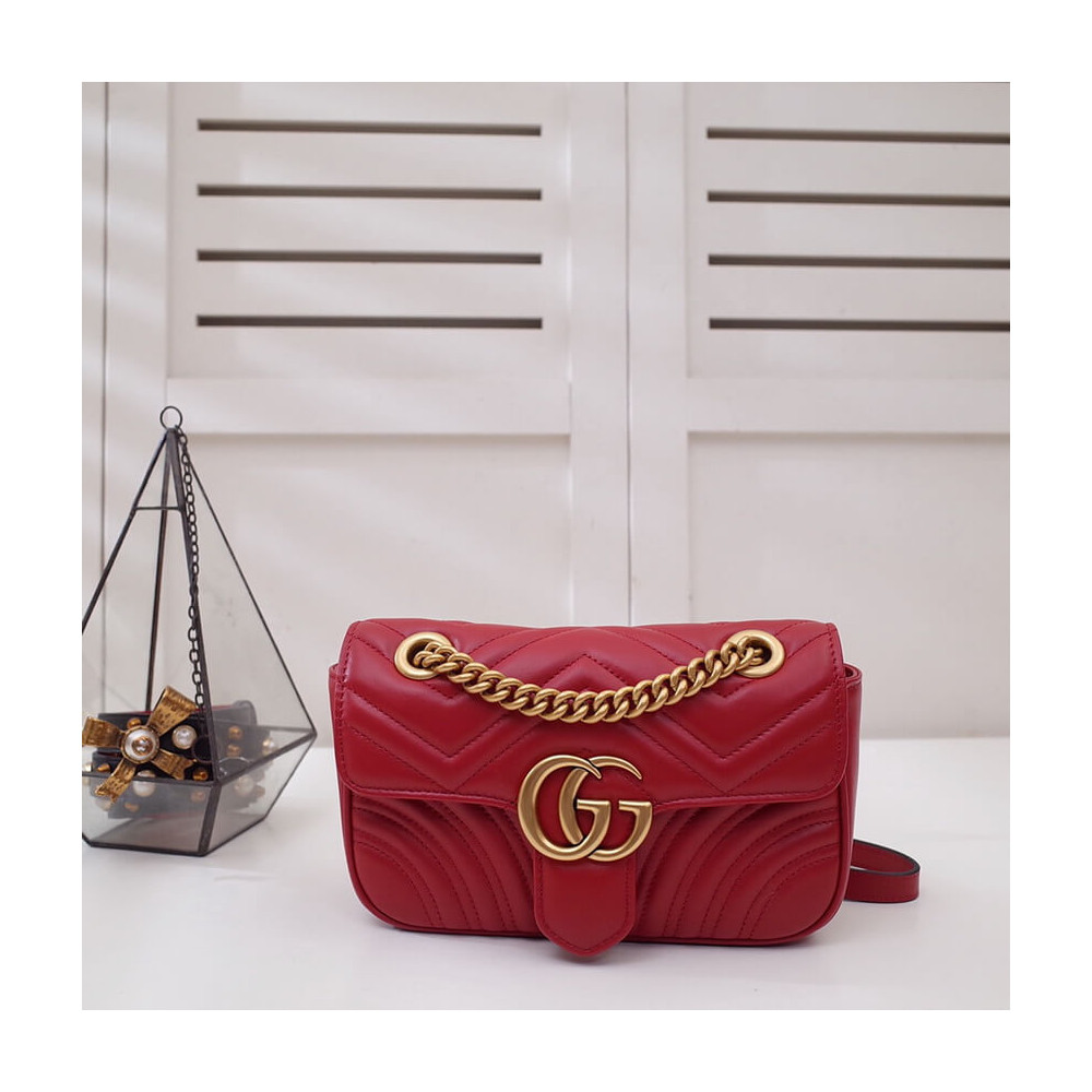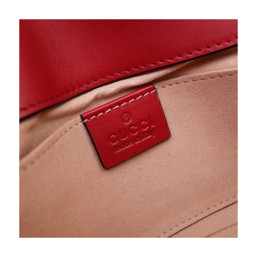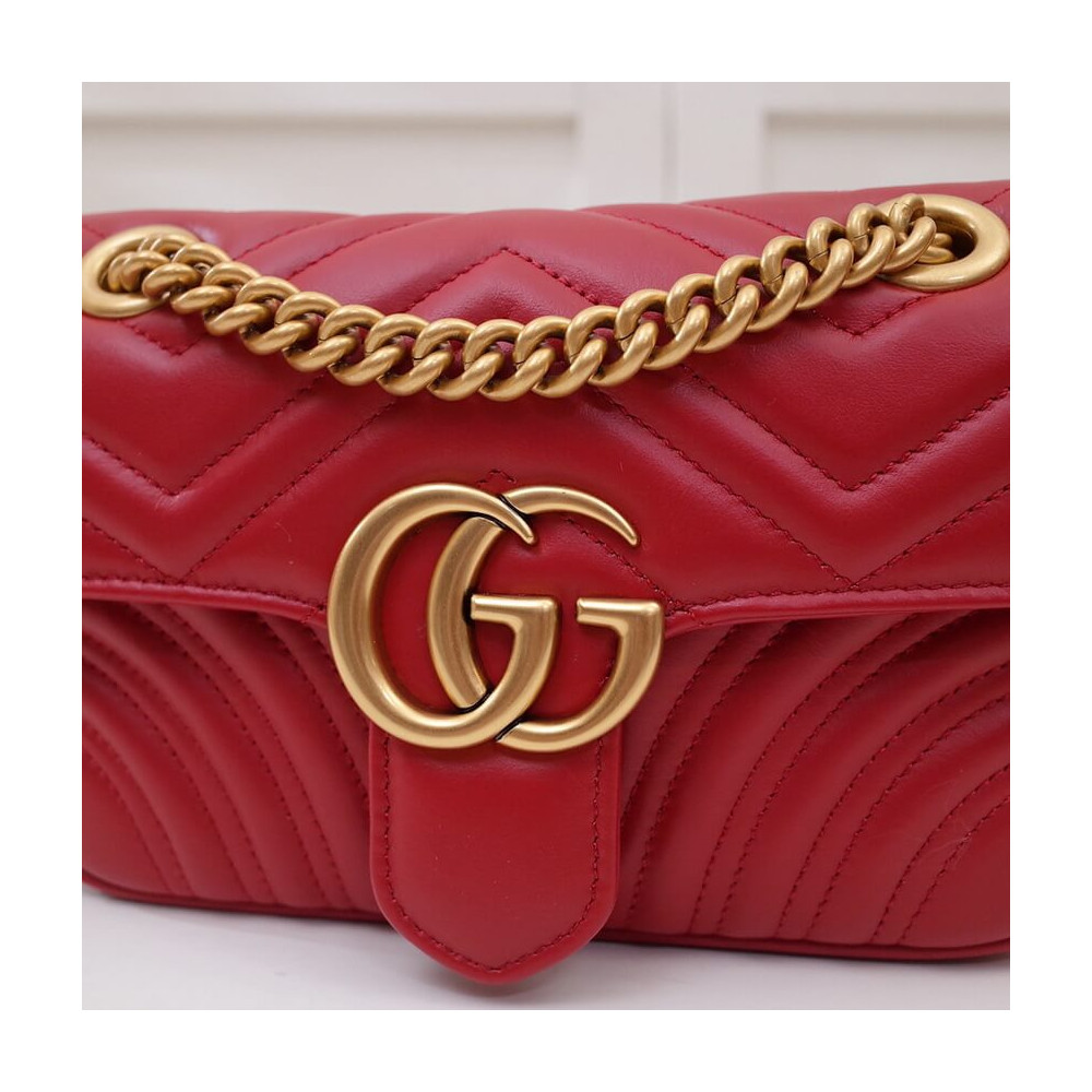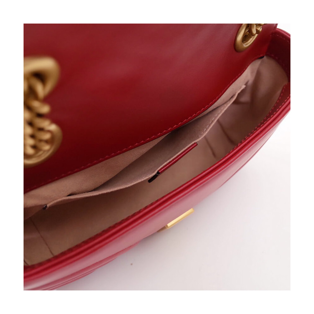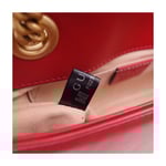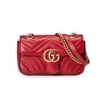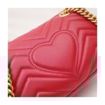 The mini GG Marmont chain shoulder bag has a softly structured shape and an oversized flap closure with Double G hardware. The sliding chain strap can be worn multiple ways, changing between a shoulder and a top handle bag. Made in matelassé chevron leather with a heart on the back.