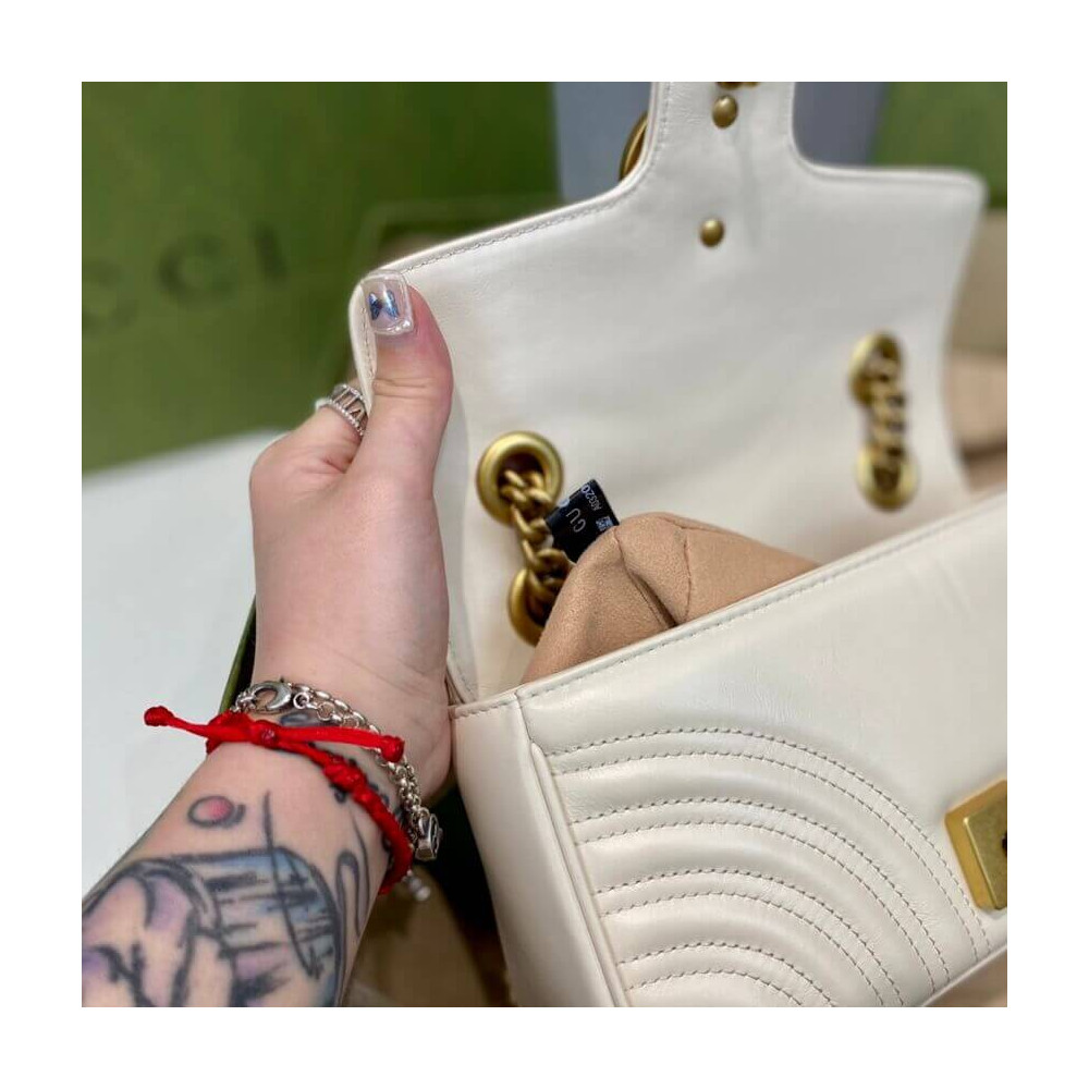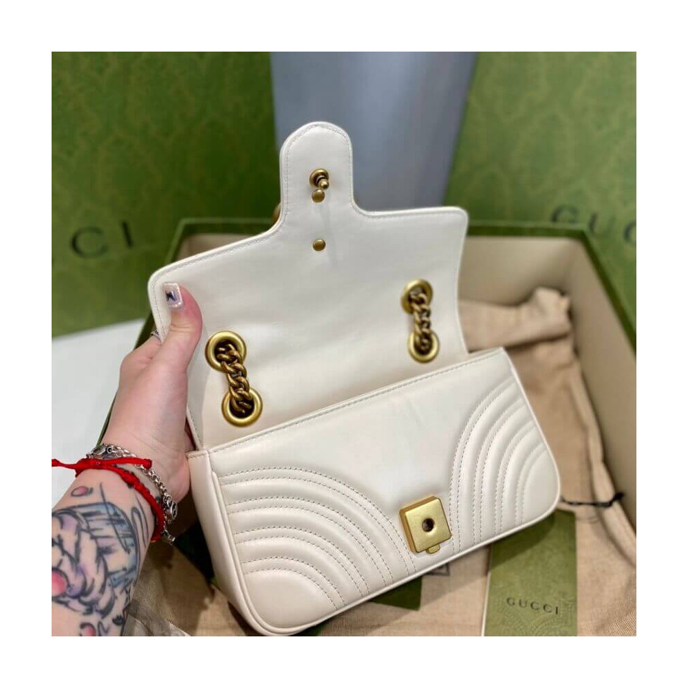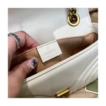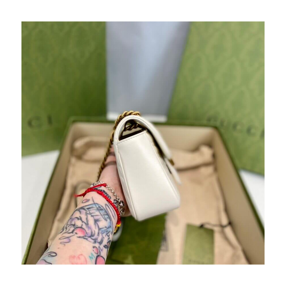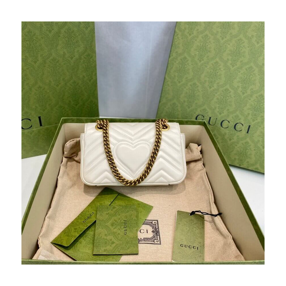 The mini GG Marmont chain shoulder bag has a softly structured shape and an oversized flap closure with Double G hardware. The sliding chain strap can be worn multiple ways, changing between a shoulder and a top handle bag. Made in matelassé chevron leather with a heart on the back.