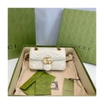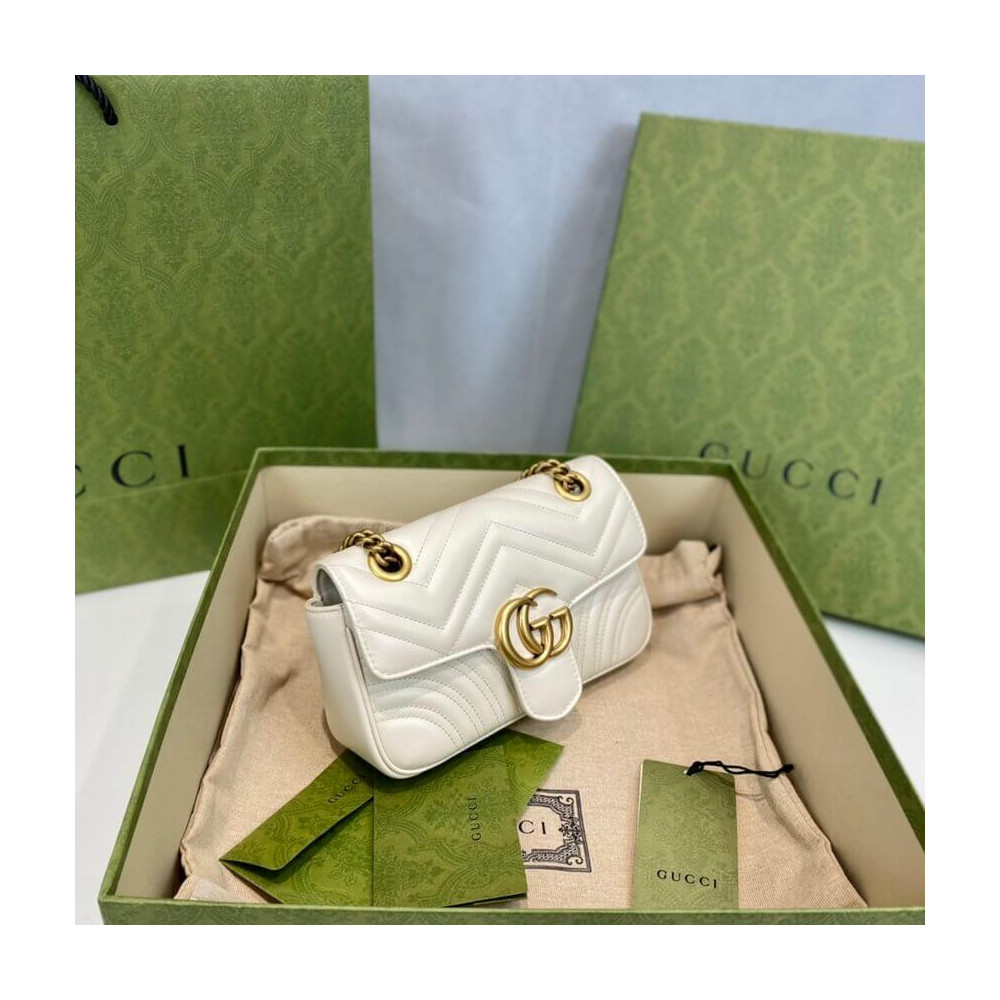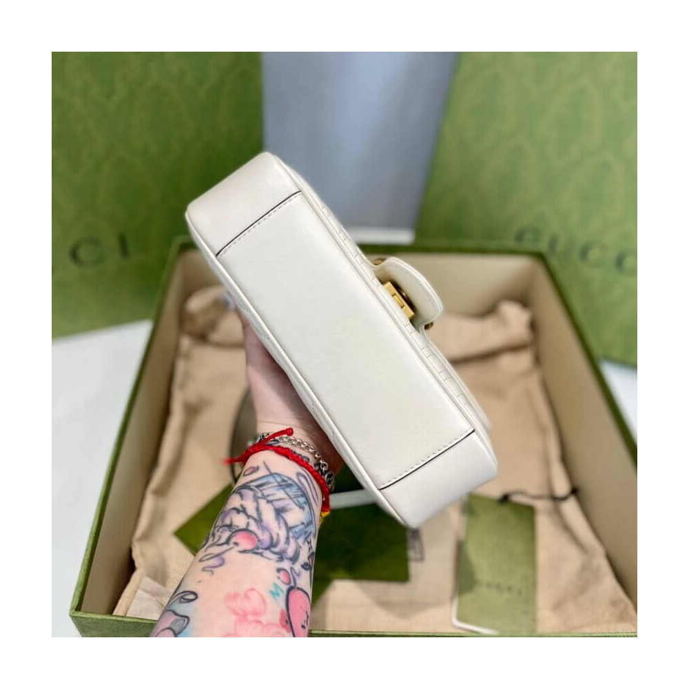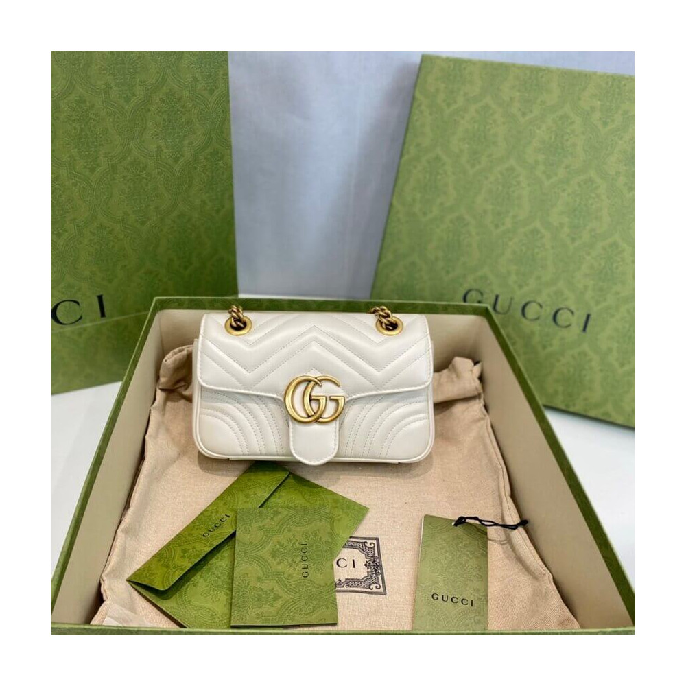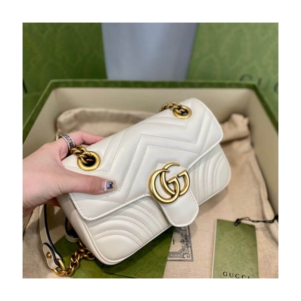 The mini GG Marmont chain shoulder bag has a softly structured shape and an oversized flap closure with Double G hardware. The sliding chain strap can be worn multiple ways, changing between a shoulder and a top handle bag. Made in matelassé chevron leather with a heart on the back.