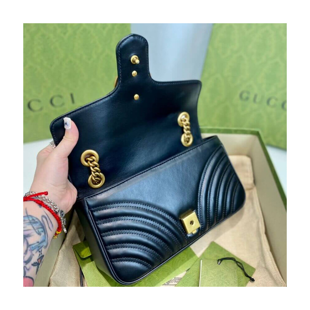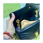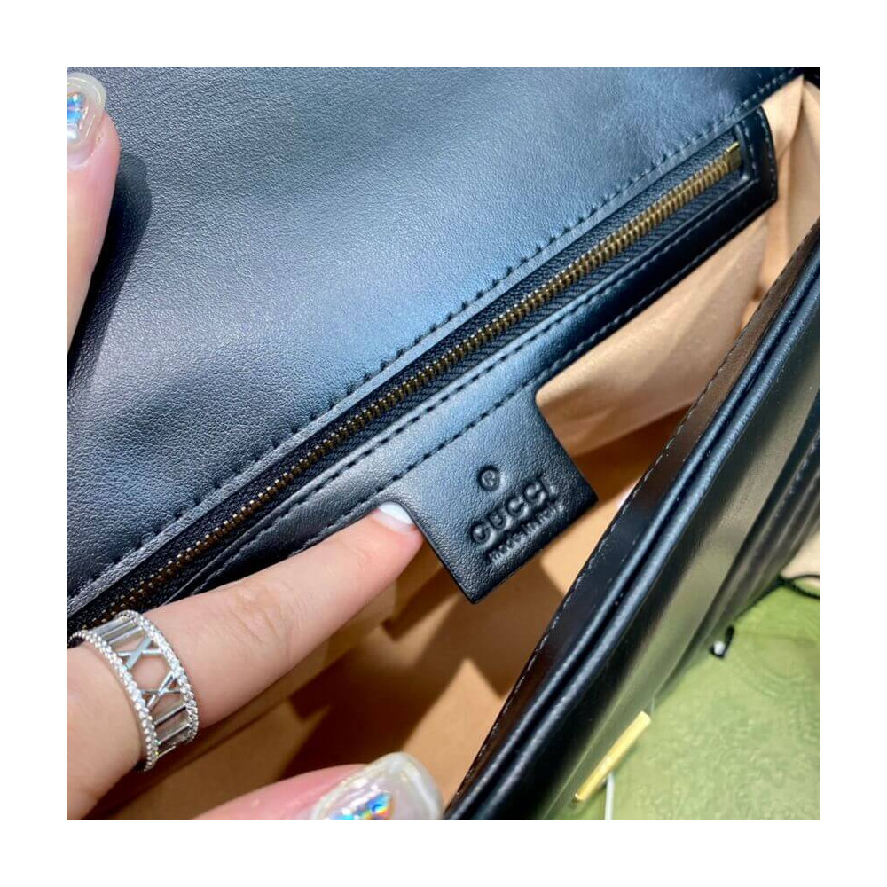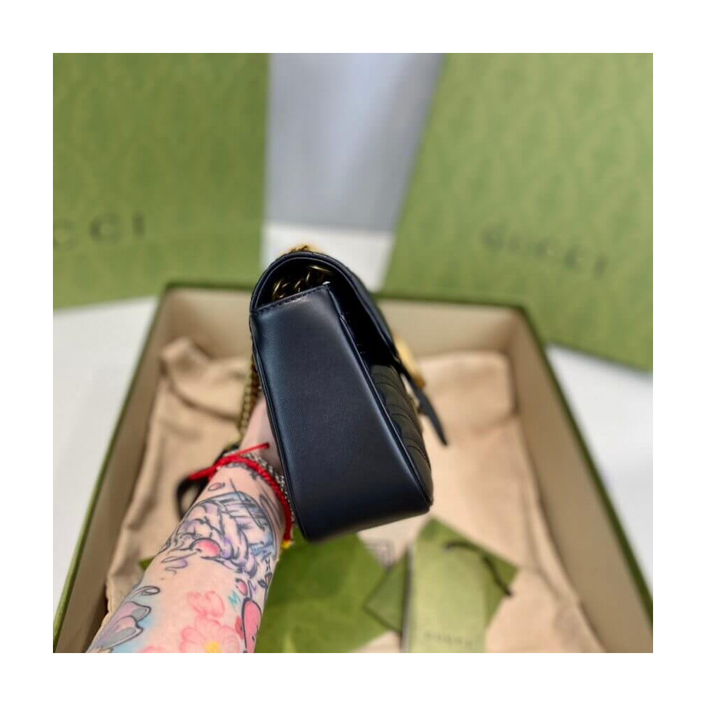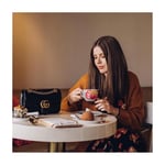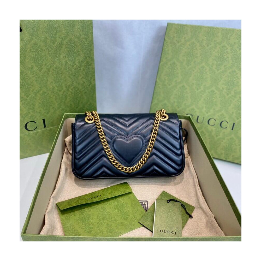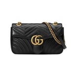 The small GG Marmont chain shoulder bag has a softly structured shape and an oversized flap closure with Double G hardware. The sliding chain strap can be worn multiple ways, changing between a shoulder and a top handle bag. Made in matelassé chevron leather with a heart on the back.