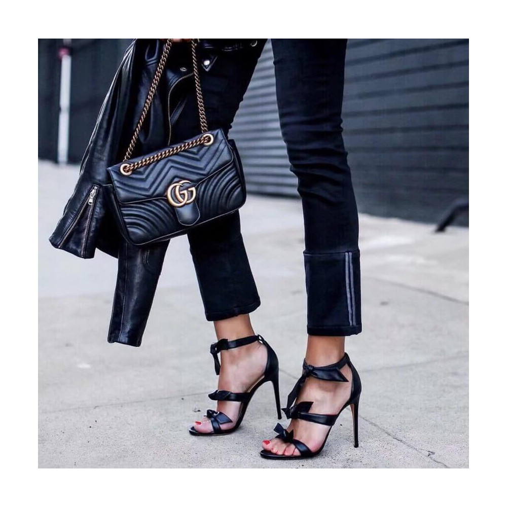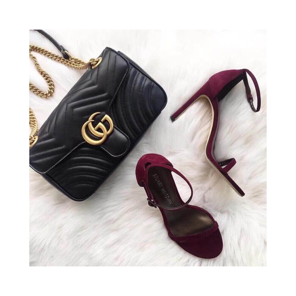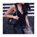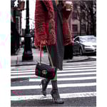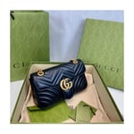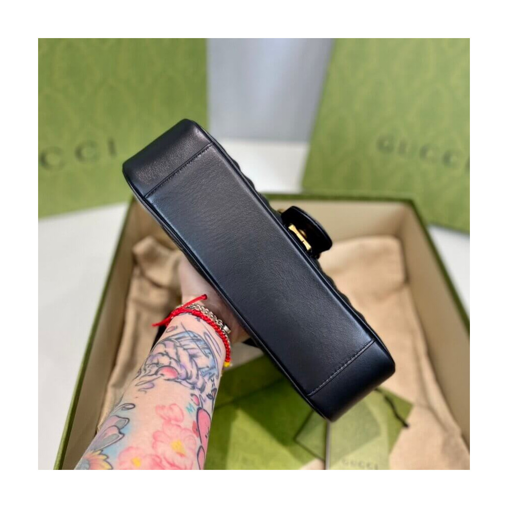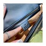 The small GG Marmont chain shoulder bag has a softly structured shape and an oversized flap closure with Double G hardware. The sliding chain strap can be worn multiple ways, changing between a shoulder and a top handle bag. Made in matelassé chevron leather with a heart on the back.