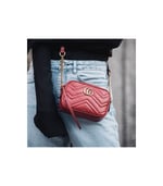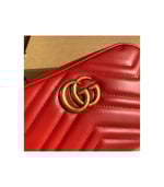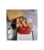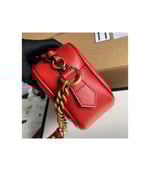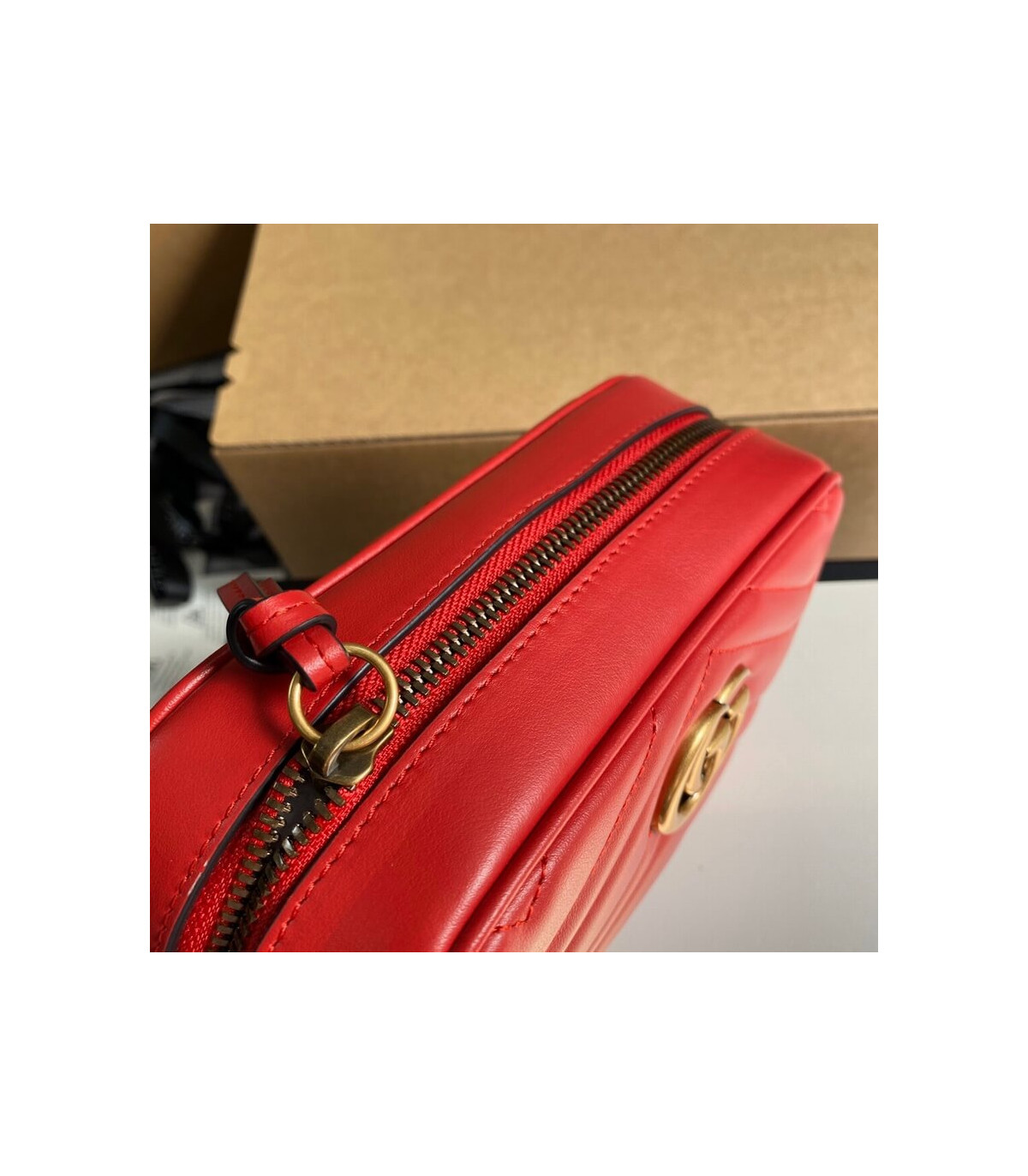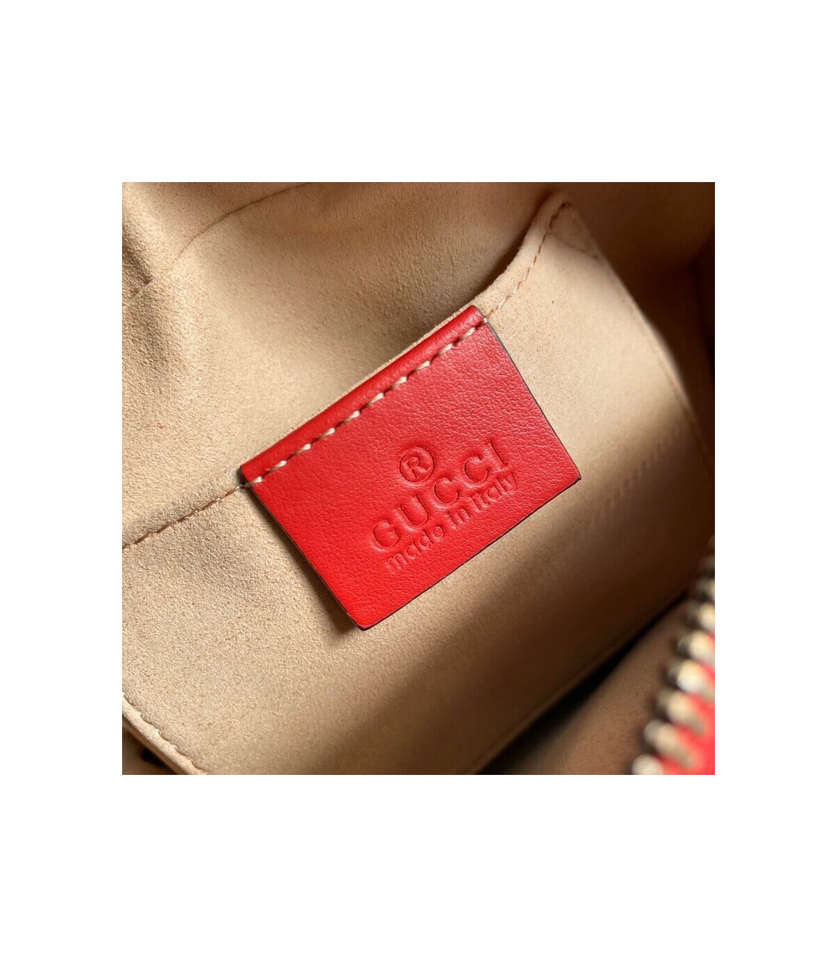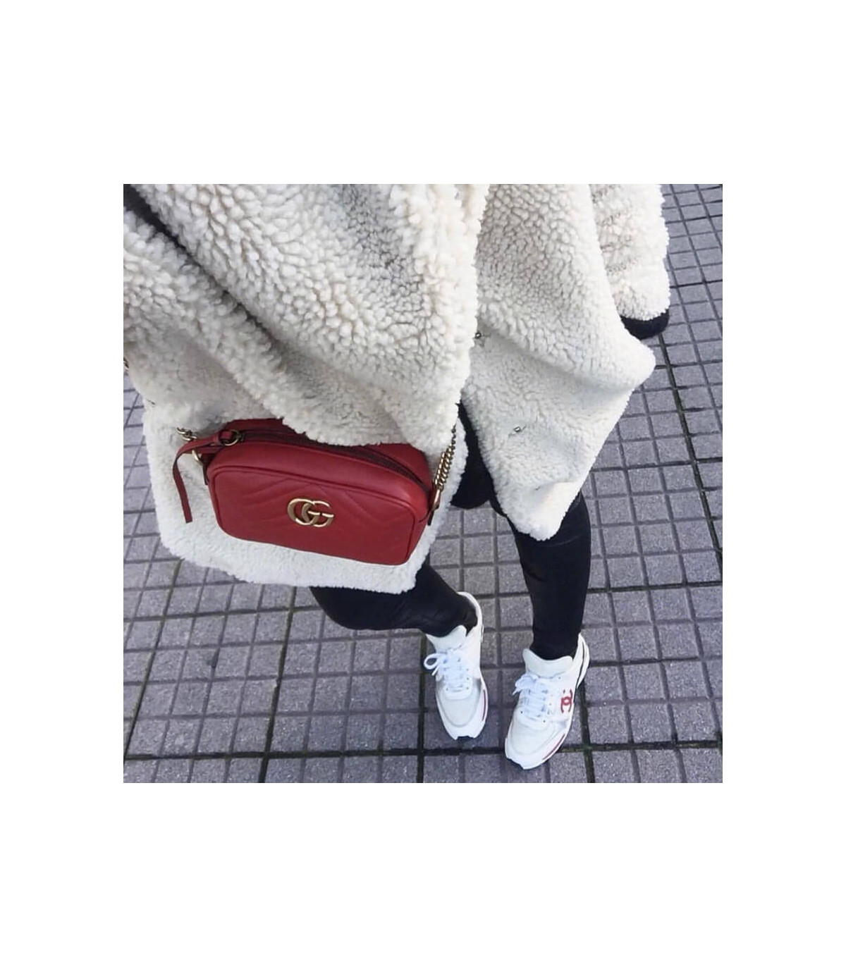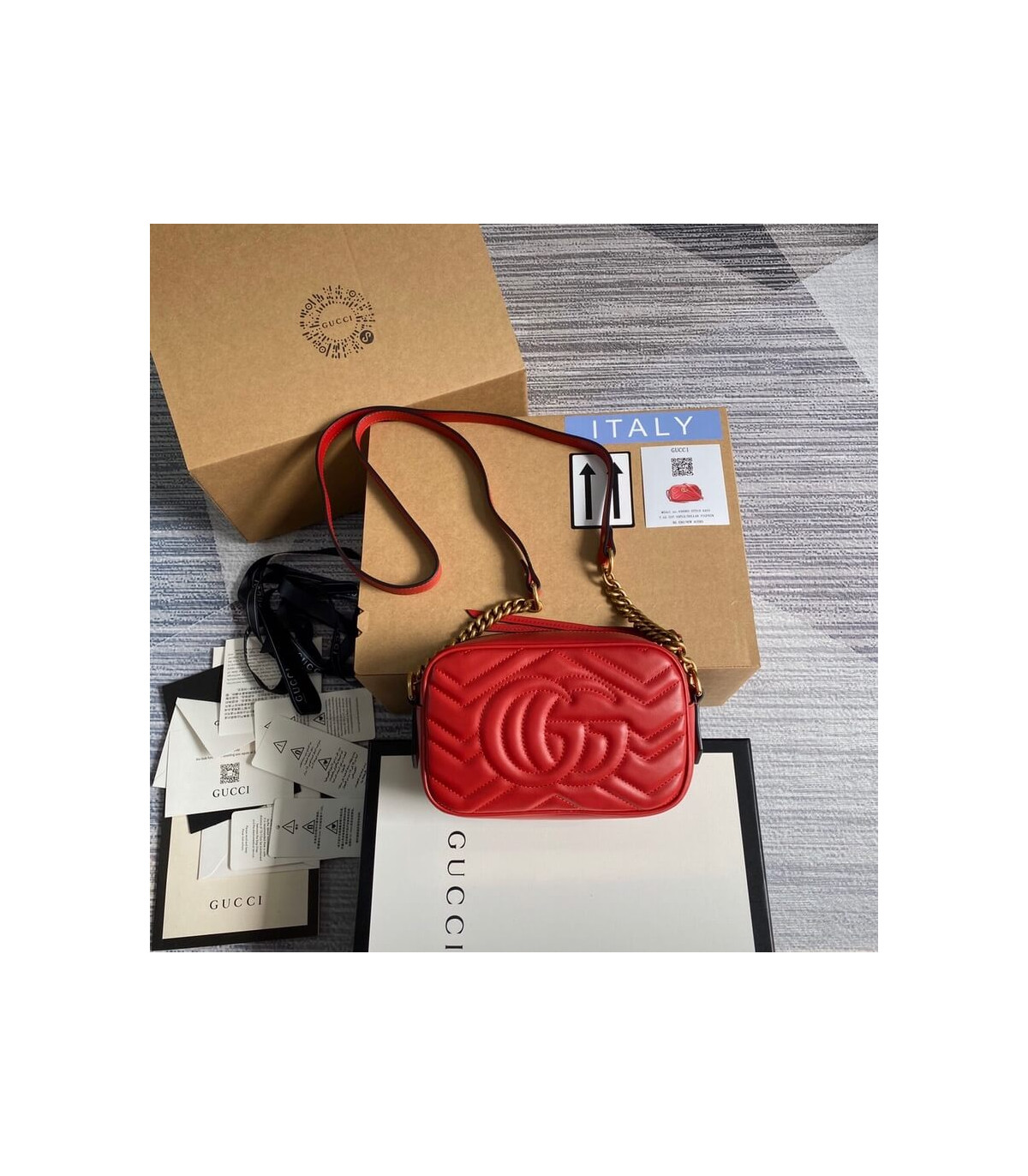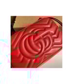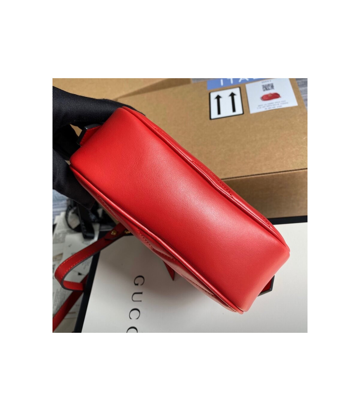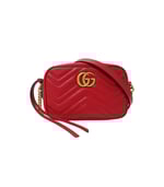 The mini GG Marmont chain shoulder bag has a softly structured shape and a zip top closure with Double G hardware. The chain shoulder strap has a leather shoulder detail. Made in matelassé leather with a chevron design and GG on the back.
