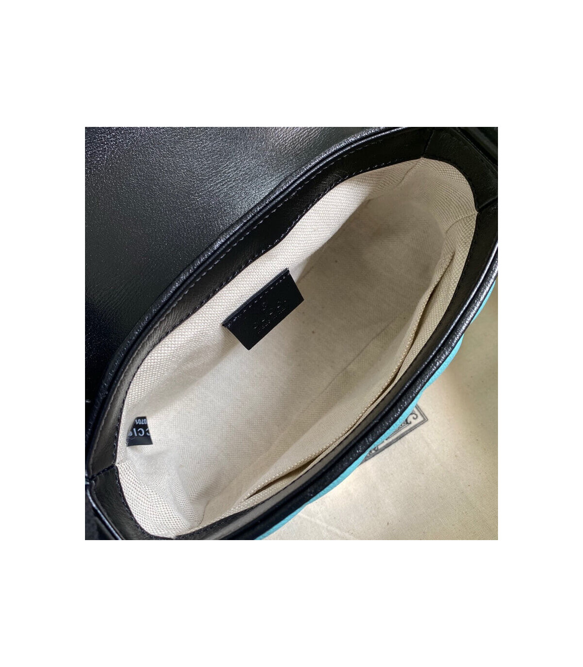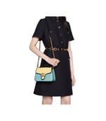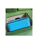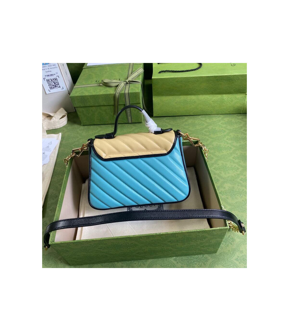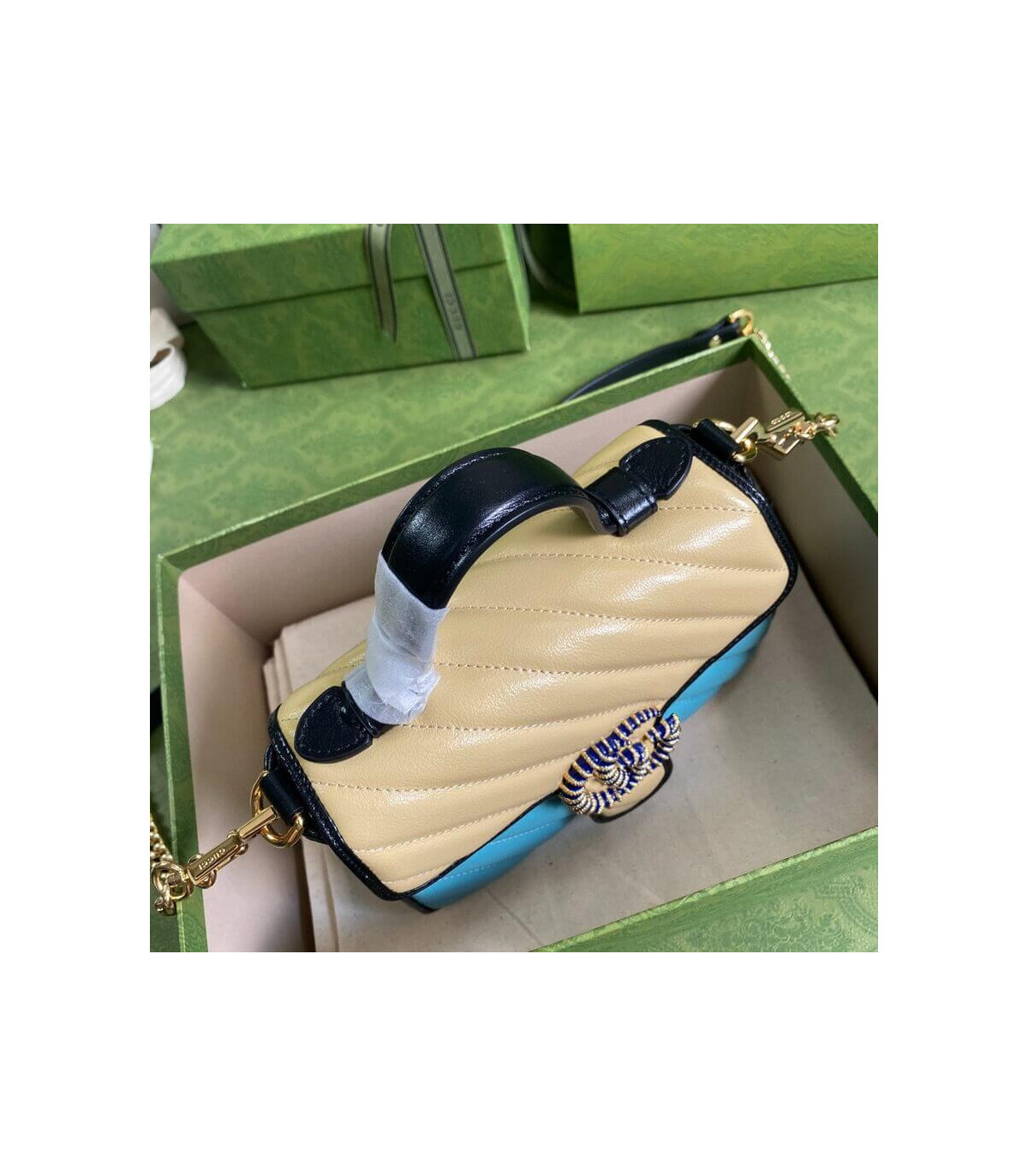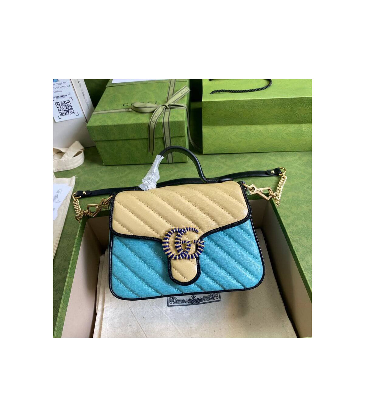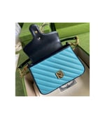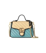 Soft shades appear throughout the latest collections, adding a whimsical feel. The GG Marmont bag is presented in diagonal matelassé quilted leather in soft shades of butter and blue. The mini top handle’s distinct softly structured shape is outlined in black piping, highlighting its flap closure.