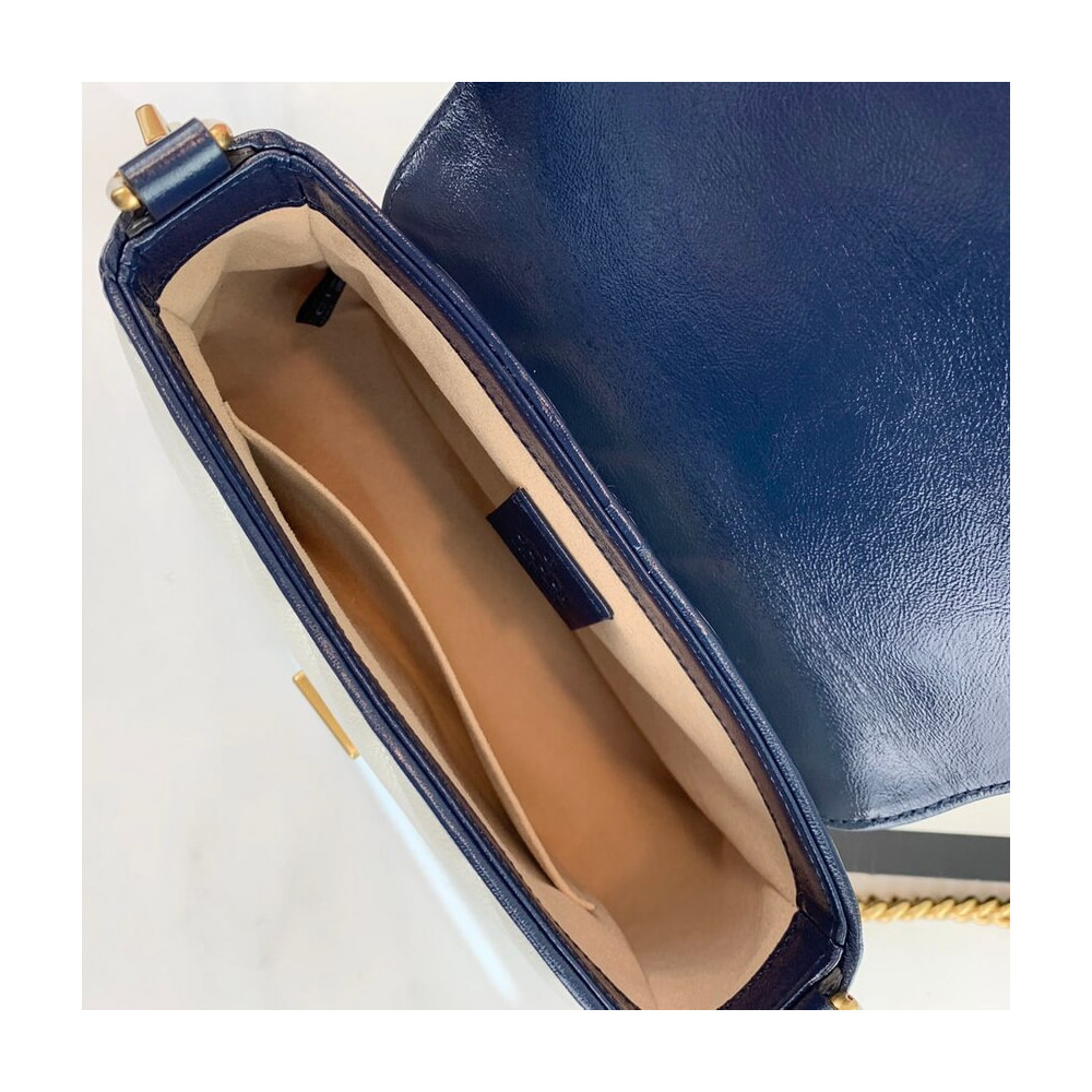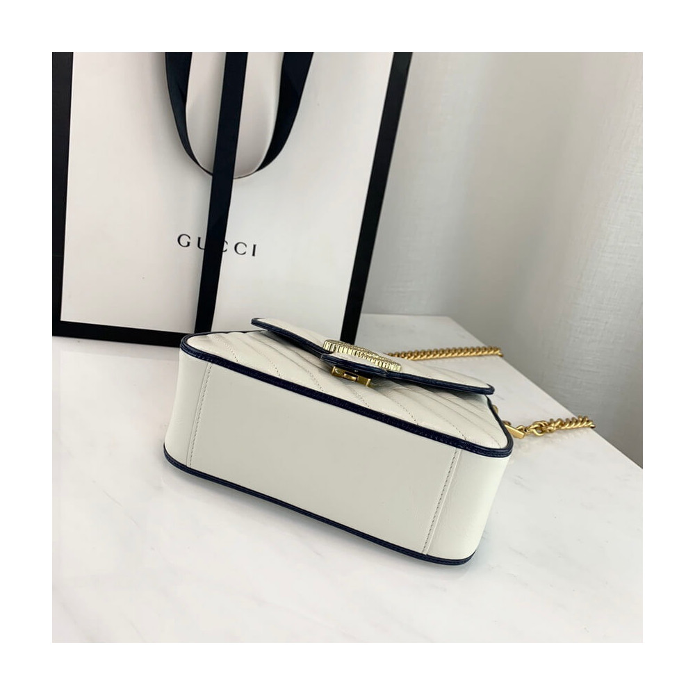 The GG Marmont bag introduced in blue for Cruise 2020, made from diagonal matelassé quilted leather and completed with a twisted torchon Double G embellishment. The mini top handle’s distinct softly structured shape is outlined in contrast white piping, highlighting its oversized flap closure. A removable chain strap allows the satchel shape to also be worn as a shoulder bag.