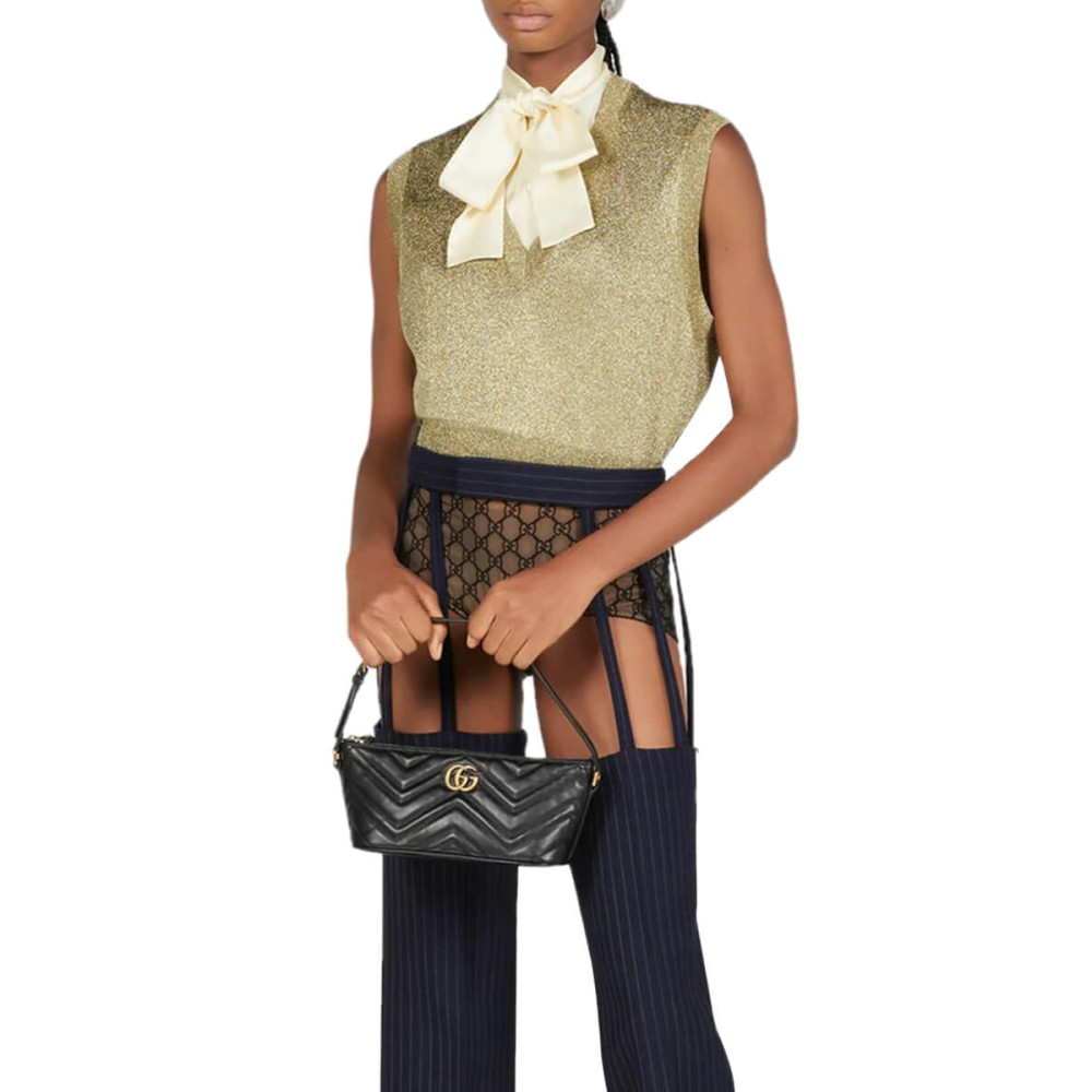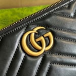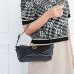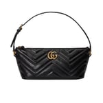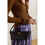 With its recognizable matelassé fabric and Double G hardware, the GG Marmont has become synonymous with the House. Continuously reinvented through the seasons, new shapes are introduced within this signature line, matching Gucci’s contemporary vision. Presented here in black leather, it’s further enriched with antique gold-toned details.