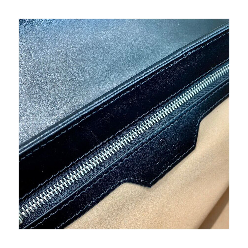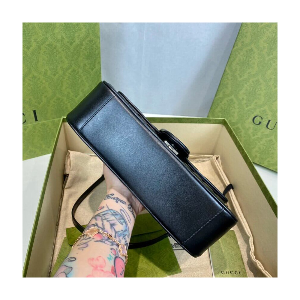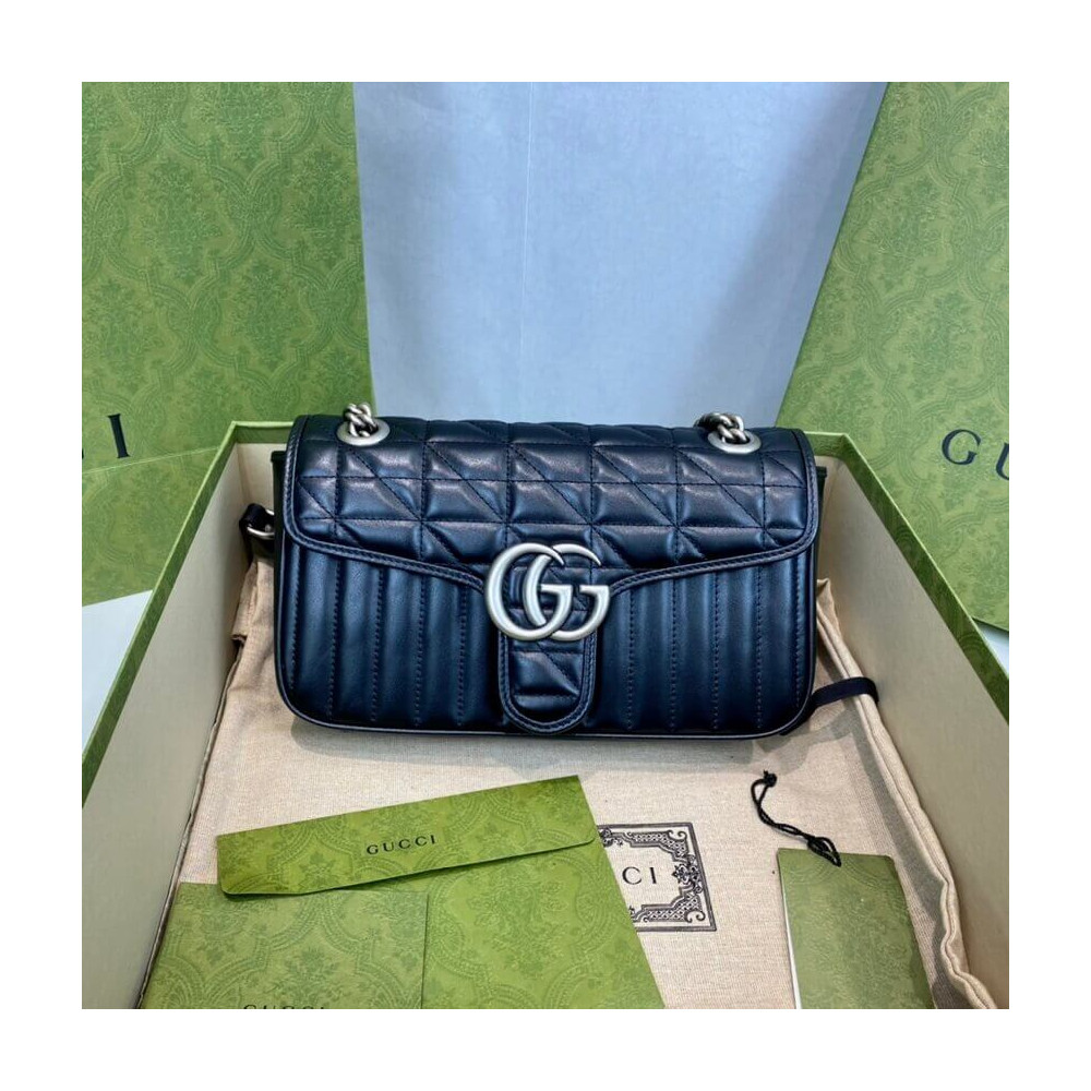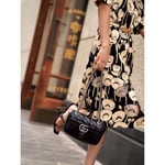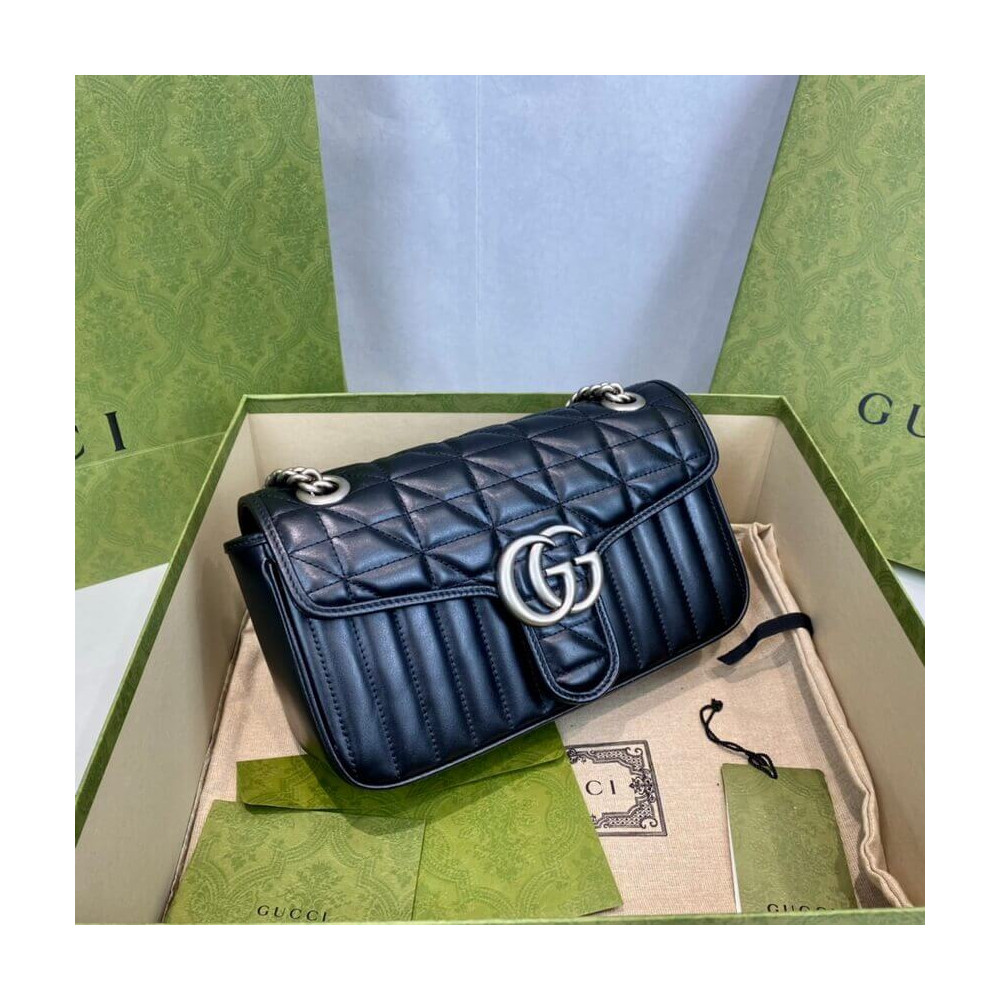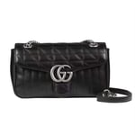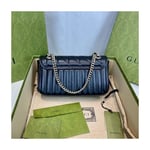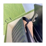 The Gucci Aria collection is an exploration of the House’s most emblematic codes and symbols. A member of the Beloved family, the GG Marmont is synonymous with its matelassé leather and monogram hardware. Here, the small shoulder bag is reimagined with a new geometric take on its signature finish that combines vertical and diagonal motifs.