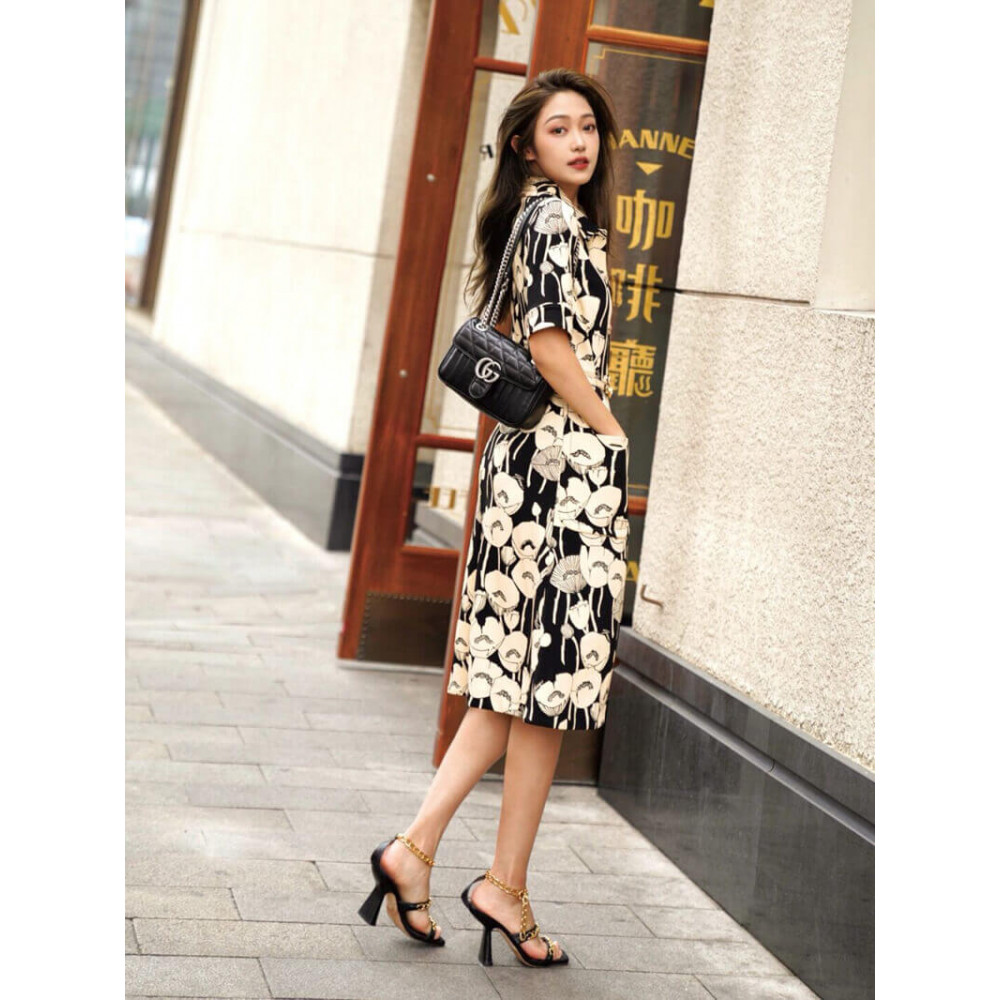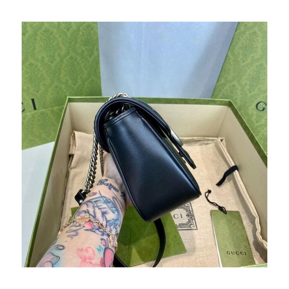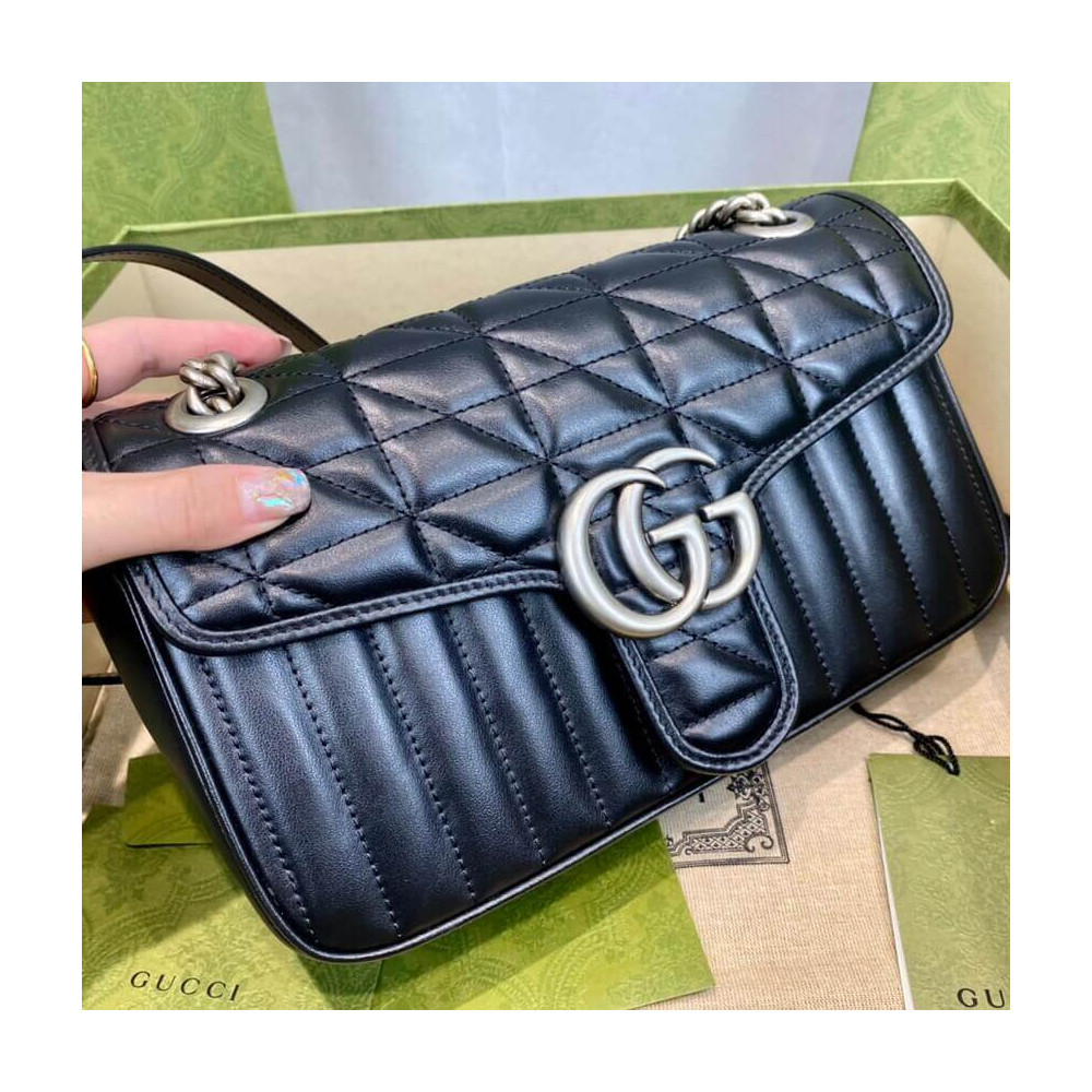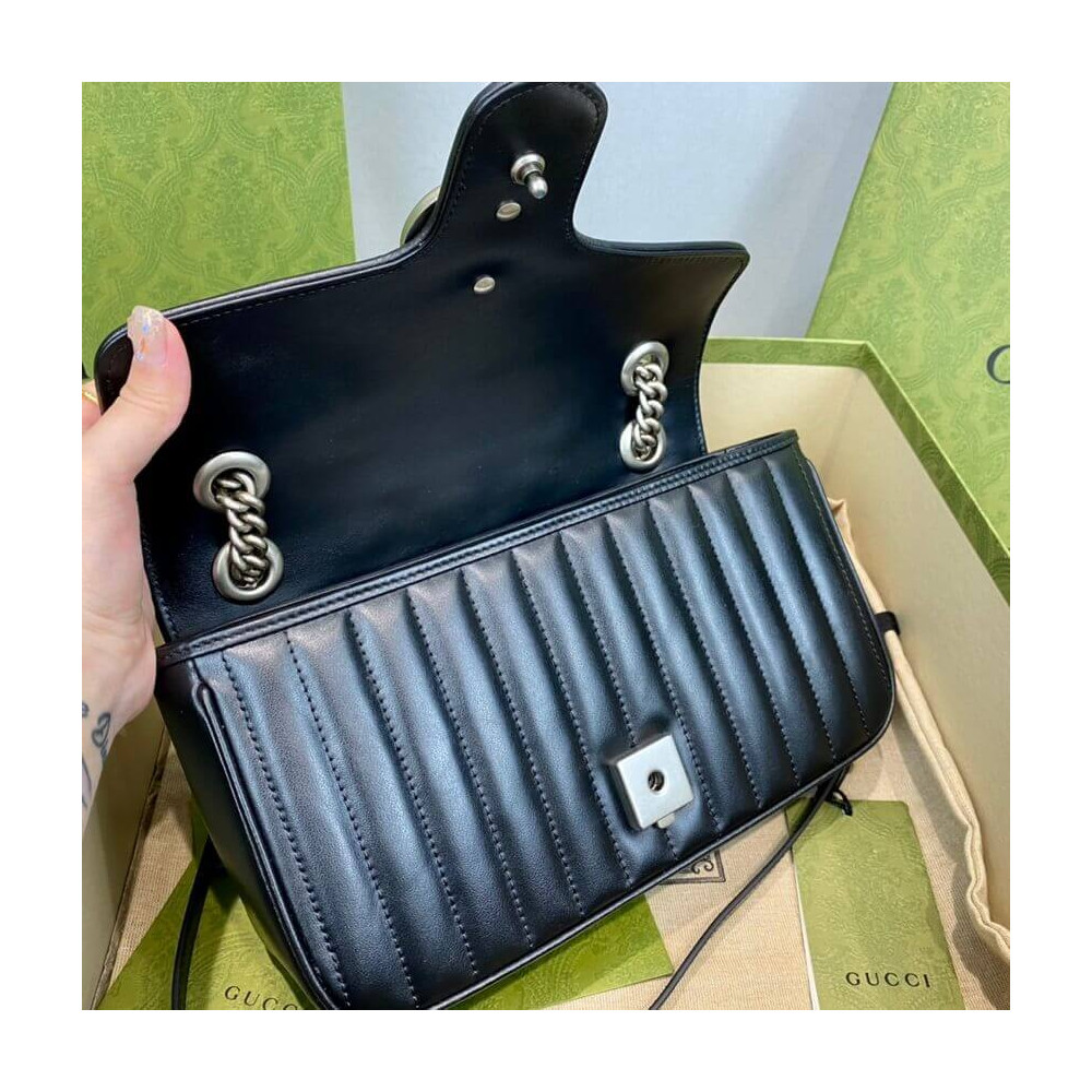 The Gucci Aria collection is an exploration of the House’s most emblematic codes and symbols. A member of the Beloved family, the GG Marmont is synonymous with its matelassé leather and monogram hardware. Here, the small shoulder bag is reimagined with a new geometric take on its signature finish that combines vertical and diagonal motifs.