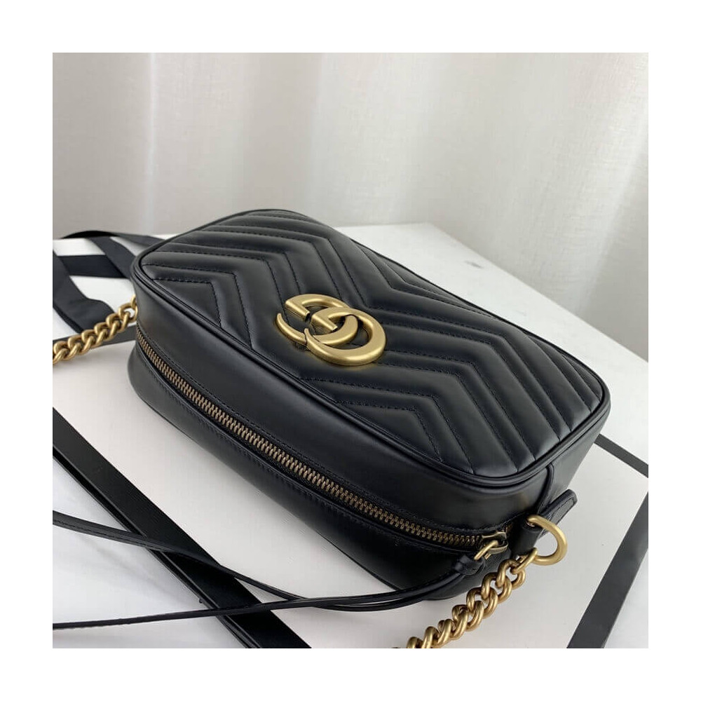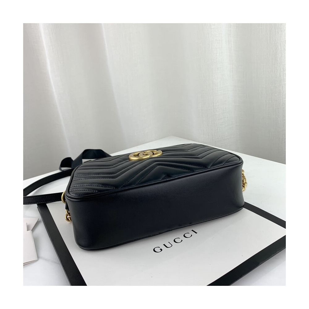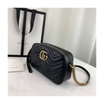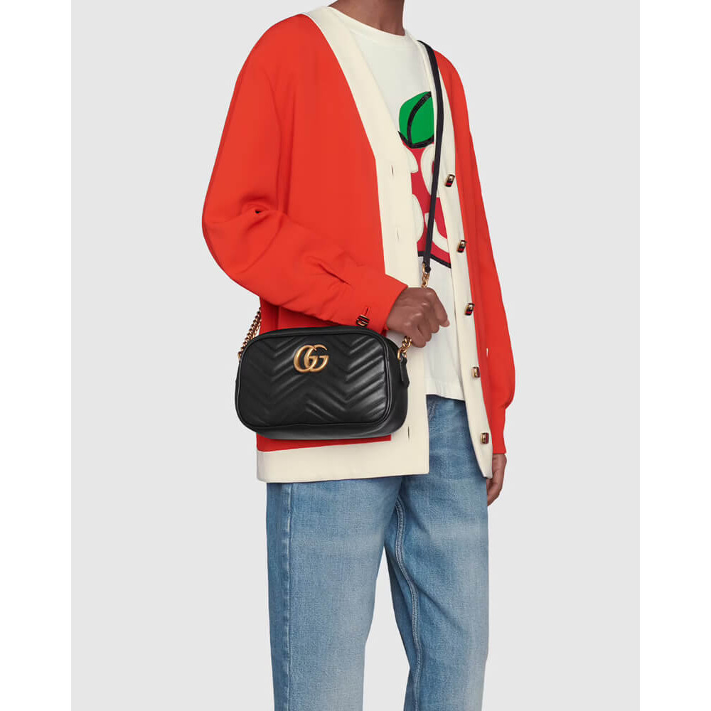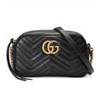The small GG Marmont chain shoulder bag has a softly structured shape and a zip top closure with the Double G hardware. The chain shoulder strap has a leather shoulder detail. Made in matelassé leather with a chevron design and GG on the back.