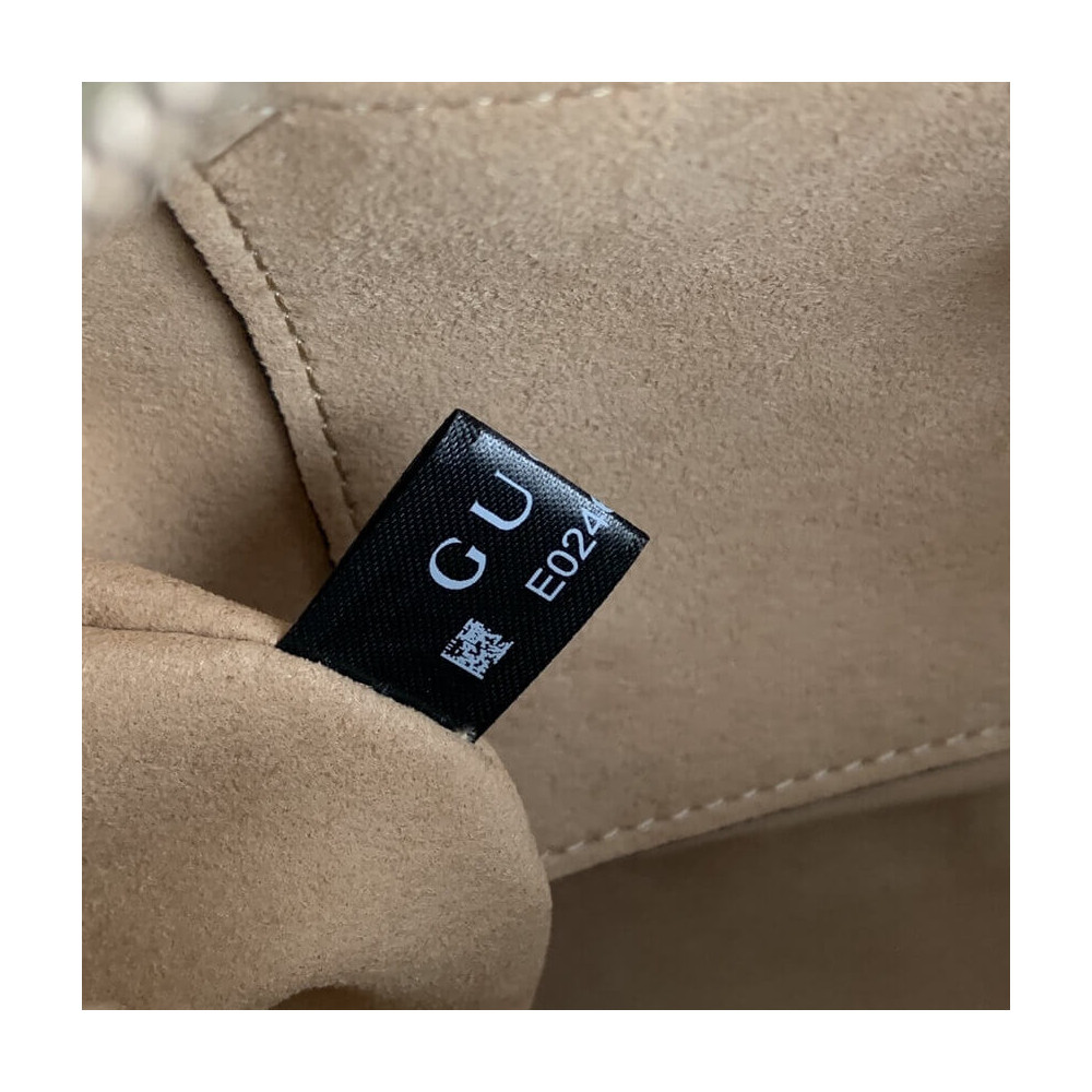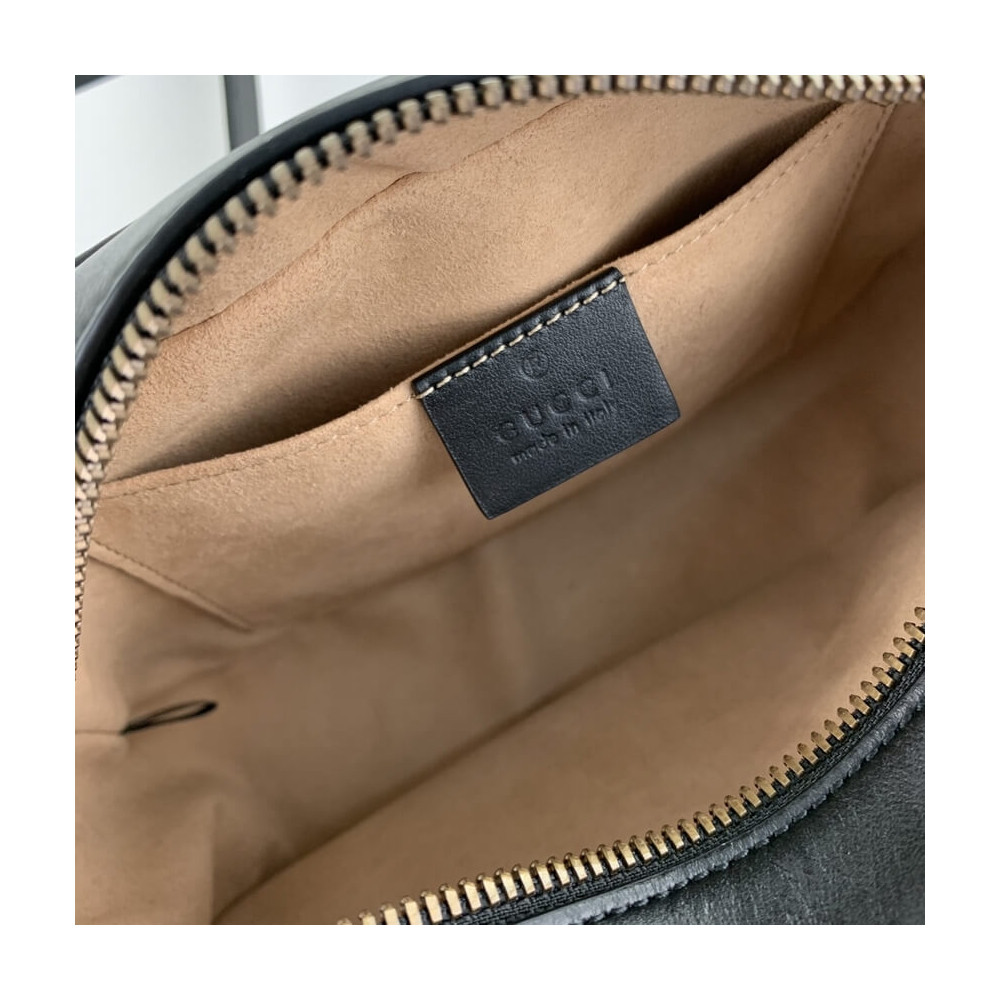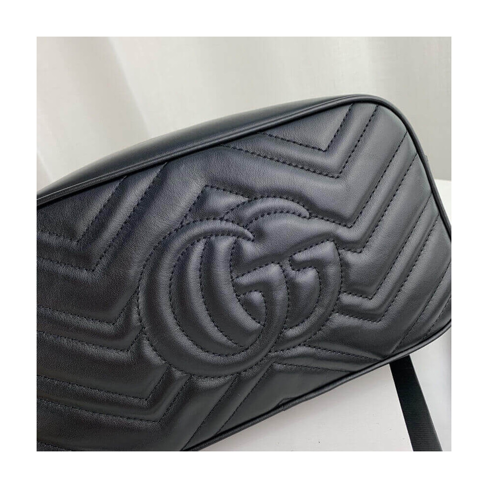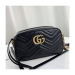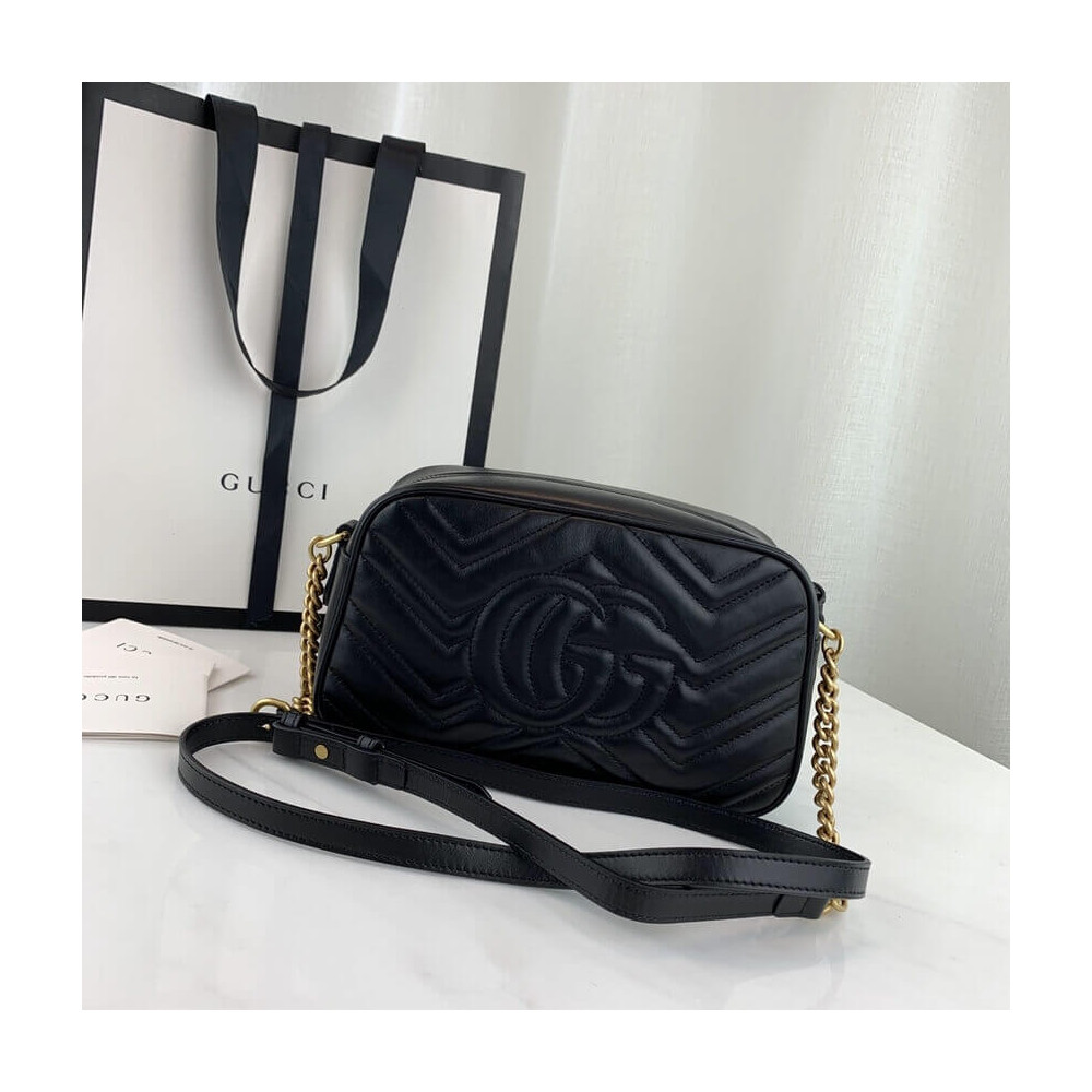 The small GG Marmont chain shoulder bag has a softly structured shape and a zip top closure with the Double G hardware. The chain shoulder strap has a leather shoulder detail. Made in matelassé leather with a chevron design and GG on the back.
