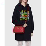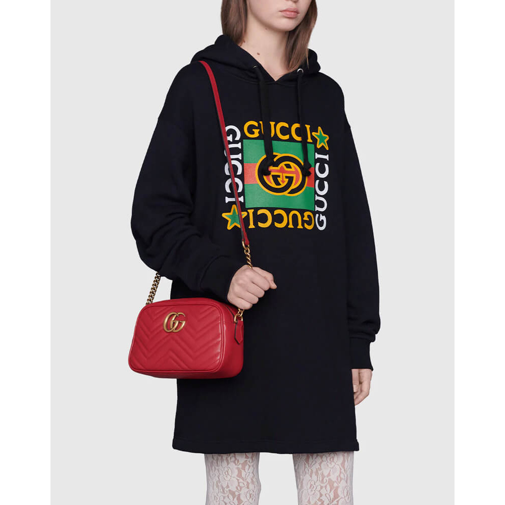 The small GG Marmont chain shoulder bag has a softly structured shape and a zip top closure with the Double G hardware. The chain shoulder strap has a leather shoulder detail. Made in matelassé leather with a chevron design and GG on the back.