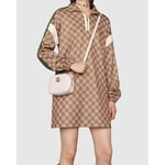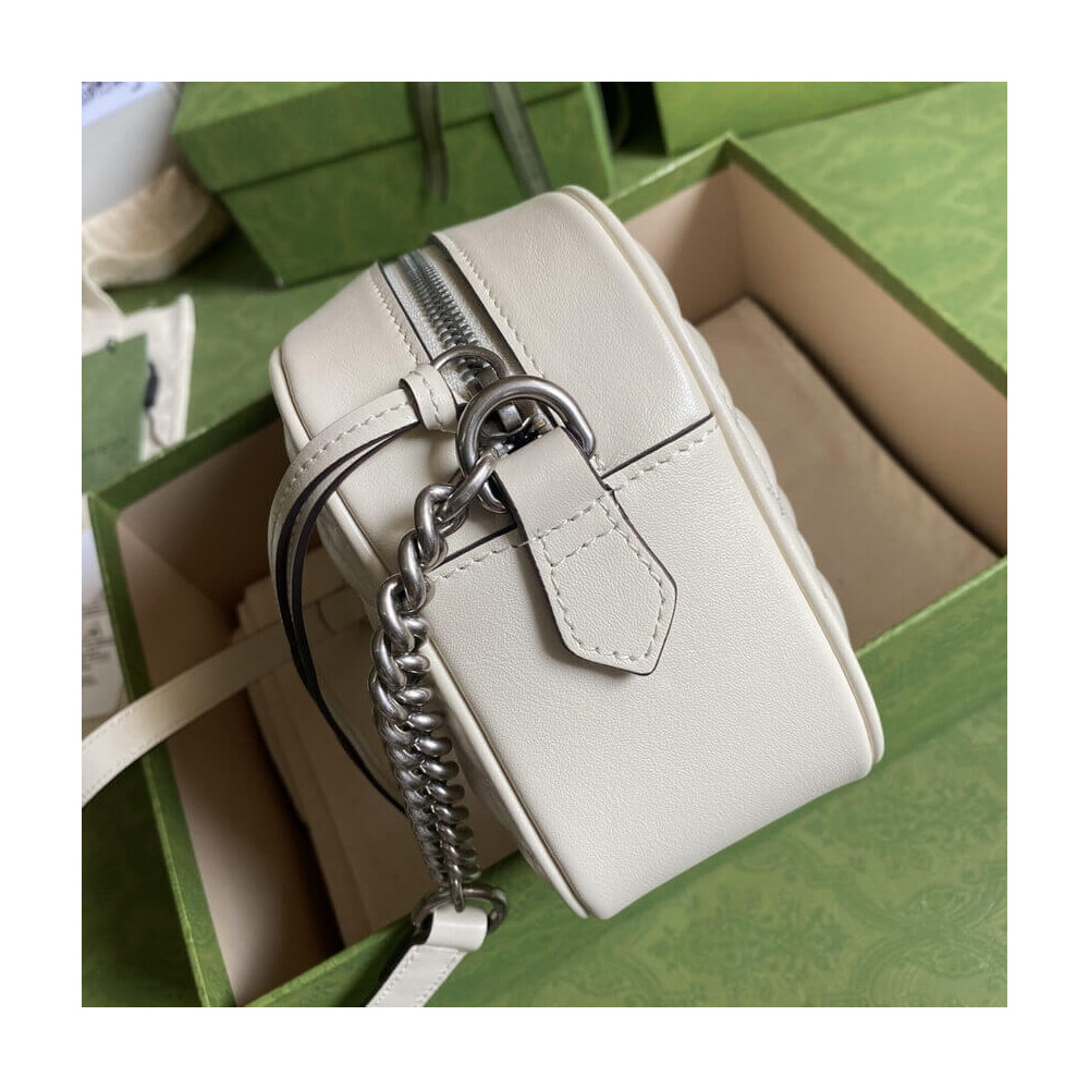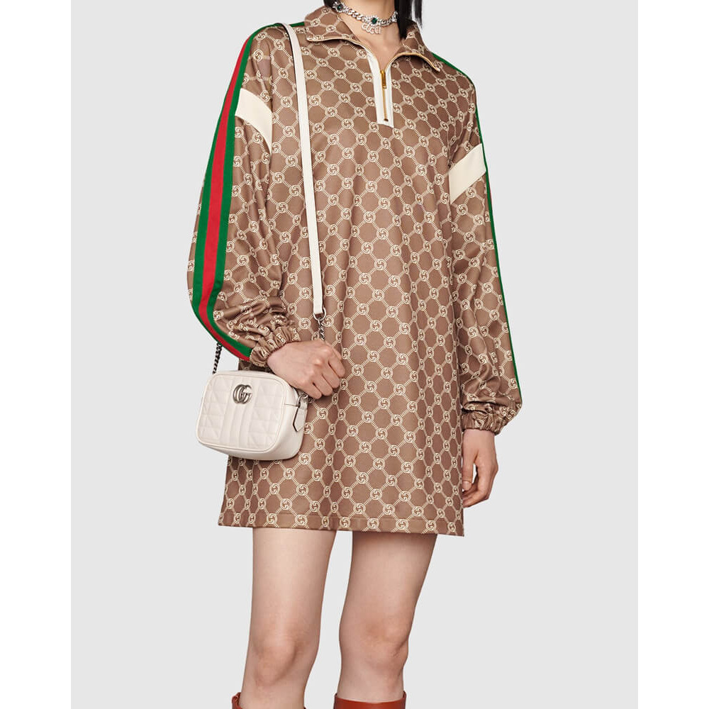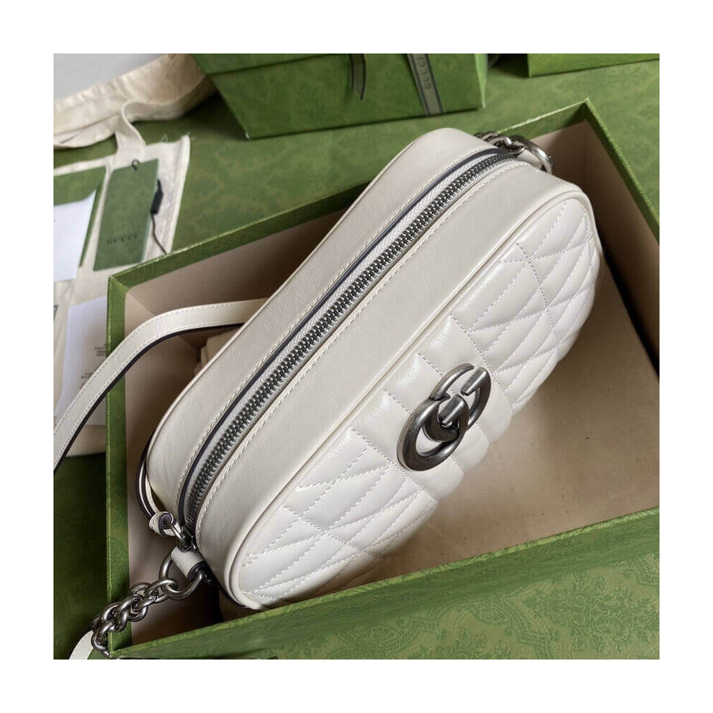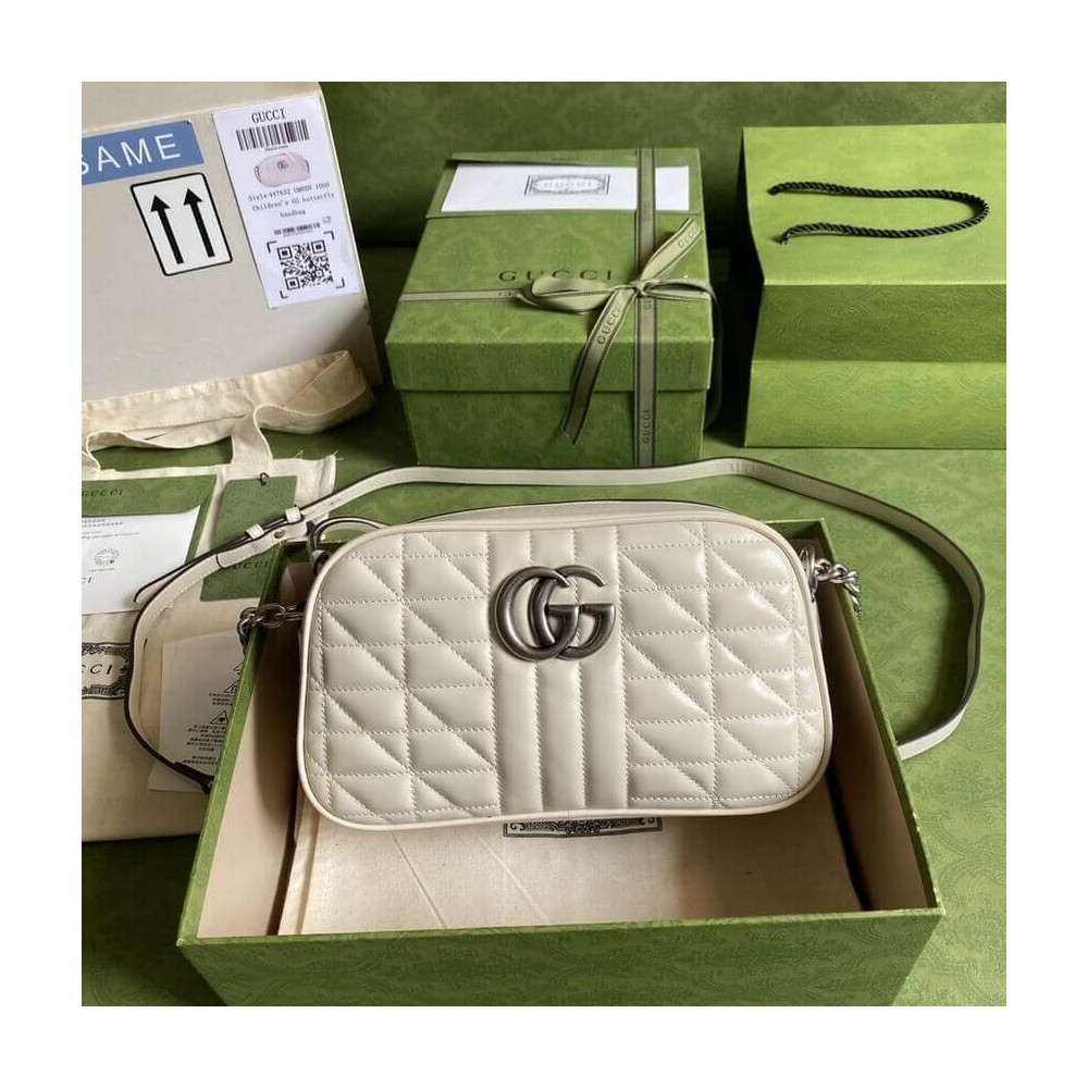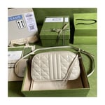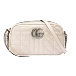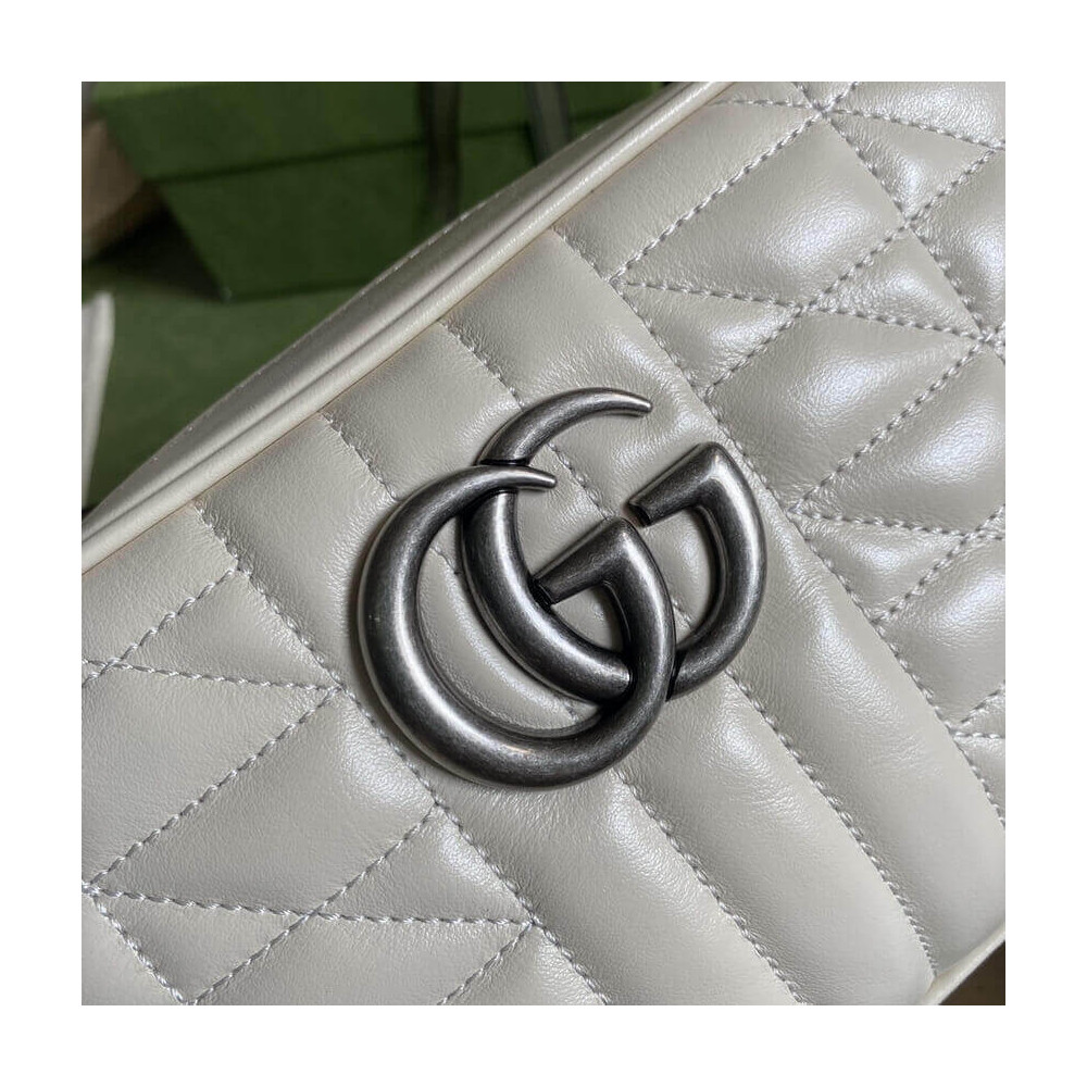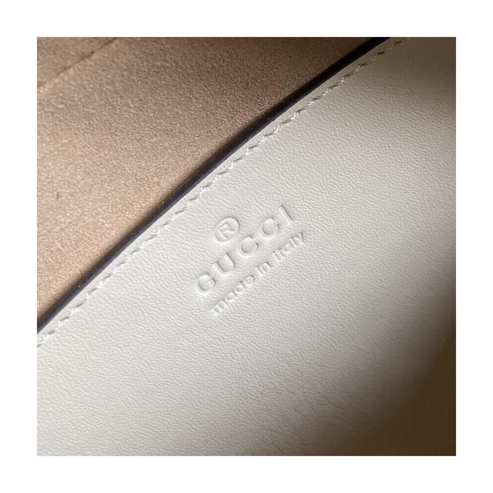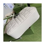 A member of the House’s Beloved lines, the GG Marmont is characterized by the brand’s emblematic monogram hardware and matelassé leather. For The Gucci Aria collection, the style is reimagined with a new geometric approach to the signature material while its Double G hardware is presented with an antique silver-toned finish. The design appears here in the shape of a small shoulder bag in black.