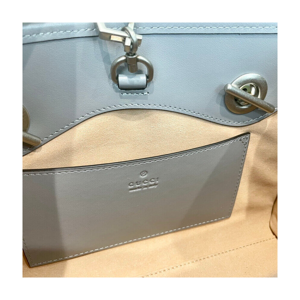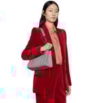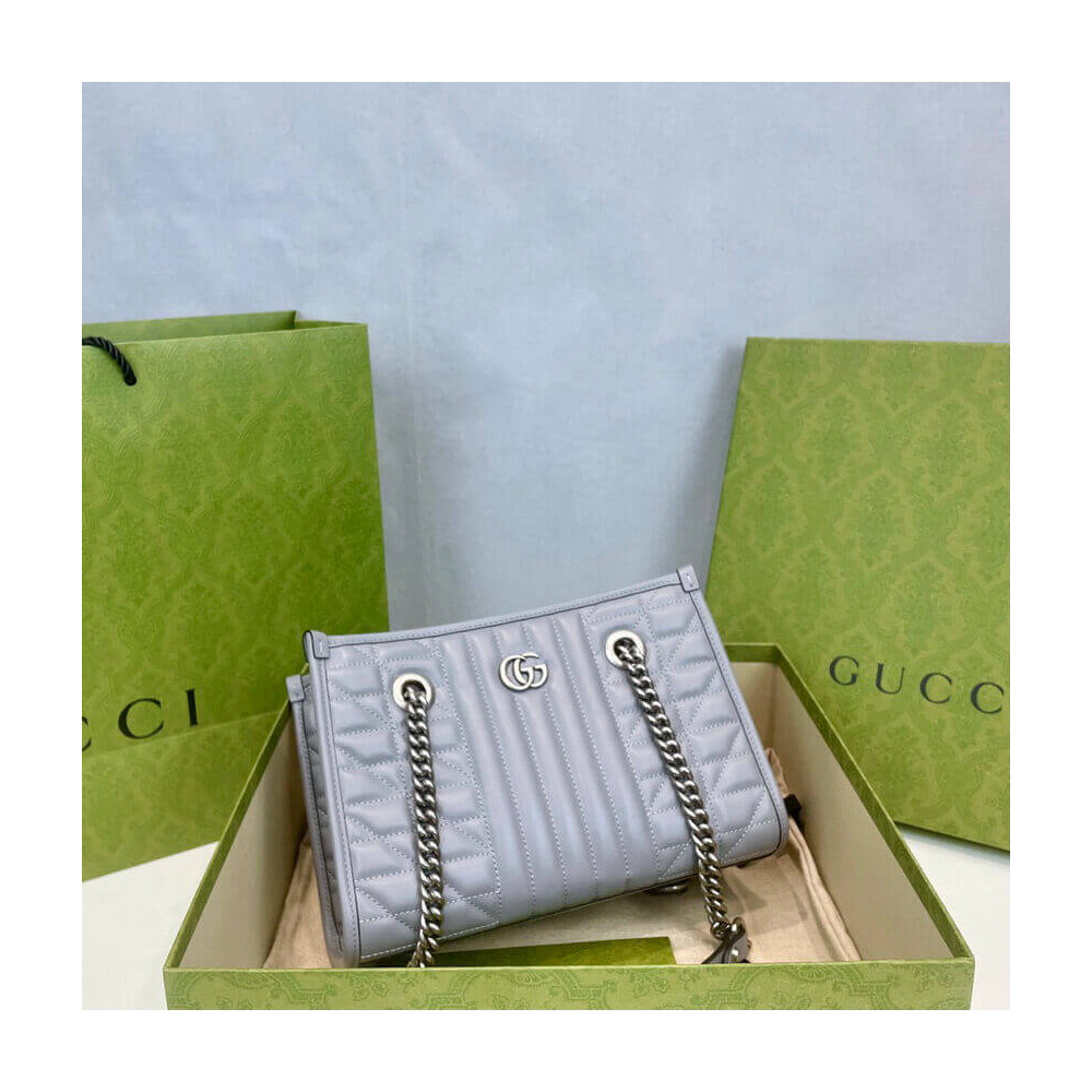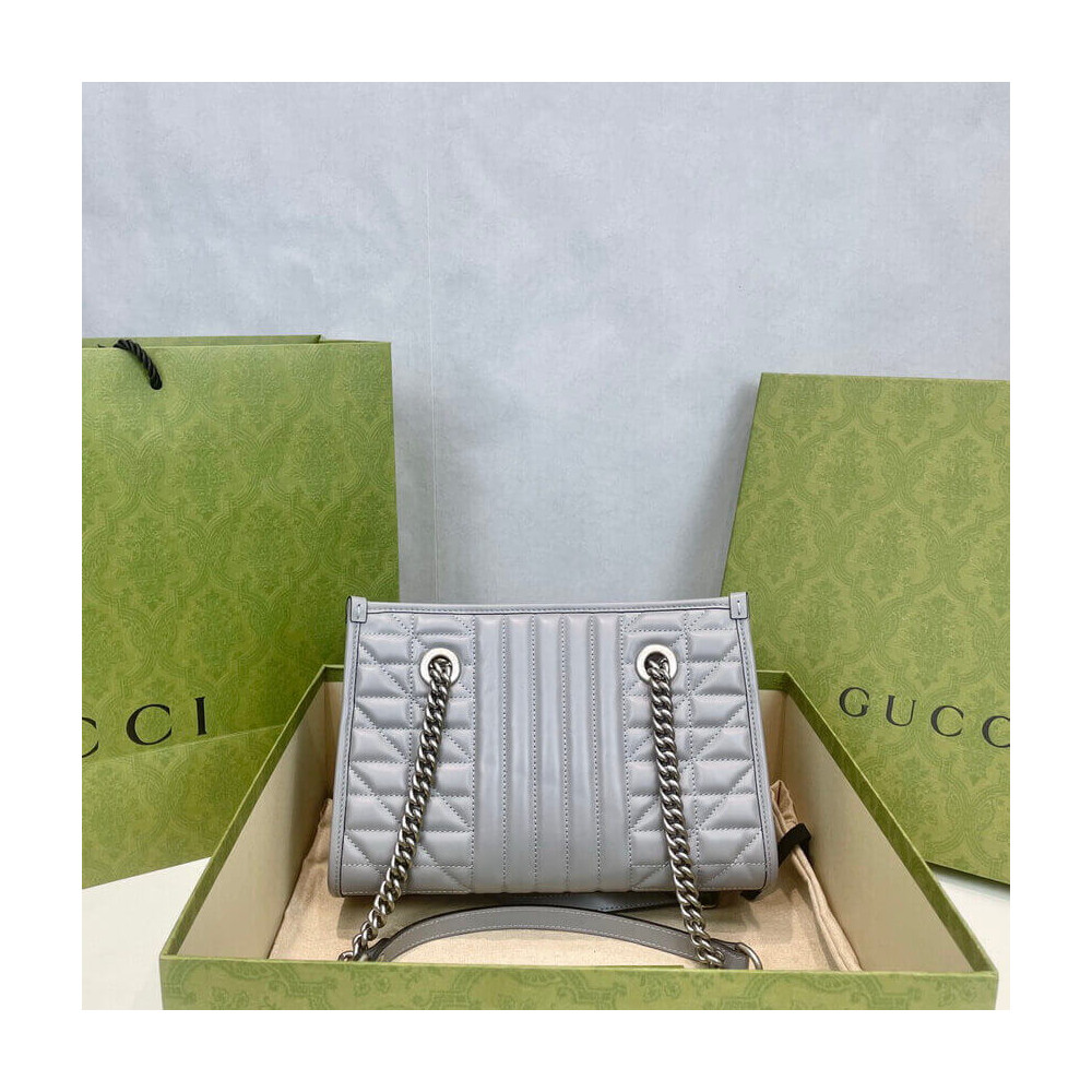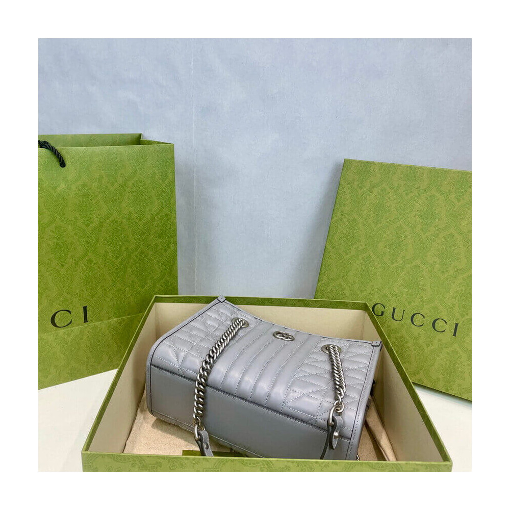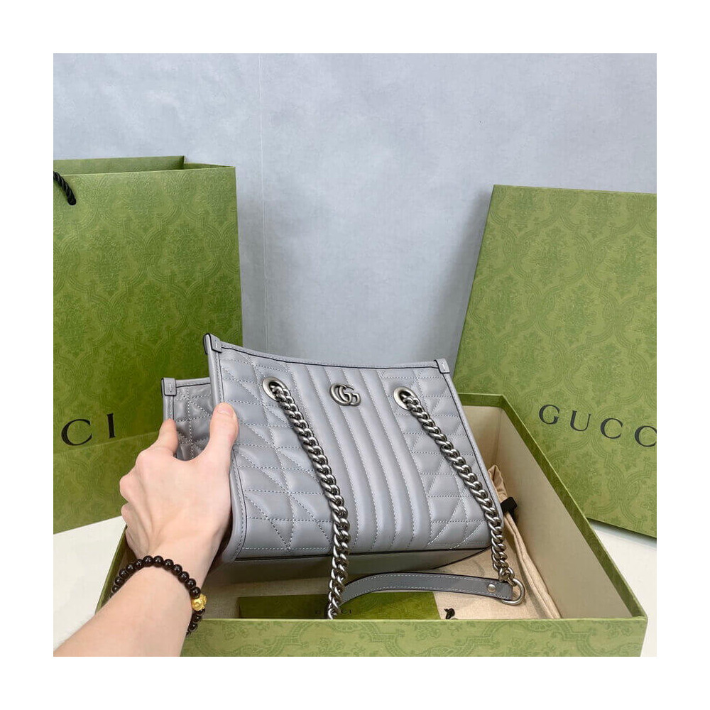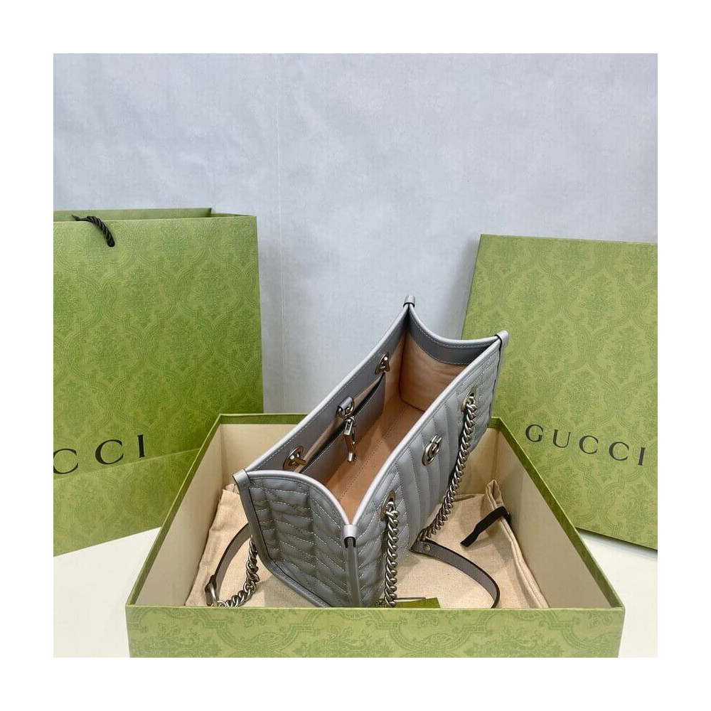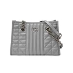 The GG Marmont collection is defined by the emblematic Double G hardware―a contemporary take on a Gucci archival belt buckle from the ’70s that has become a hallmark of the House. Here, the design is reinterpreted as antiqued silver-toned hardware atop this small tote bag in soft white matelassé leather.