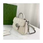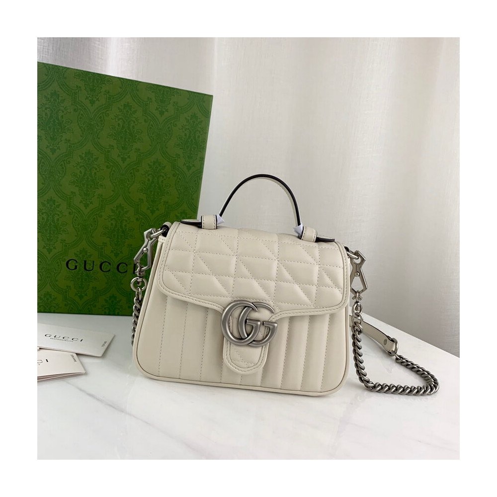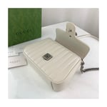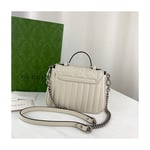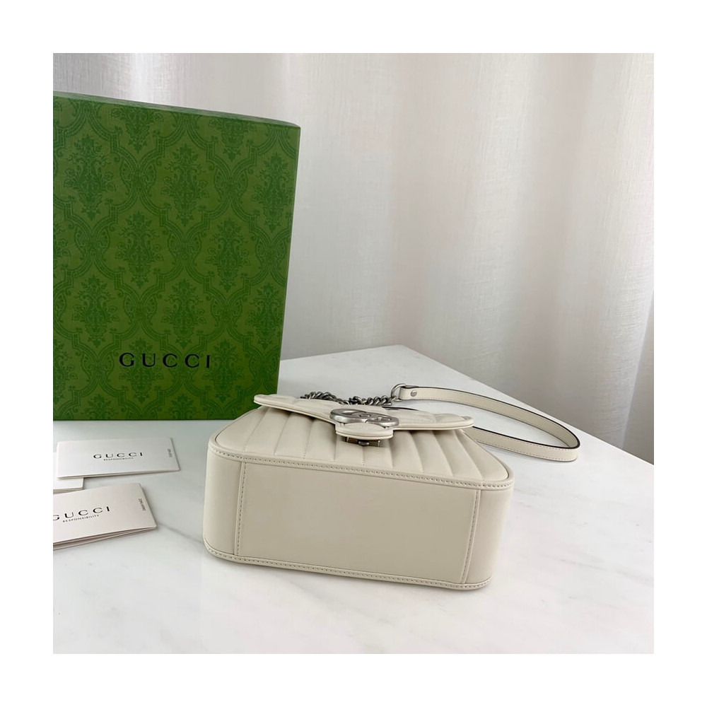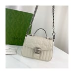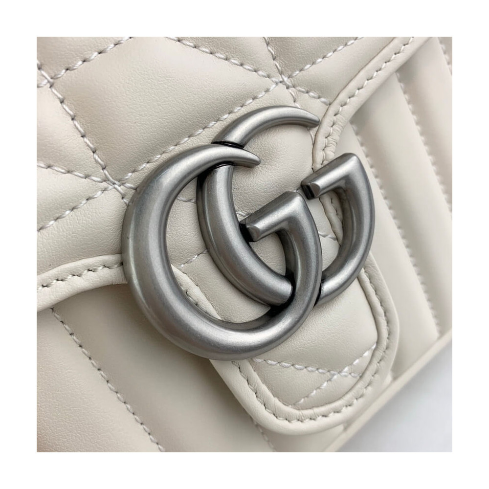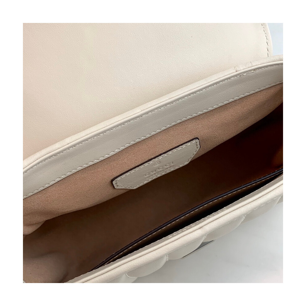 Gucci Aria explores the House’s archives, telling Gucci’s story though a mix of archival and contemporary elements. The GG Marmont was introduced in one of the Creative Director’s first fashion shows and each season its design evolves through the lens of the latest collection. Here, the mini bag is presented in soft white matelassé leather with antique silver-toned hardware.