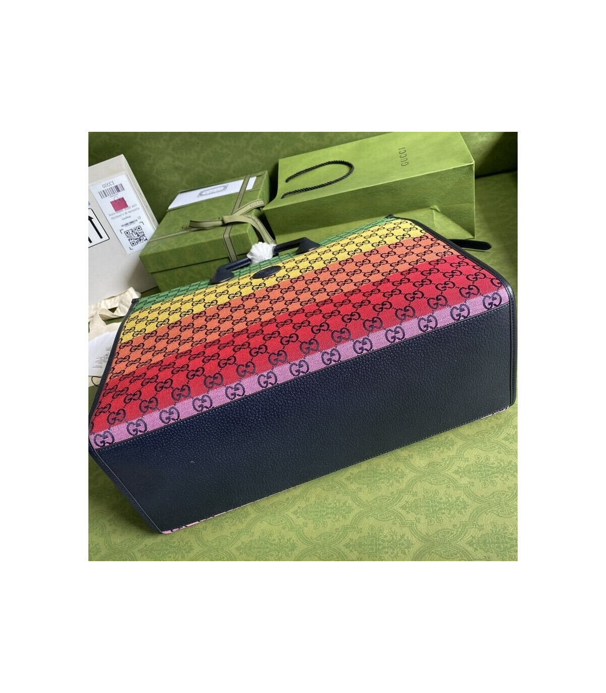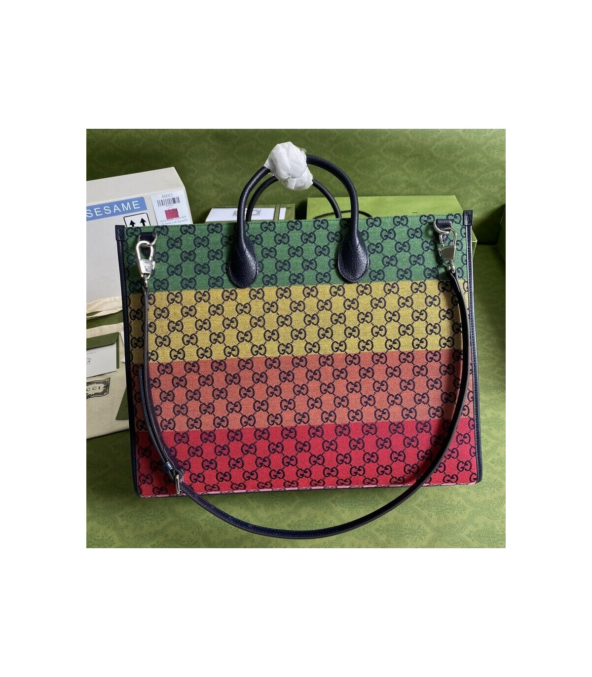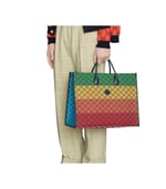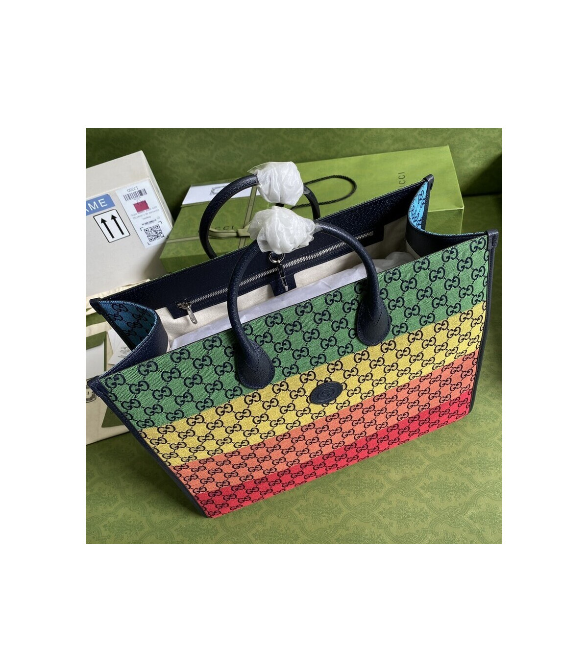 Embracing the new possibilities that lie within variations of the Gucci archives, various pieces throughout the collection provide a new lens through which to view the emblematic GG rhombi motif. Already an evolution of the House logo, it is once again reimagined in a series of bright colours―a theme that has become synonymous with the Creative Director’s vision. This large tote bag is part of the GG Multicolour collection.